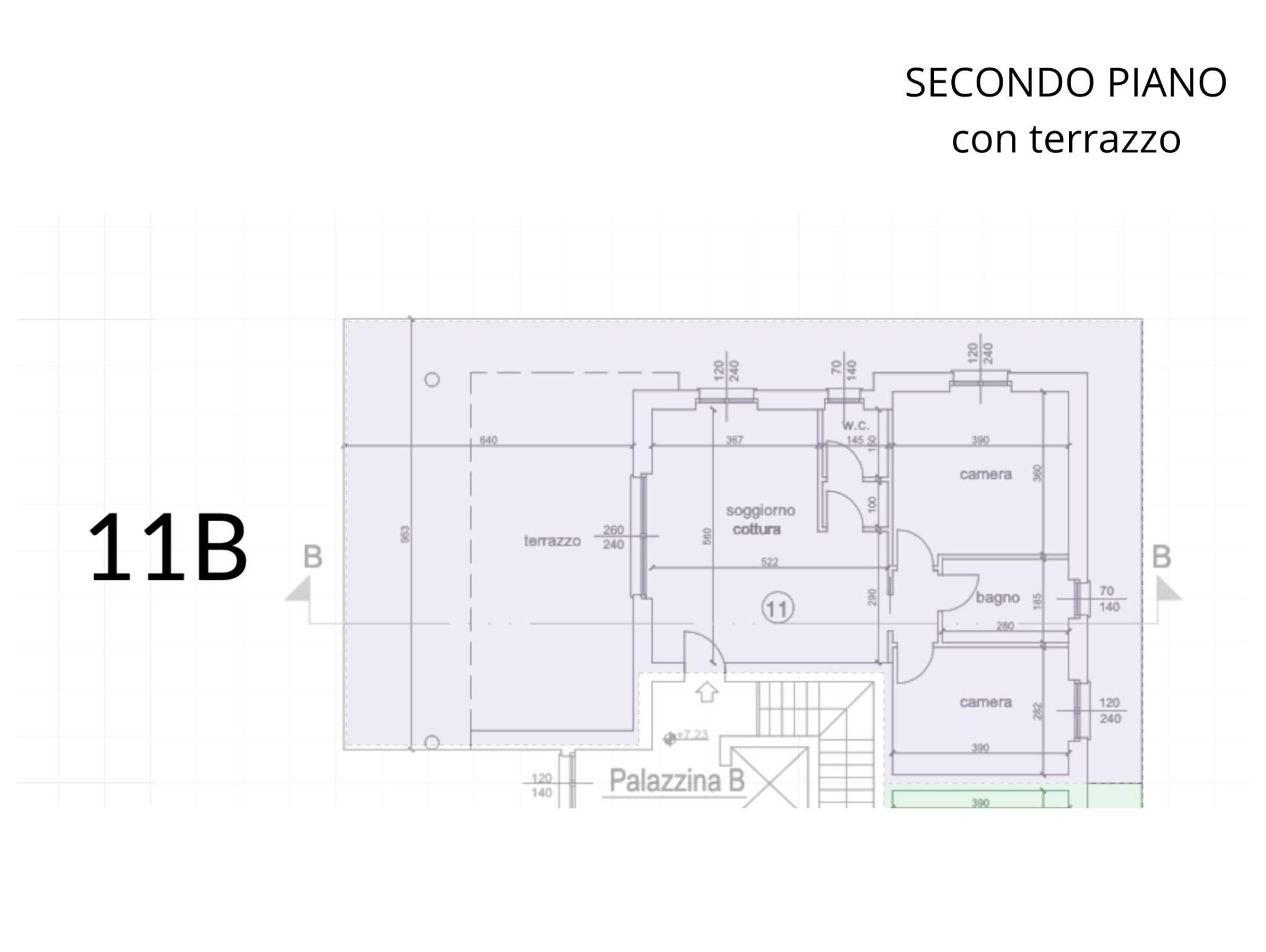 11B. TRILOCALE di 77,25 mq con doppi servizi, terrazzo di 61 mq e balcone di 26,53 mq. Box di 37,4 mq e cantina di 6,2 mq. Euro 408.802,28