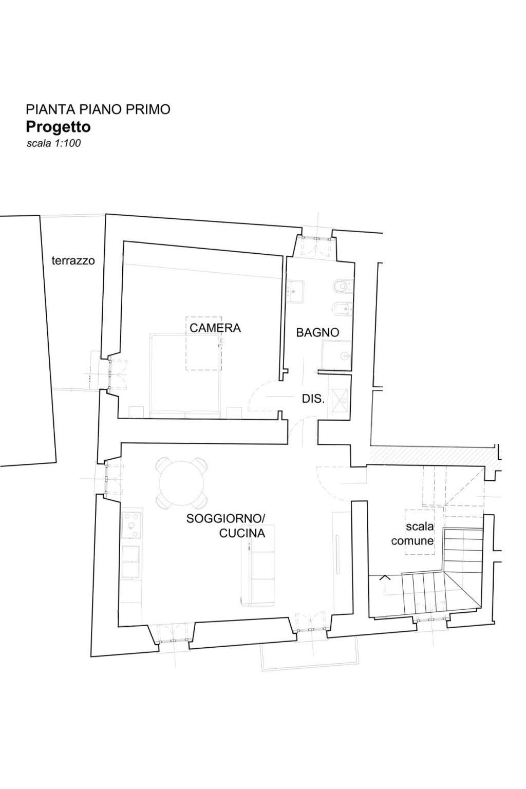 L'appartamento è così composto: l'ingresso si apre sul soggiorno/cucina esposto a sud e servito da balcone.
