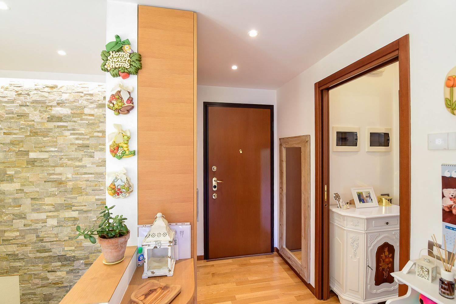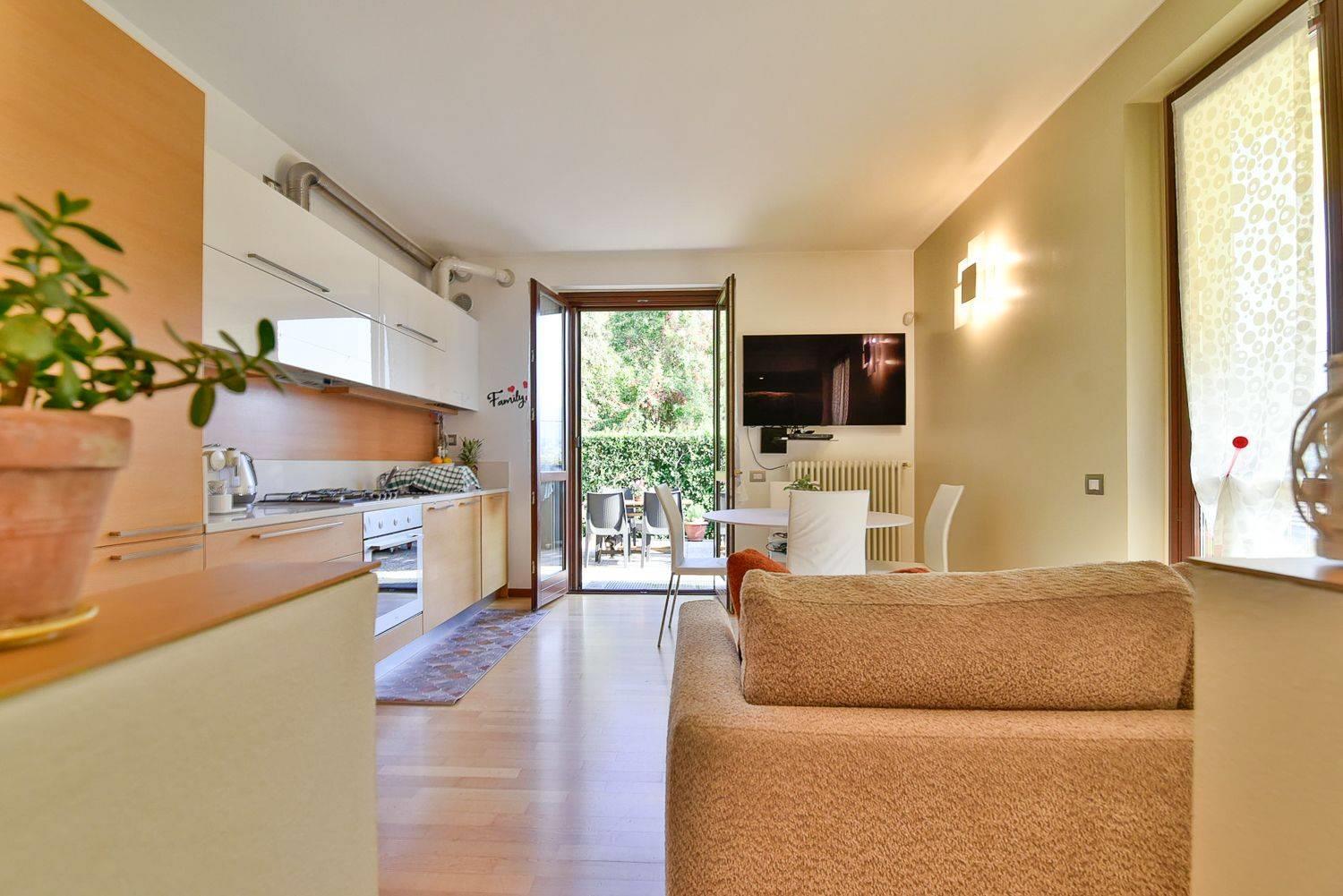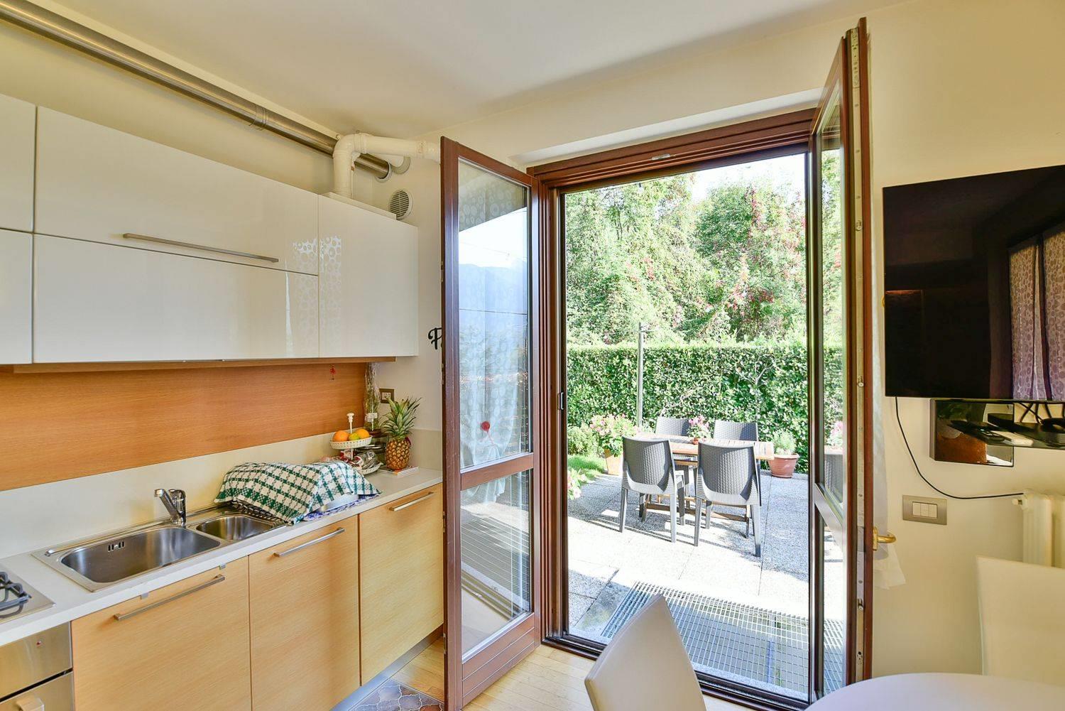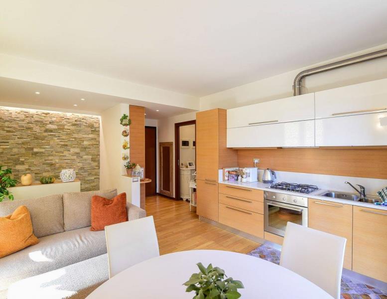 Funge da benvenuto una luminosa zona giorno in open space con accesso diretto al giardino di proprietà.
