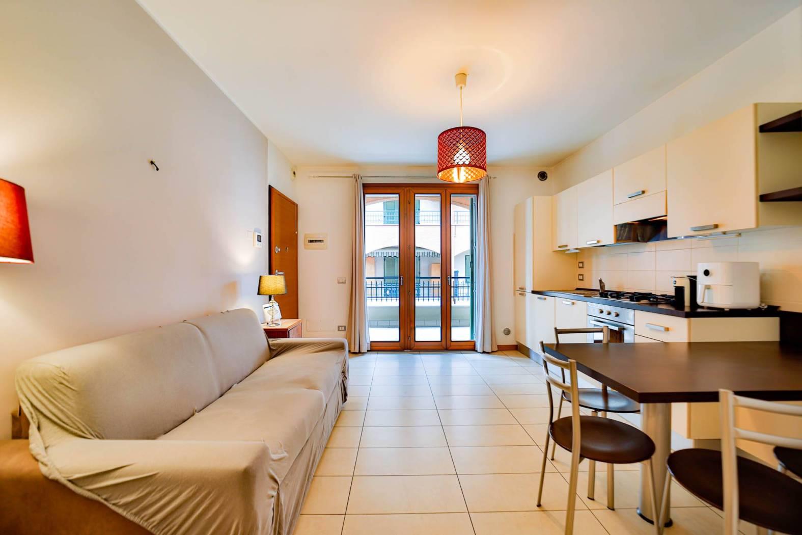 L’abitazione accoglie con un luminoso soggiorno con cucina a vista, ambiente armonioso e moderno che si apre su un piacevole terrazzo, ideale per momenti di relax all’aperto o cene nelle sere d’estate.