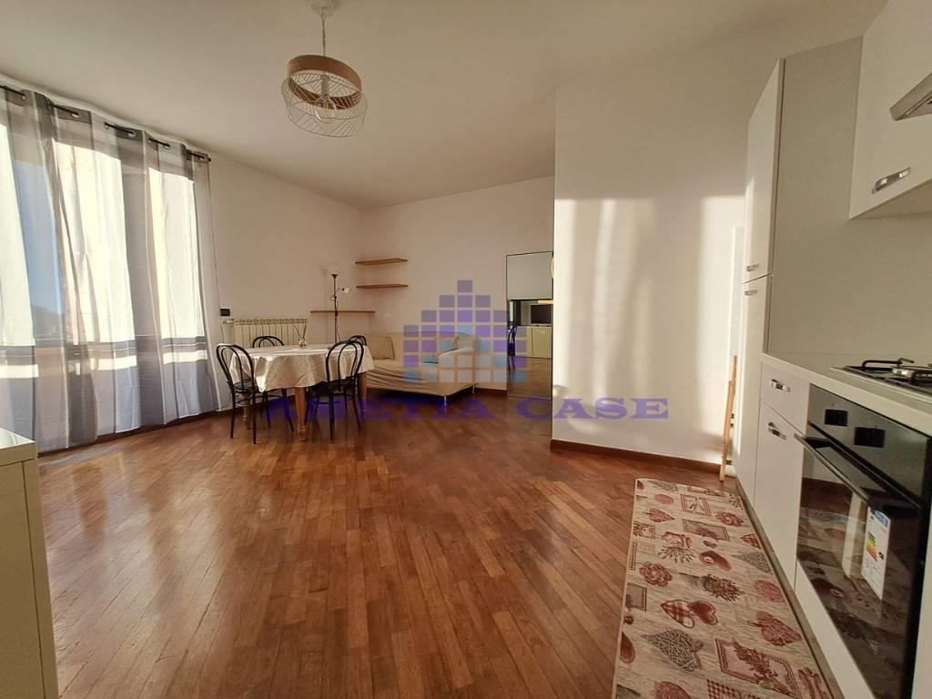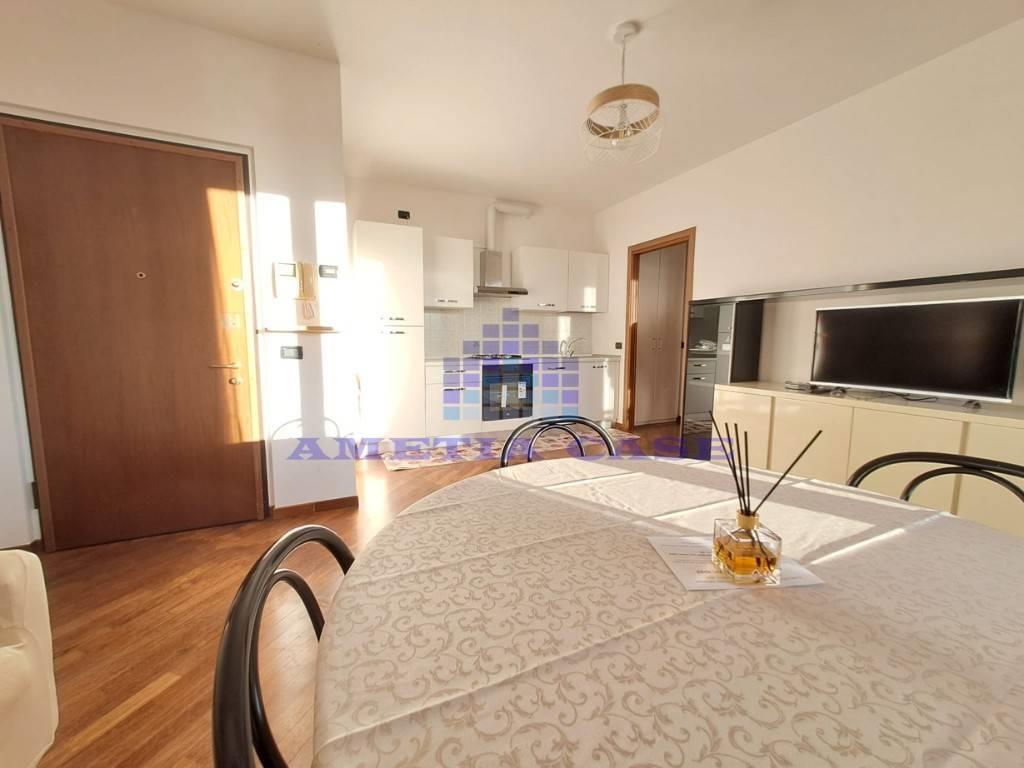 La zona giorno si compone di un soggiorno luminoso con cucina a vista e accesso diretto al balcone coperto.
