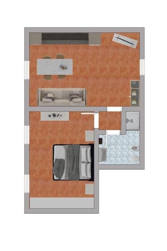Entrando troviamo la zona giorno con cucina lasciata a vista. Luminosa camera matrimoniale e bagno finestrato con doccia.