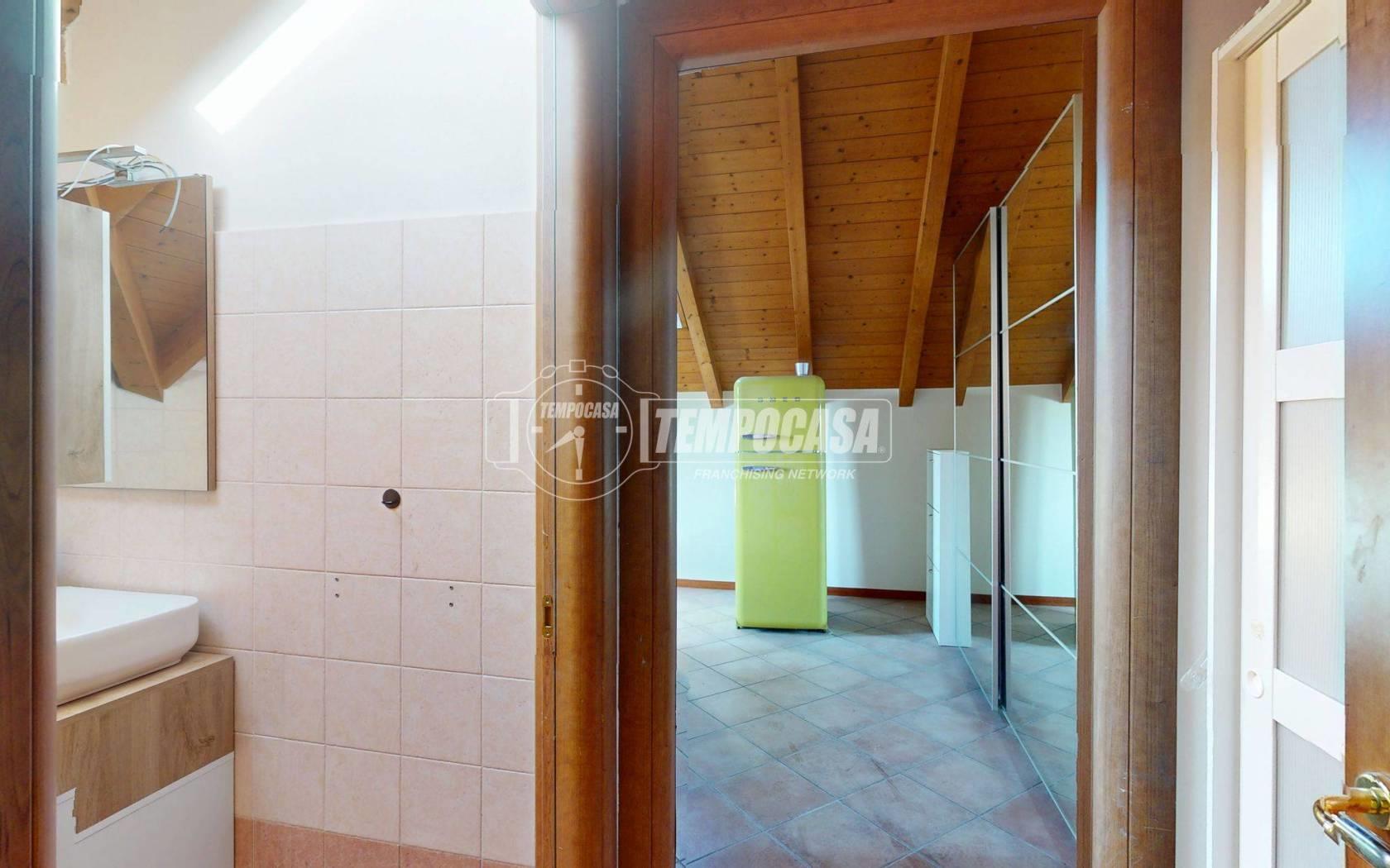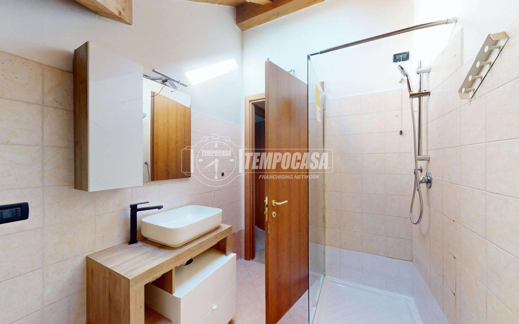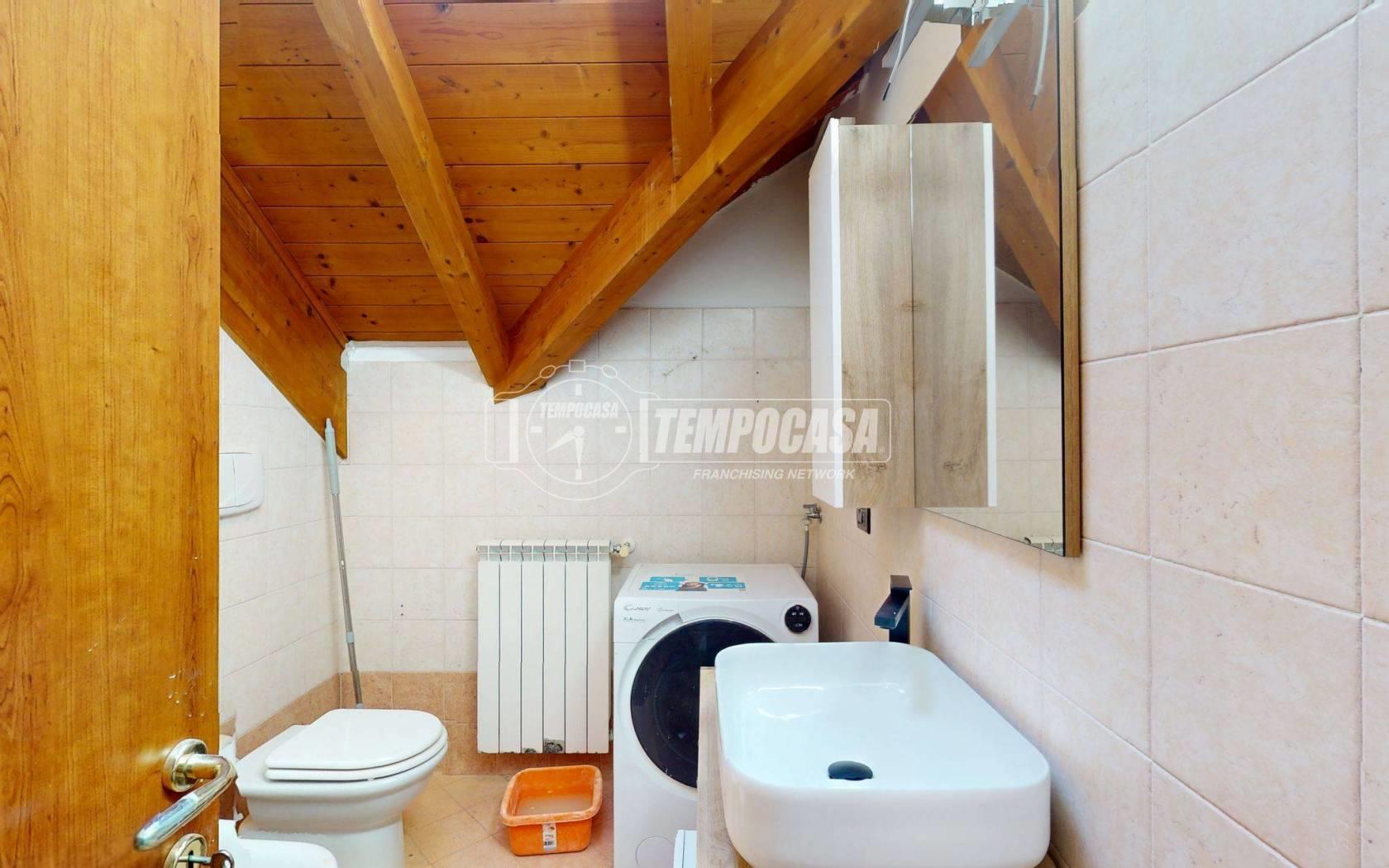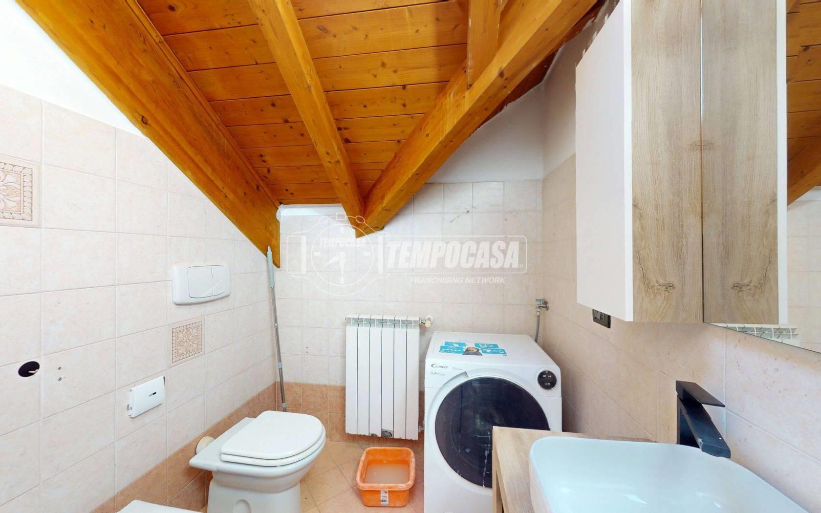 La zona notte è composta da una camera da letto ben proporzionata, anch’essa valorizzata dalle travi a vista che conferiscono un tocco di charme e rendono l’ambiente intimo e accogliente. Il bagno è dotato di box doccia e si presenta in ottime condizioni, funzionale e ben rifinito.