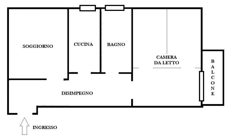 ingresso, soggiorno, cucinotto, bagno, camera da letto e balcone.