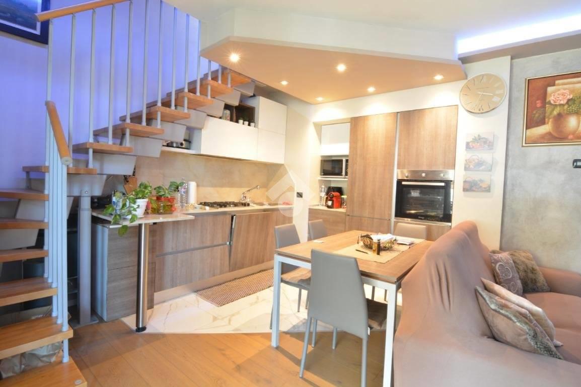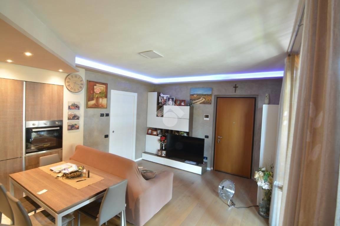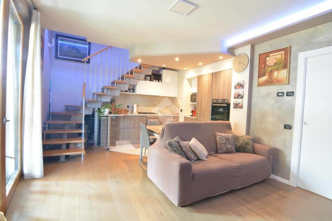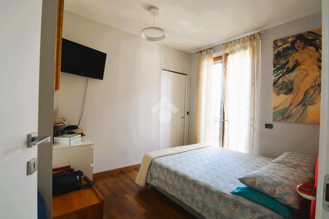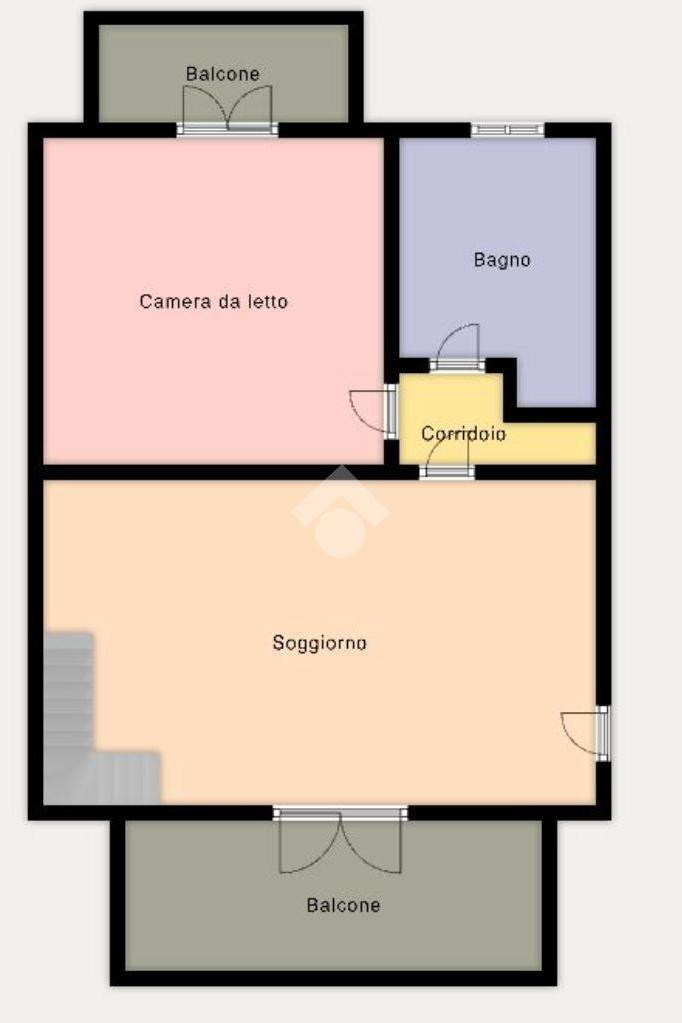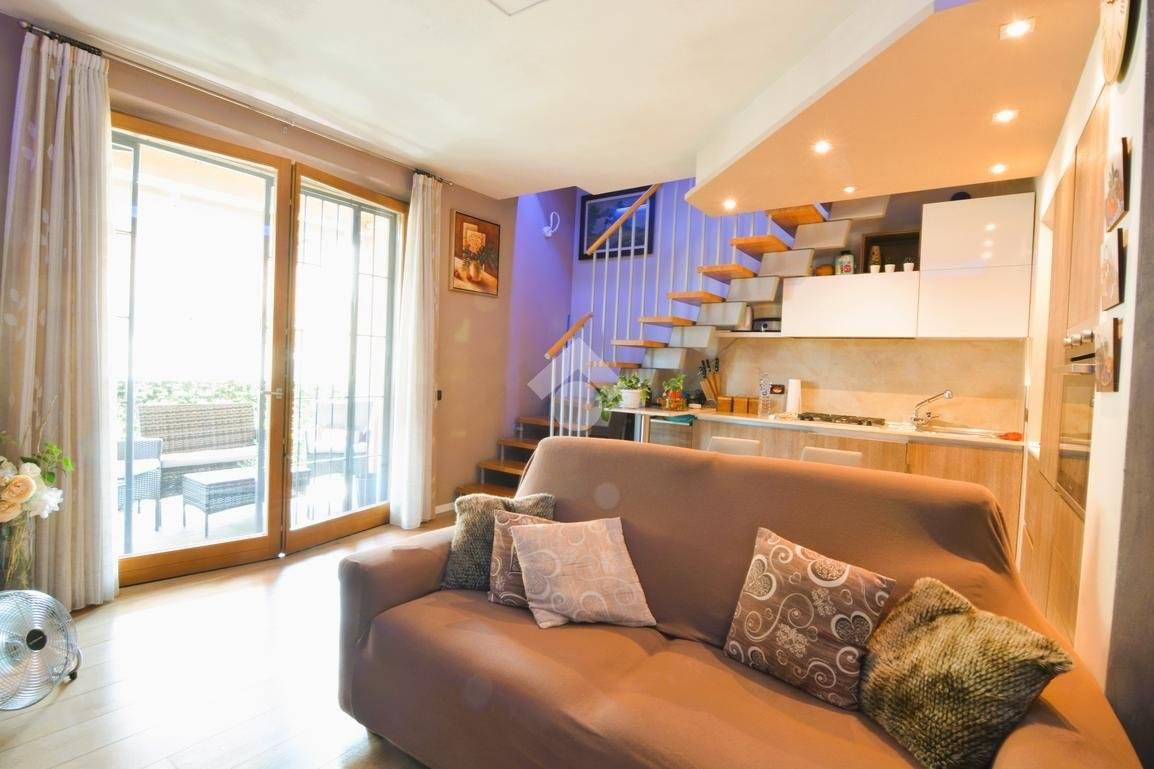 L'ingresso consente l'accesso direttamente nella zona giorno divisa tra zona divano e cucina angolare a vista. Completa l'ambiente un'ampia portafinestra che consente l'uscita sul terrazzino esposto a sud e dotato di tenda parasole. Il piano si completa di un servizio finestrato con doccia e di una camera da letto con pavimento in parquet, cabina armadio e uscita sul secondo balcone.