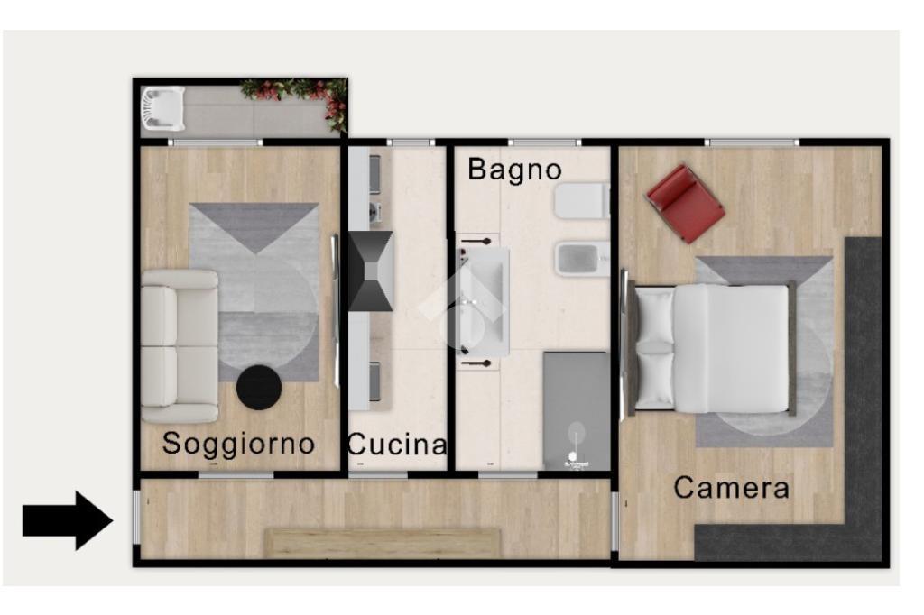 Accanto al soggiorno si trova il cucinotto, pensato per chi desidera avere la zona cottura separata ma facilmente accessibile; Un ambiente pratico e ben progettato, che permette di sfruttare al meglio ogni centimetro, contribuendo a mantenere ordine e funzionalità nella quotidianità.