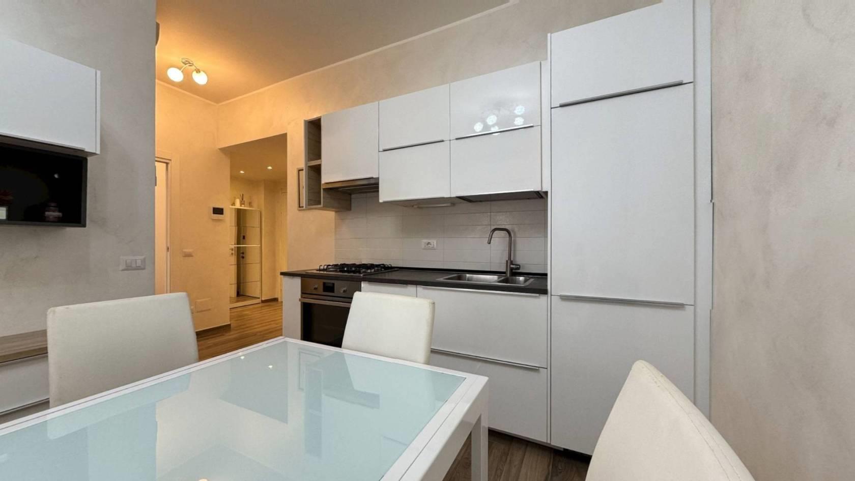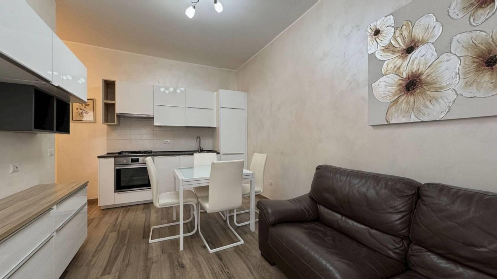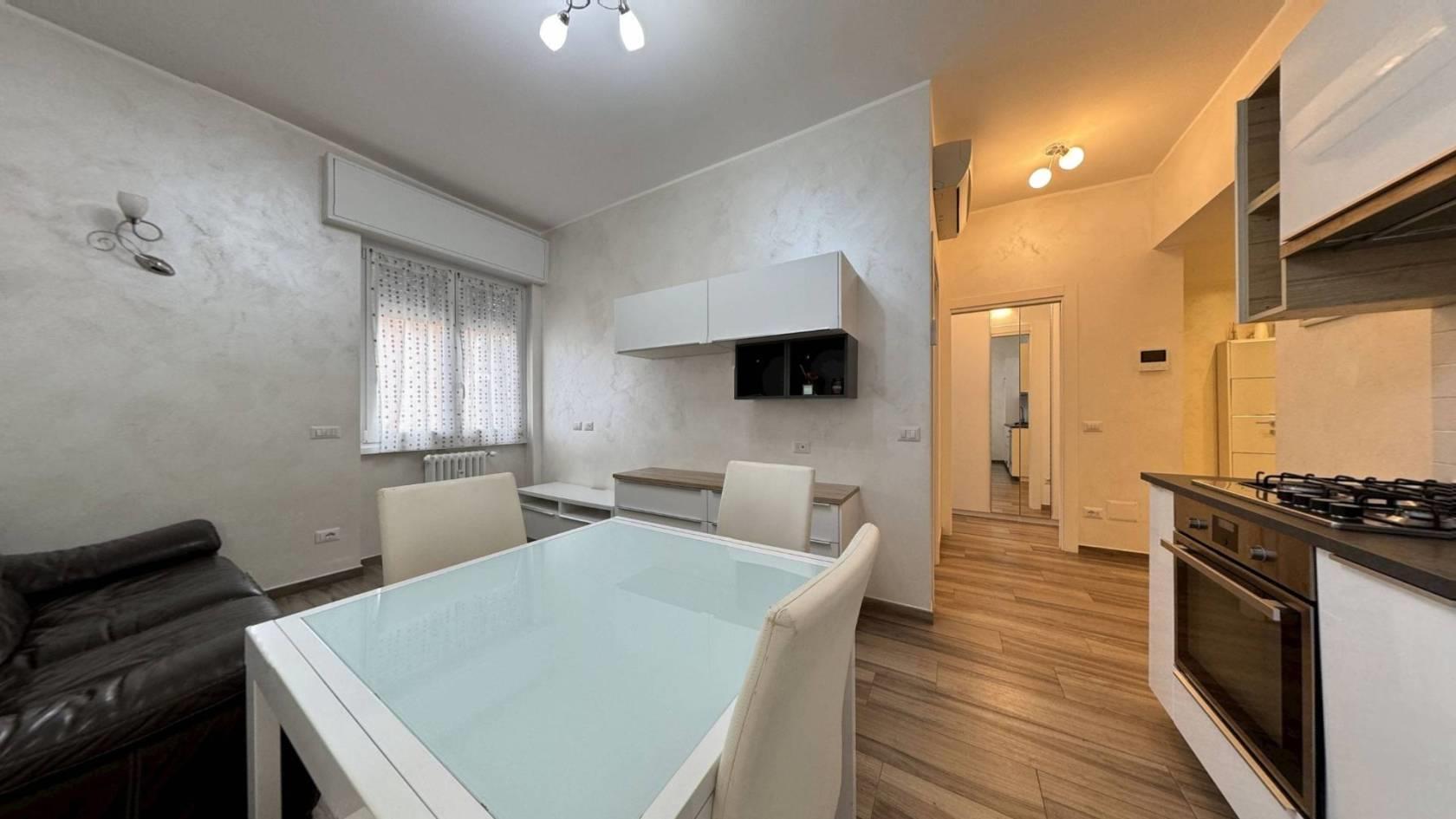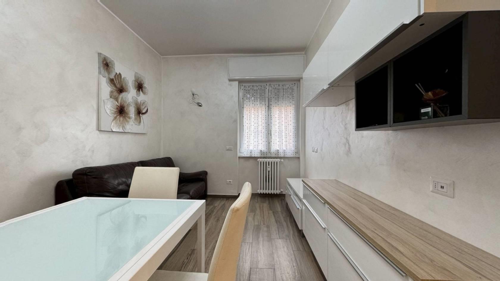 Monza, Via Tiepolo 6 — in zona servitissima con scuole, negozi e comodi collegamenti autobus verso il centro e la stazione, proponiamo al secondo piano di una palazzina un bellissimo bilocale completamente ristrutturato e arredato a nuovo. L’ingresso, ampio e funzionale, divide la zona giorno dalla zona notte: sulla sinistra troviamo il soggiorno arredato con divano, tavolo e mobile TV, con cucina a vista completa di frigorifero, forno e lavastoviglie; sulla destra la camera matrimoniale, dotata di TV e con accesso al balcone. L’appartamento dispone di antibagno adibito a lavanderia con lavatrice e di bagno finestrato con doccia. Il riscaldamento è centralizzato e le Spese condominiali ammontano ad €120,00/mese. Presenti infissi in PVC con doppio vetro, condizionatore.