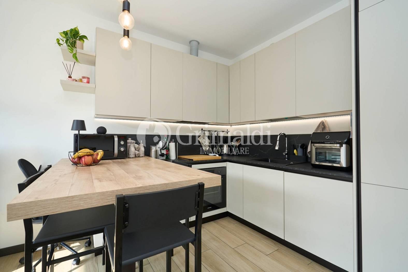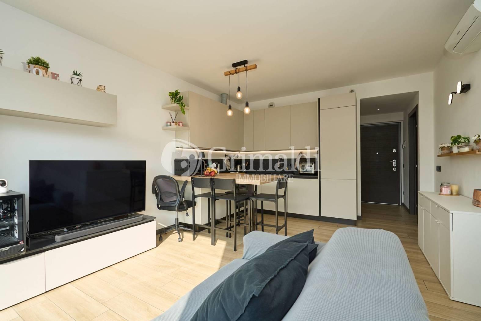 L’appartamento è un elegante due locali con zona living open space e cucina a vista, valorizzata da ampia vetrata esposta a sud con uscita su terrazzo vivibile. Completano la soluzione camera matrimoniale e bagno con pozzo di luce. Gli ambienti sono luminosi, ben distribuiti e funzionali.