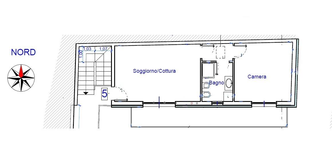 Posto al primo piano, come unico appartamento al piano, libero sui 4 lati, soggiorno con cucina a vista di circa, dal quale si può accedere tramite una portafinestra doppia alla balconata di 12.5 mq che percorre tutta la lunghezza dell’appartamento, dal disimpegno si ha accesso al bagno ed alla camera matrimoniale.