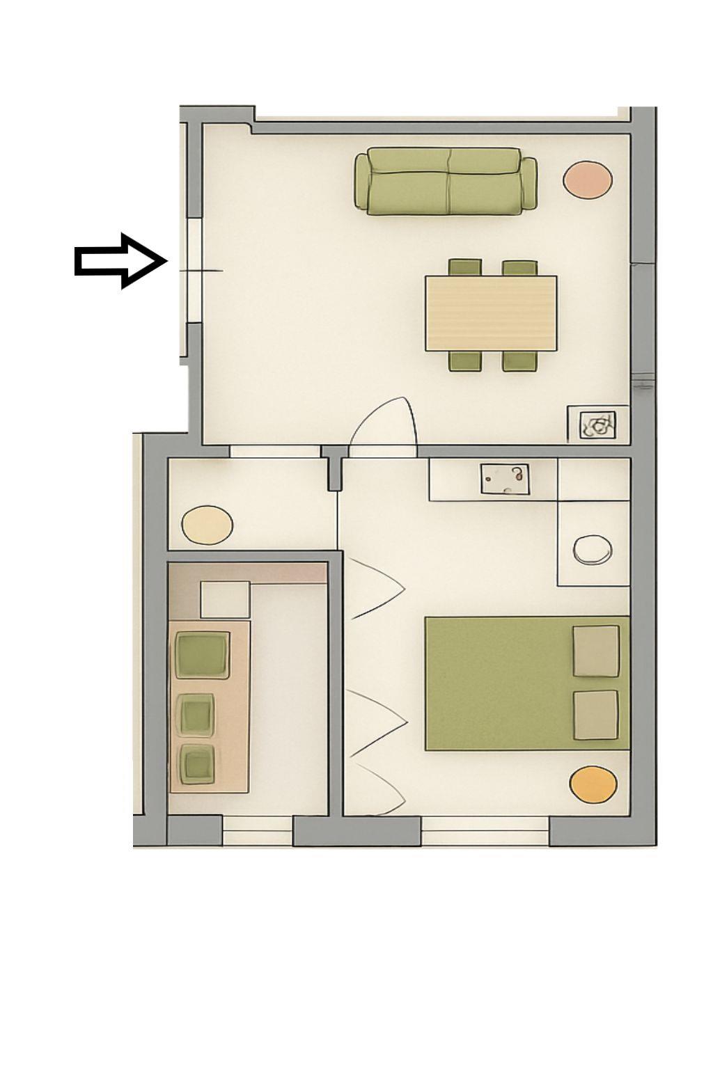 L’appartamento, situato al piano rialzato di un condominio ben tenuto, è composto da ingresso, soggiorno con cucina a vista, camera da letto e bagno. (Senza balconi)