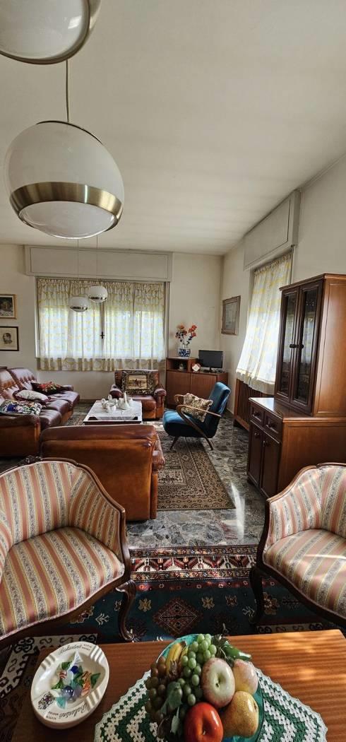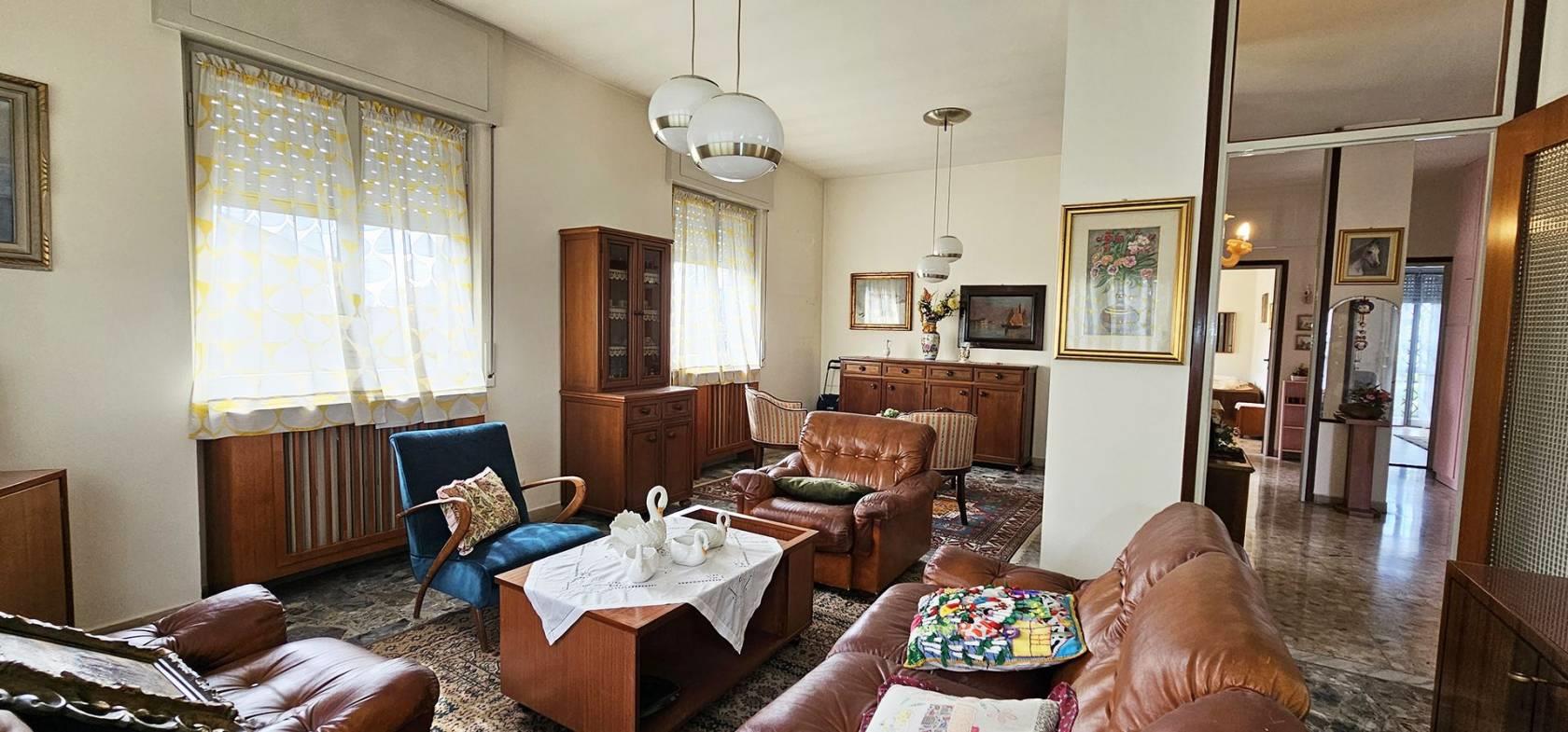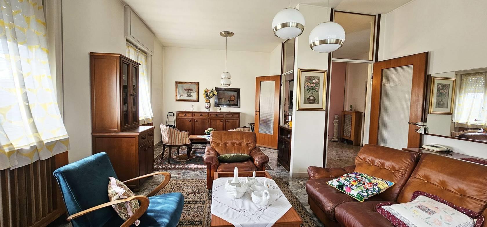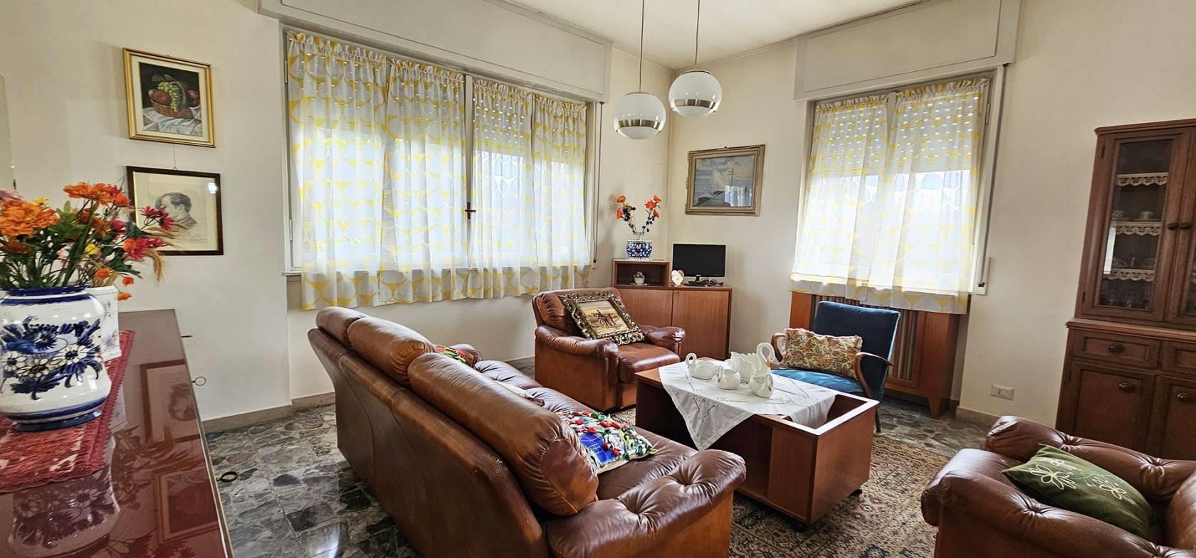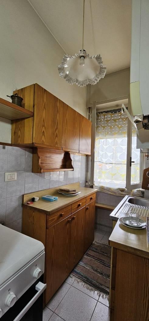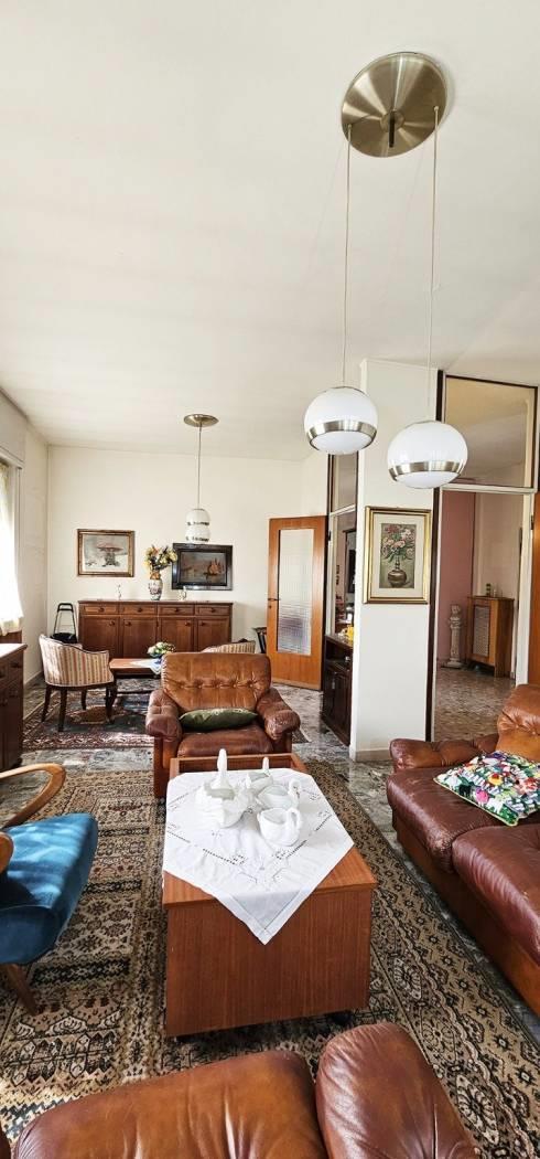 FINITURE: L'Appartamento si presente con finiture originarie ed in discrete condizioni; Pavimentazione realizzata prevalentemente in piastrelle di tipo “marmettoni” ad eccezione del bagno ove è realizzata in piastrelle di ceramica, ed una camera con parquet. Infissi esterni con struttura in legno e vetro, ed avvolgibili in plastica; porte interne in legno, con “specchiatura” in vetro. Riscaldamento AUTONOMO, con radiatori in ghisa; il piano Interrato ha pavimentazione realizzata in “battuto di cemento”. La Palazzina è servita da impianto Servoscala.