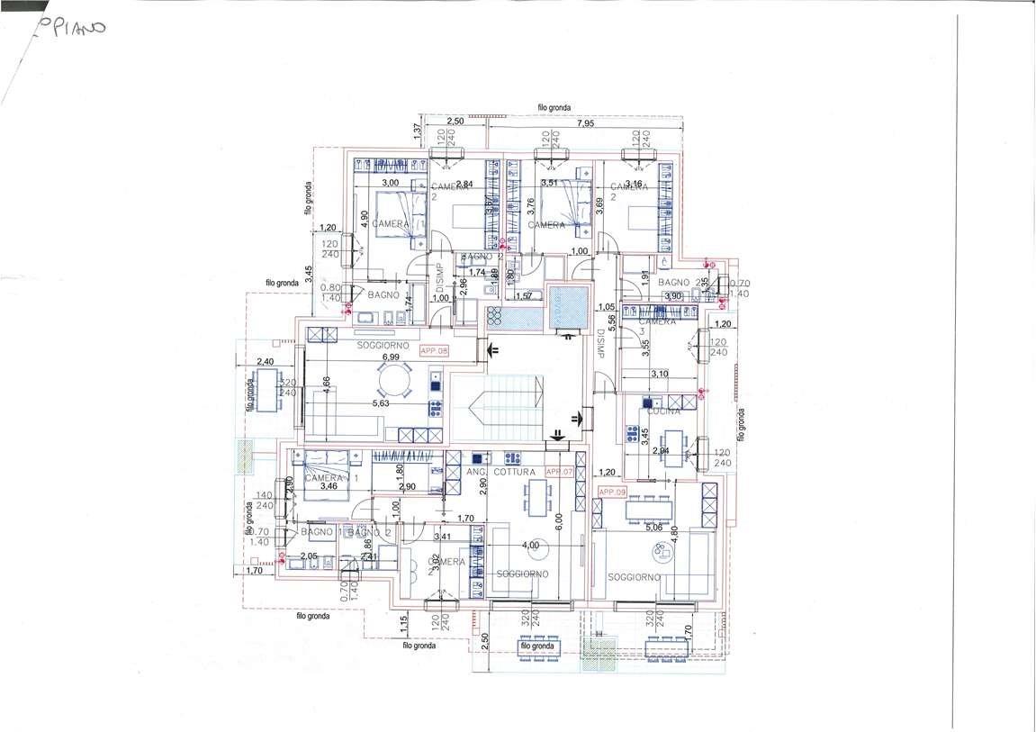 TIPOLOGIA TRILOCALE PIANO PRIMO 03: ingresso, soggiorno con cucina a vista e uscita sul terrazzo, disimpegno notte, camera matrimoniale con cabina armadio, seconda camera, 2 bagni. Autorimessa. Prezzo: €. 282.000,00 + iva.