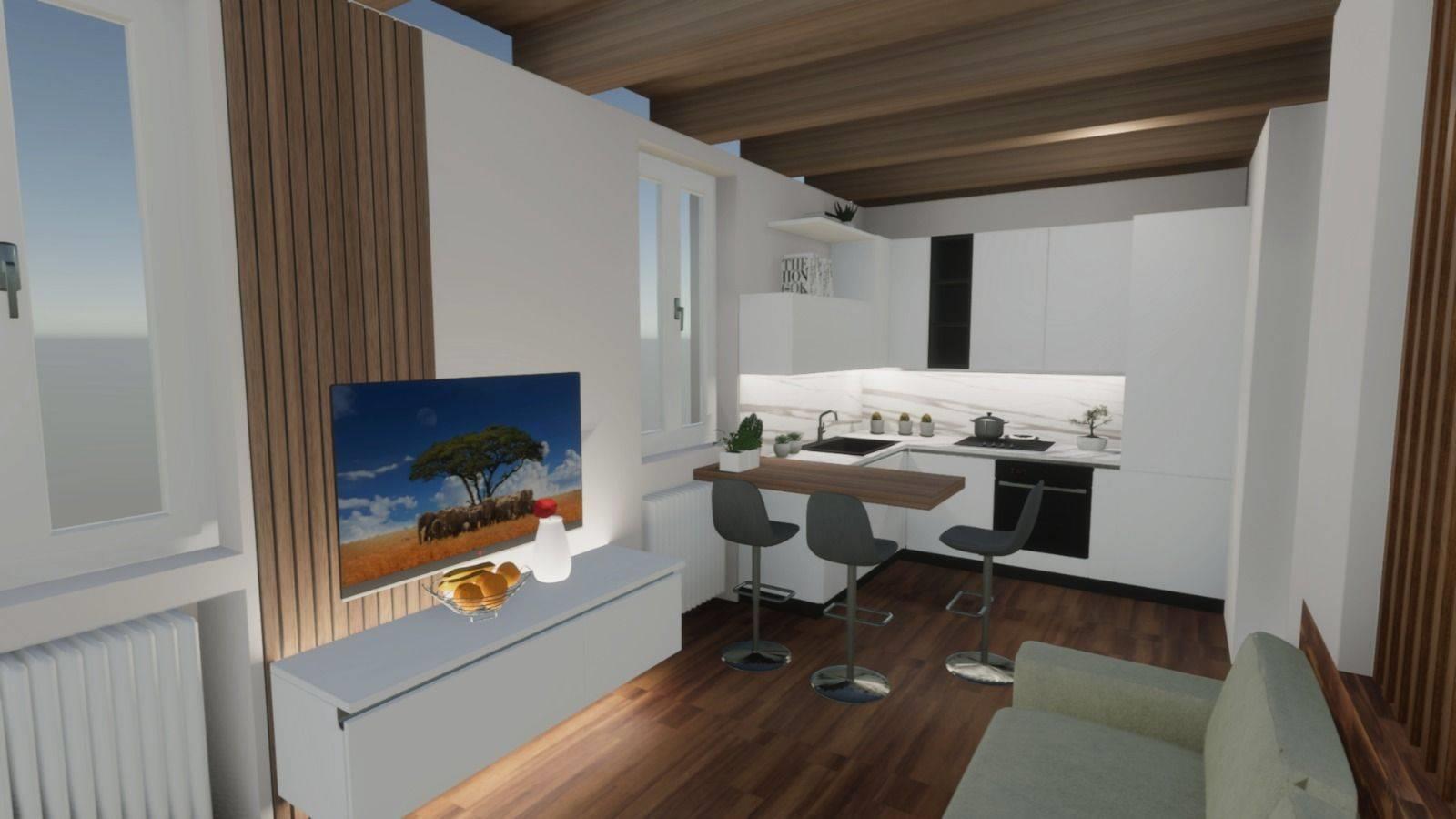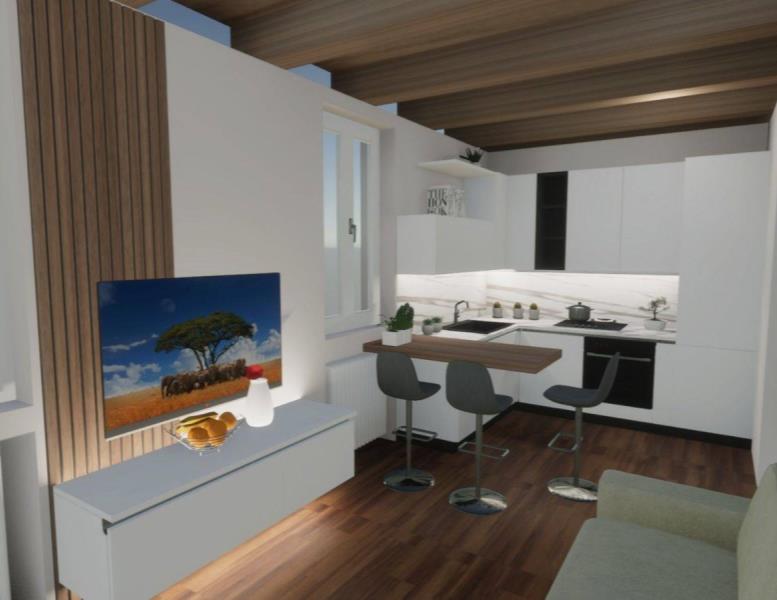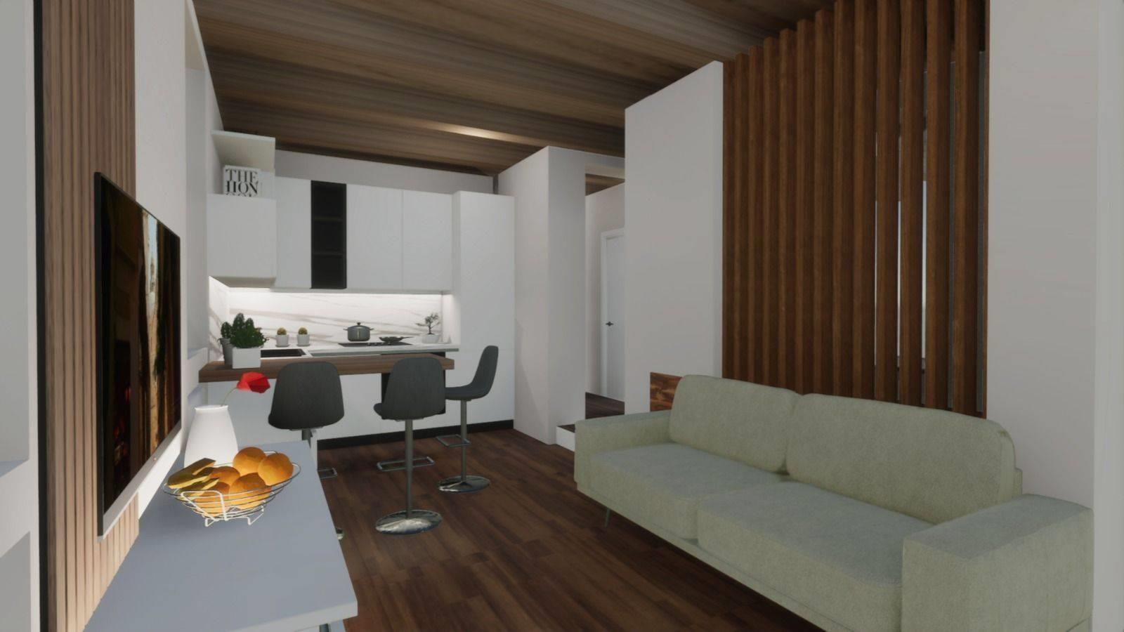 In fase di totale ristrutturazione con consegna aprile 2026, appartamento al piano terra composto da soggiorno con cucina, due camere e bagno, scala interna che collega ad una tavernetta/cantina con soffitto a volta in mattoni, molto caratteristica.
