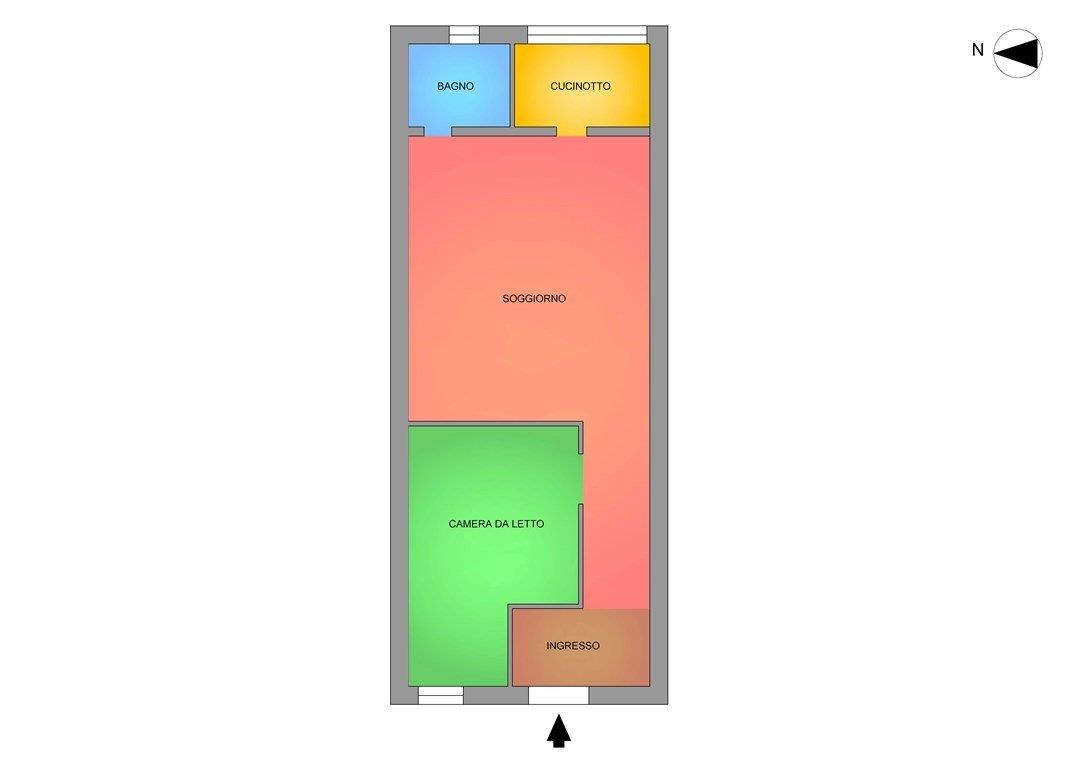 L'immobile è composto da ingresso, locale soggiorno con piccolo cucinotto separato da un'apertura ad arco senza porta, 1 camera da letto finestrata, bagno con piccola finestratura sul retro (con doccia).