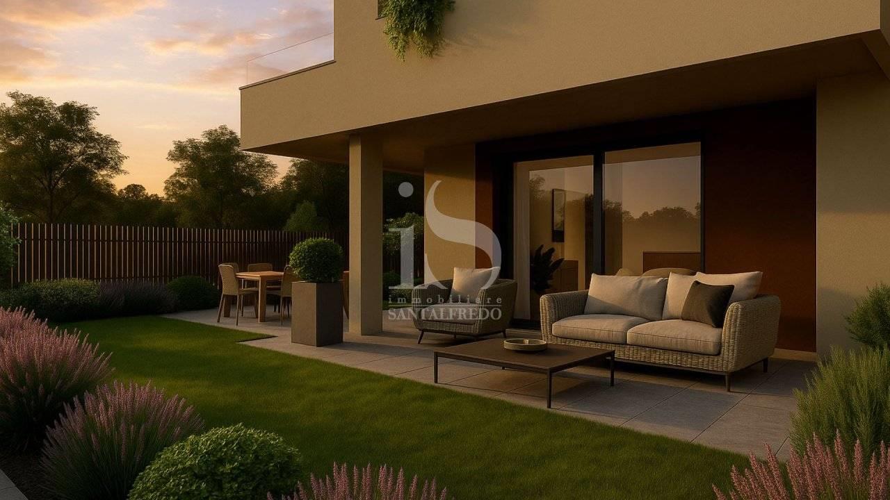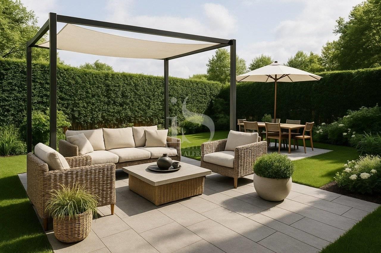 Il giardino, di circa 250 mq è distribuito su tre lati, valorizza la prospettiva dell'abitazione e permette un utilizzo modulabile tra area conviviale e zona relax sotto il portico coperto. Le superfici esterne sono rifinite con pavimentazioni in gres chiaro e bordature in verde progettate per garantire riservatezza e armonia con il contesto.