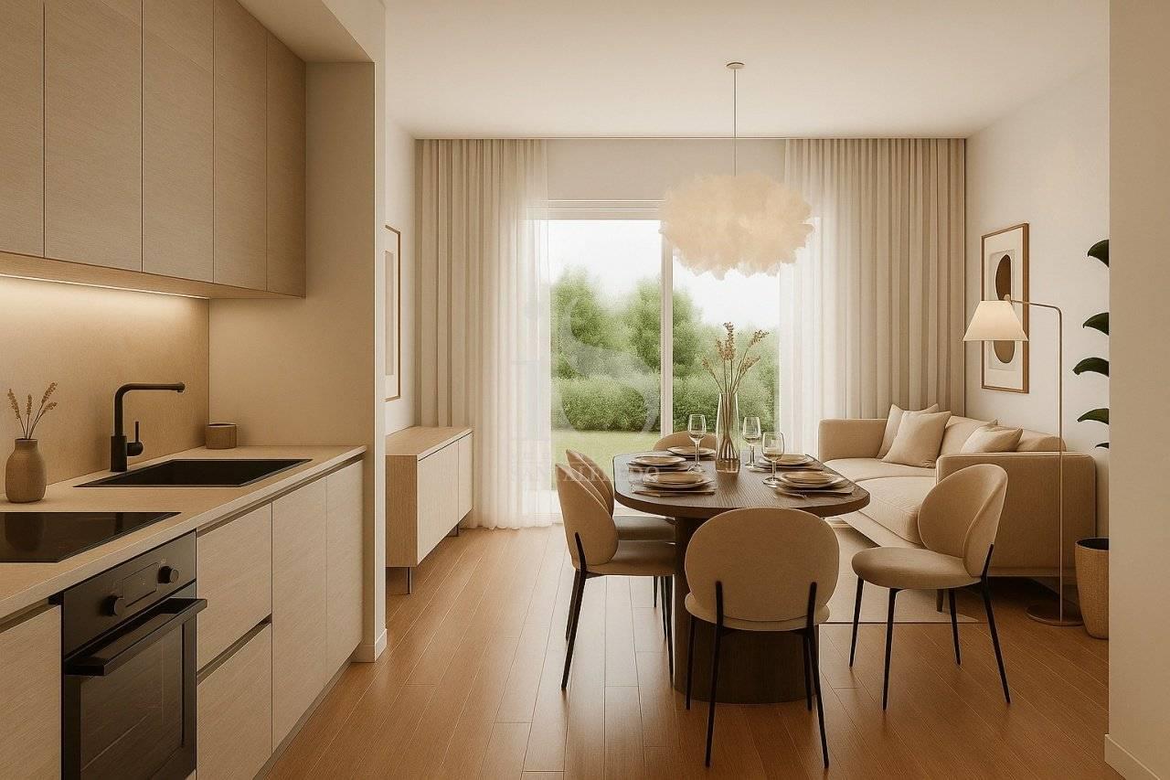 La zona giorno è concepita come un ambiente ampio e ben definito: l'ingresso introduce a un soggiorno regolare con ampie aperture verso il giardino, mentre la cucina, separata ma adiacente, gode anch'essa di accesso diretto all'esterno.