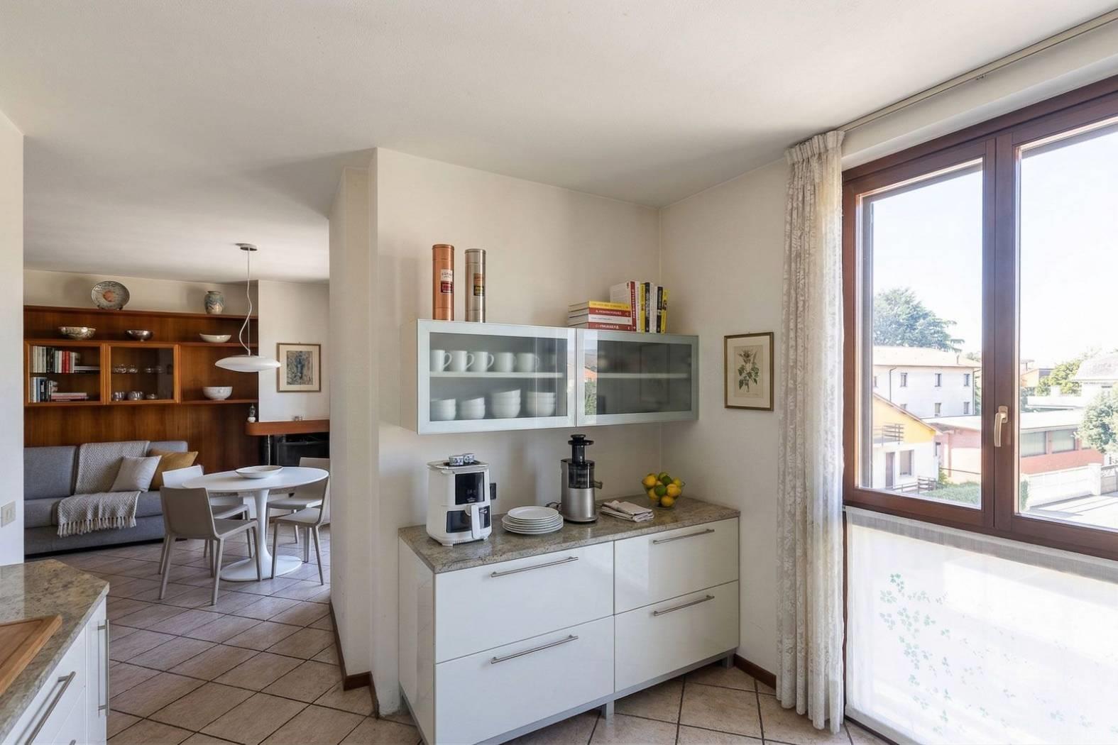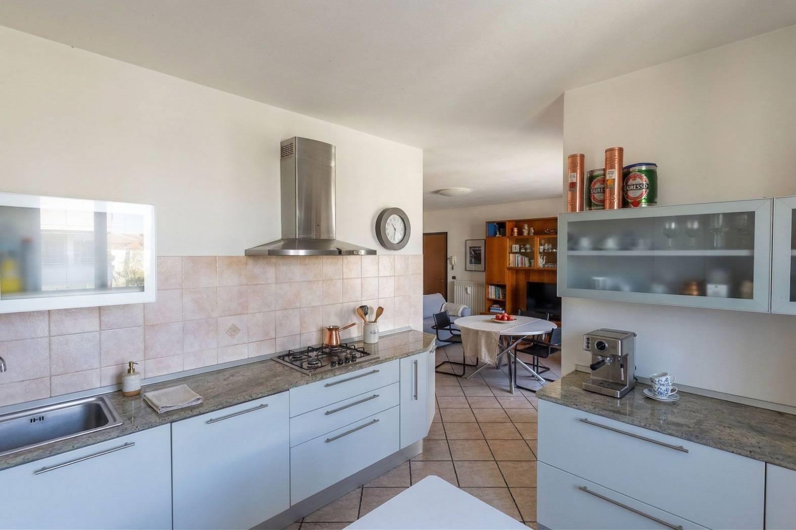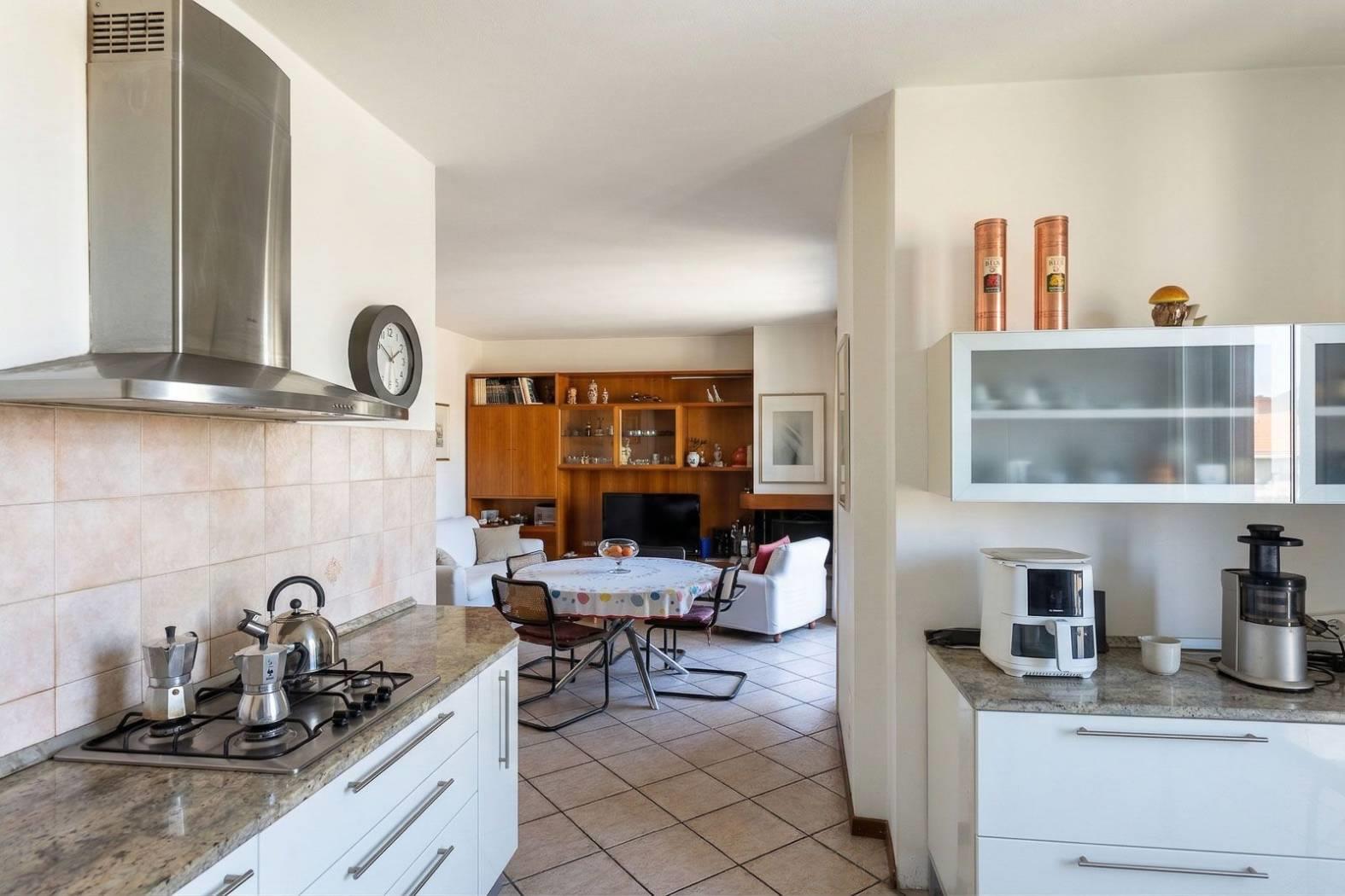 La cucina a vista, ampia e funzionale, è dotata di finestra propria e si integra armoniosamente con la zona living, creando uno spazio conviviale ideale per la vita quotidiana .