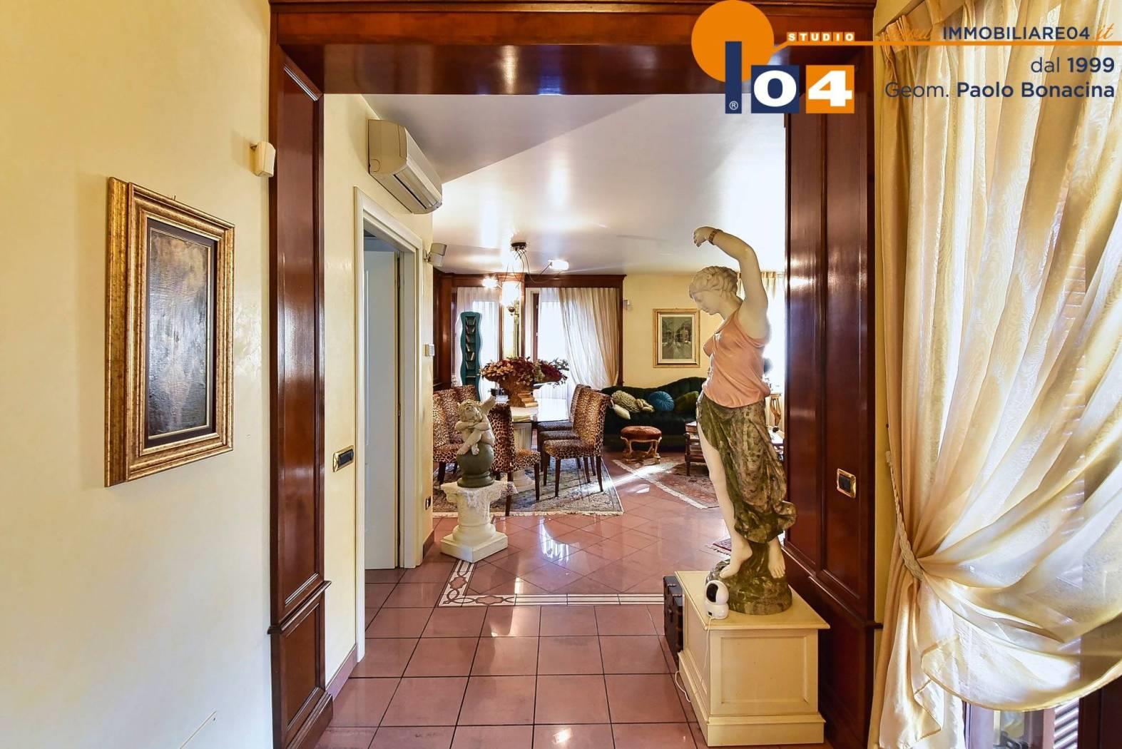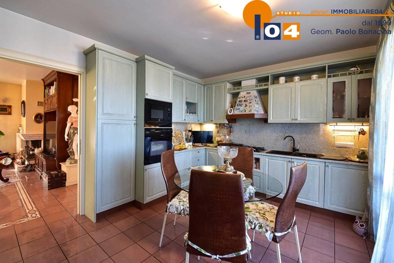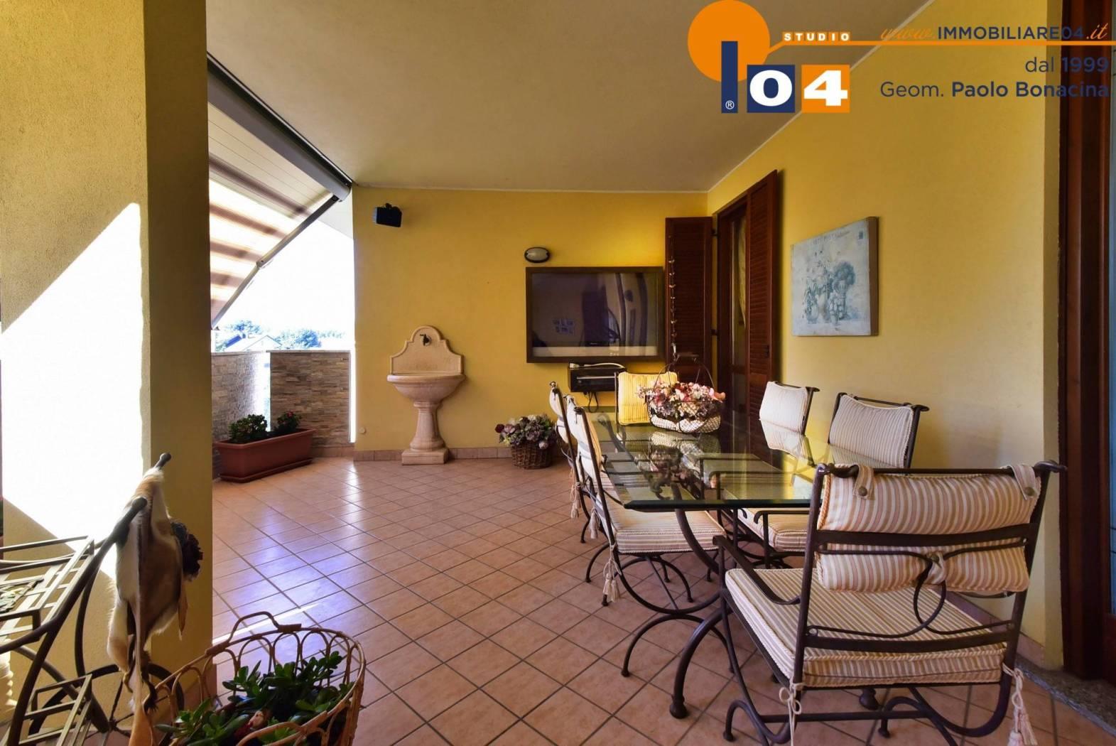 Zona giorno: Luminoso soggiorno con camino dal quale si accede a un terrazzo coperto di 50 mq‚ attrezzato con camino esterno‚ impianto audio e tende motorizzate. Cucina abitabile con terrazzino e locale lavanderia finestrato.