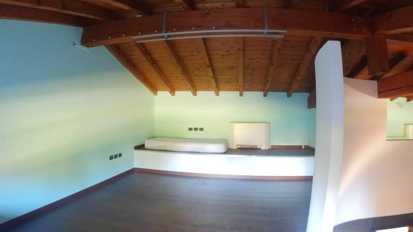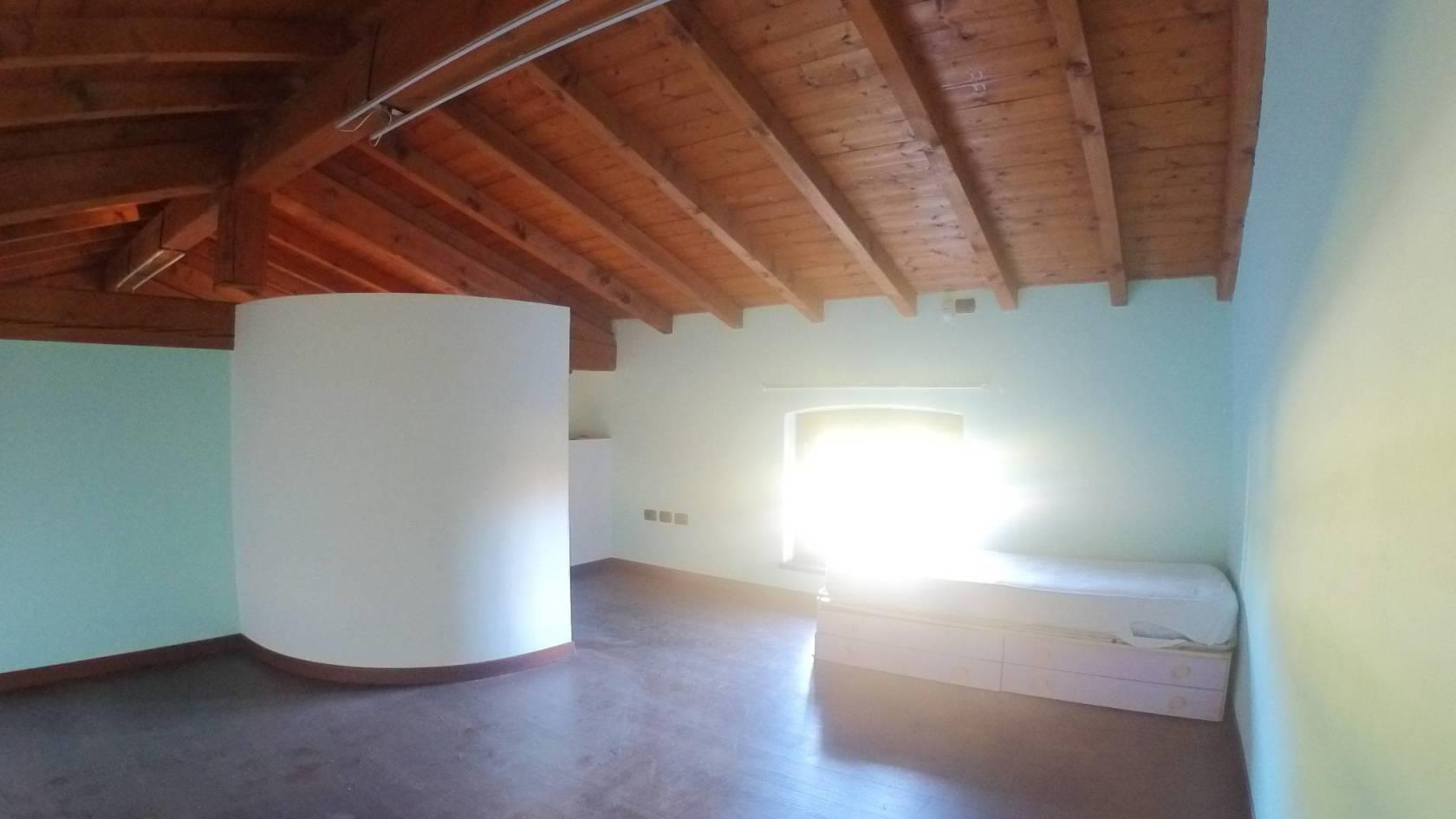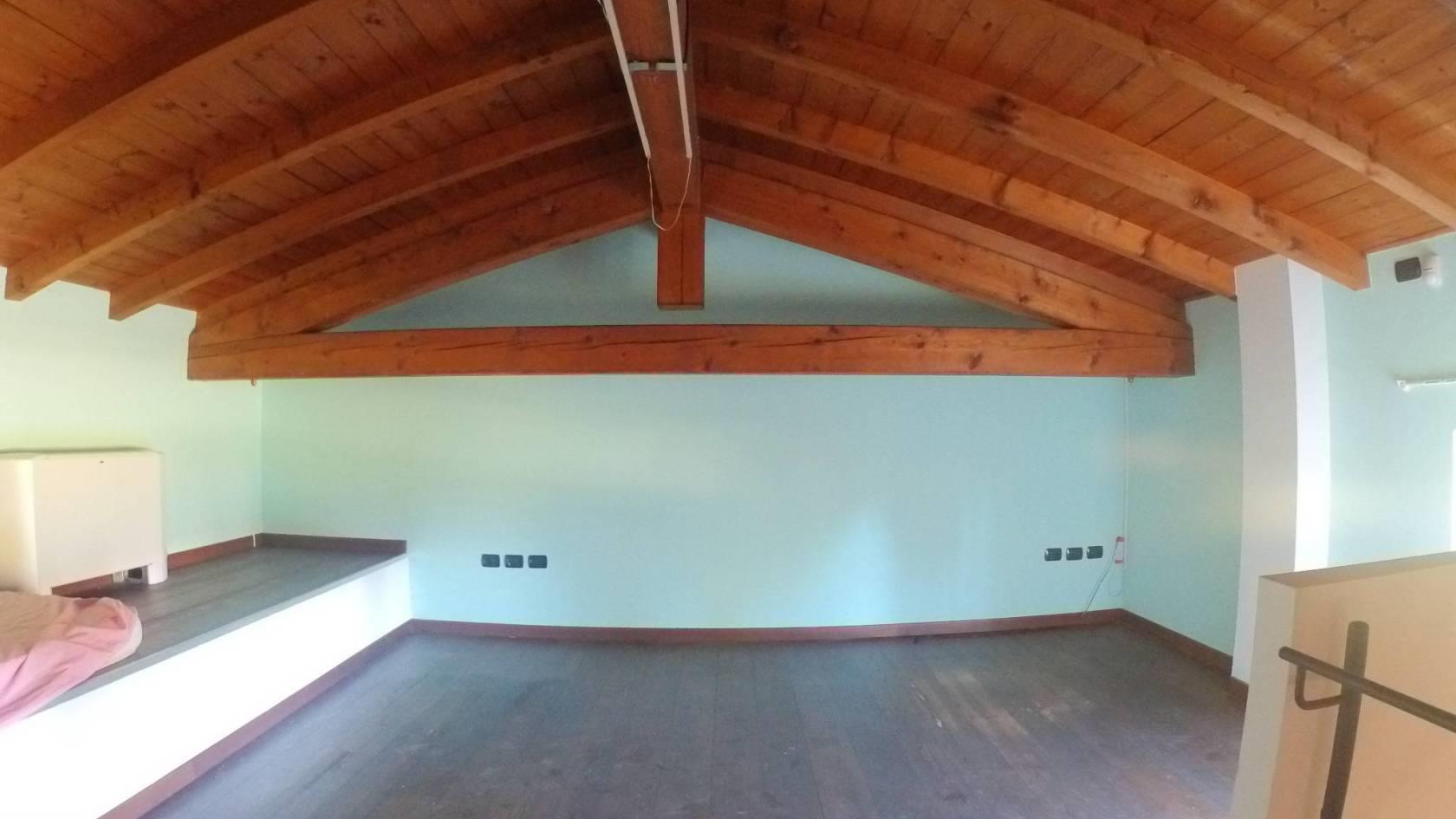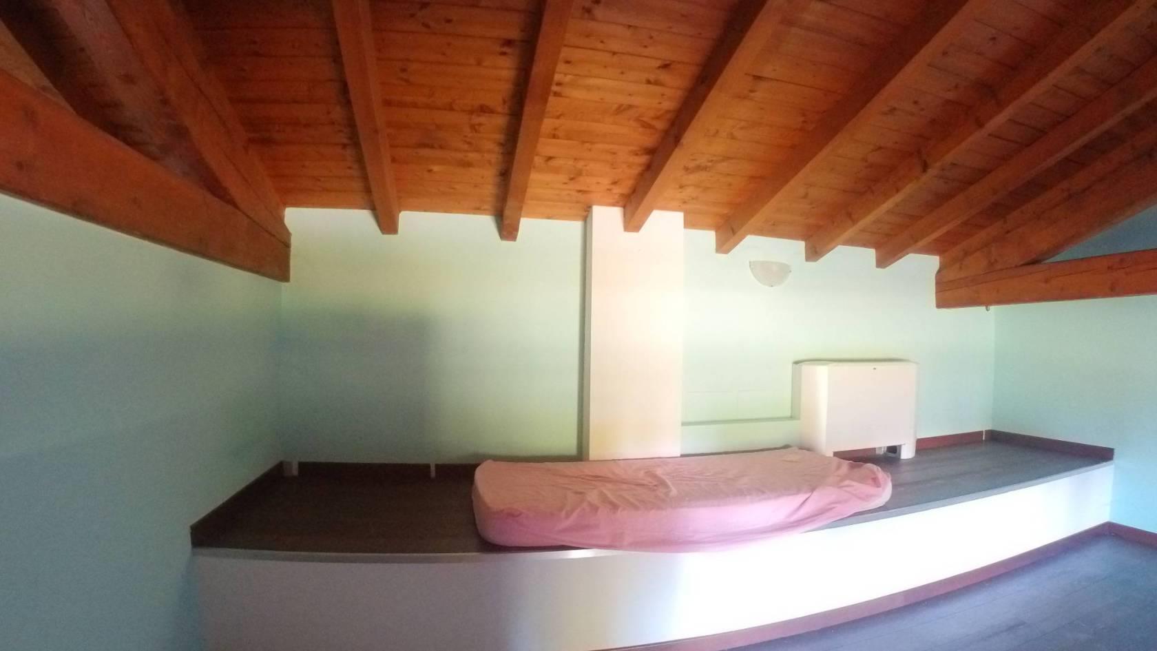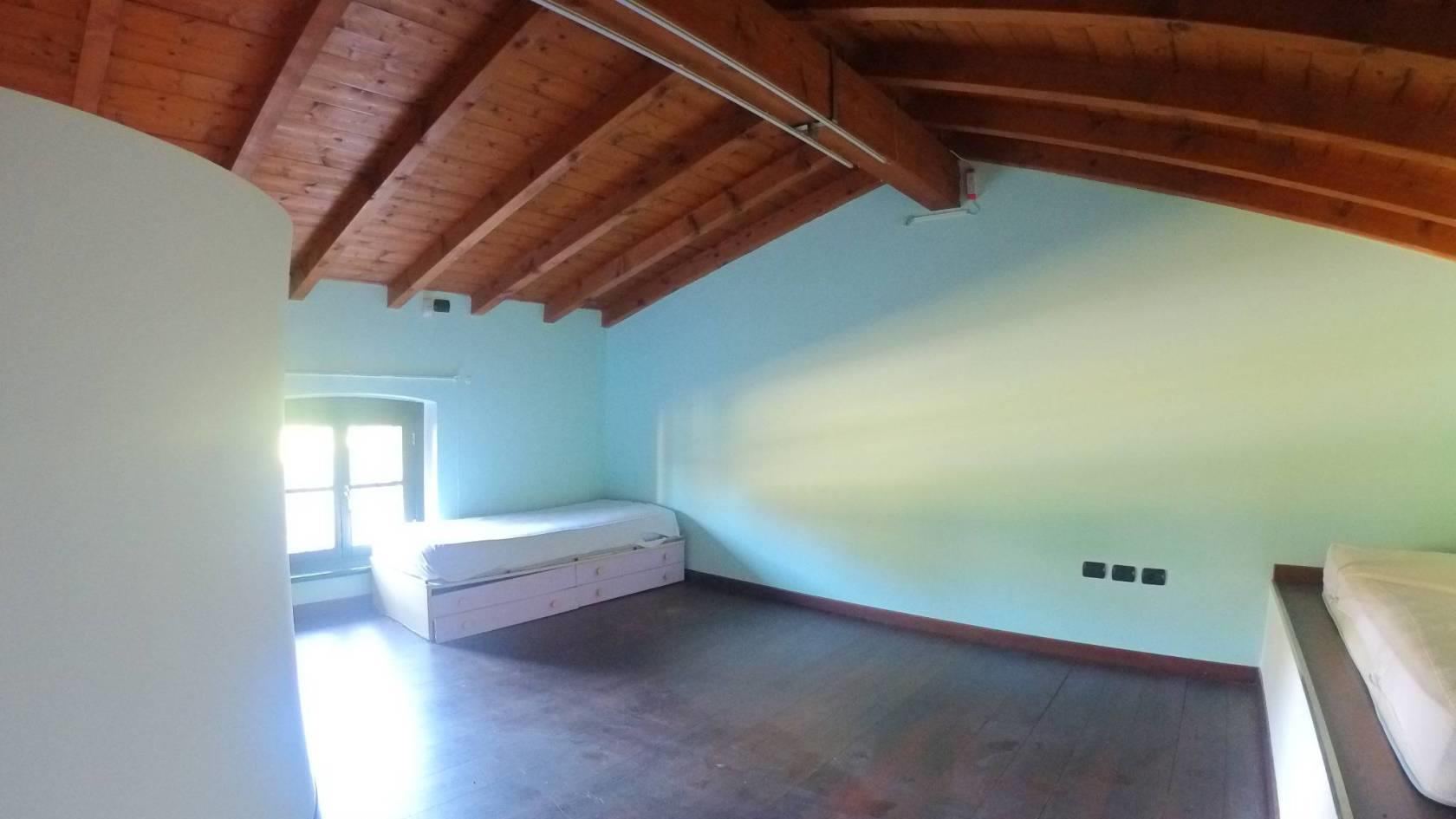 Piano Primo (Mansarda) - Salendo al piano superiore si accede alla suggestiva zona notte mansardata con travi a vista in legno. Lo spazio è attualmente suddiviso in due ambienti distinti da un muretto basso, una soluzione architettonica che mantiene il respiro del soffitto in legno garantendo al contempo privacy e ordine.