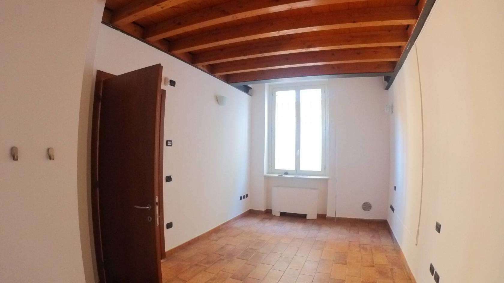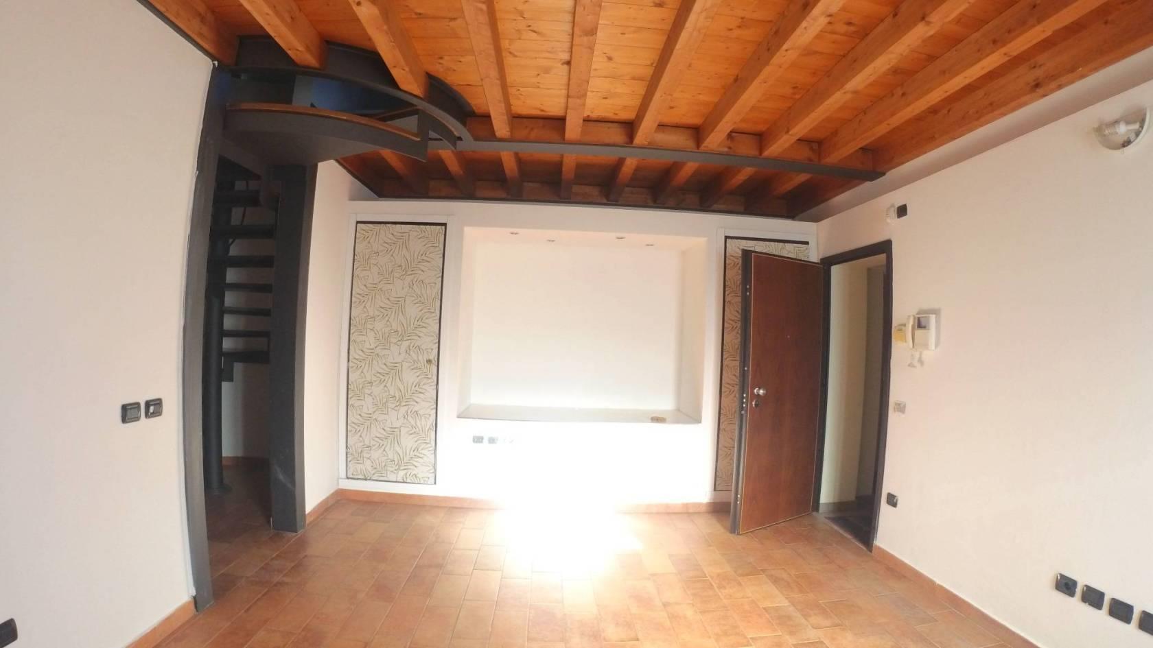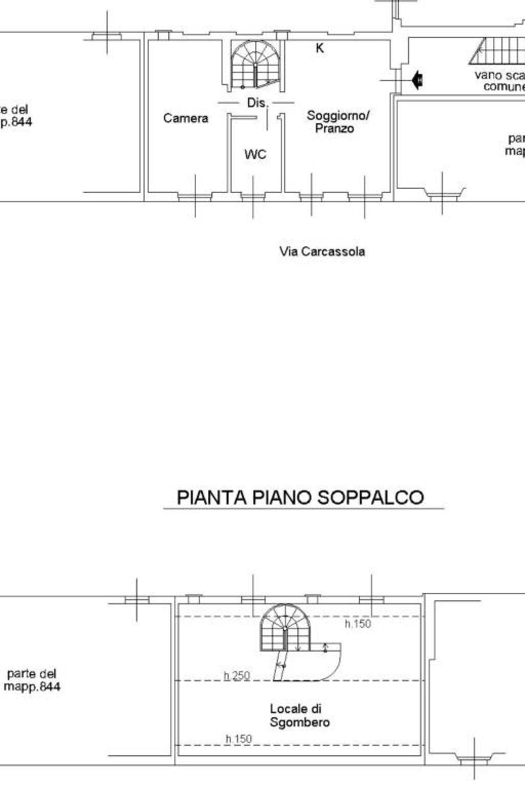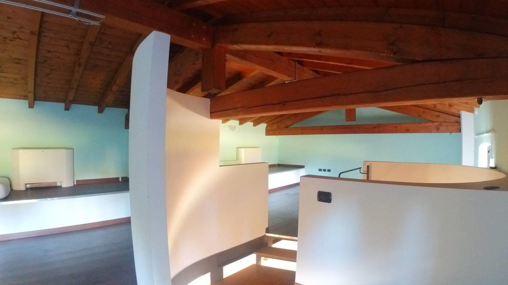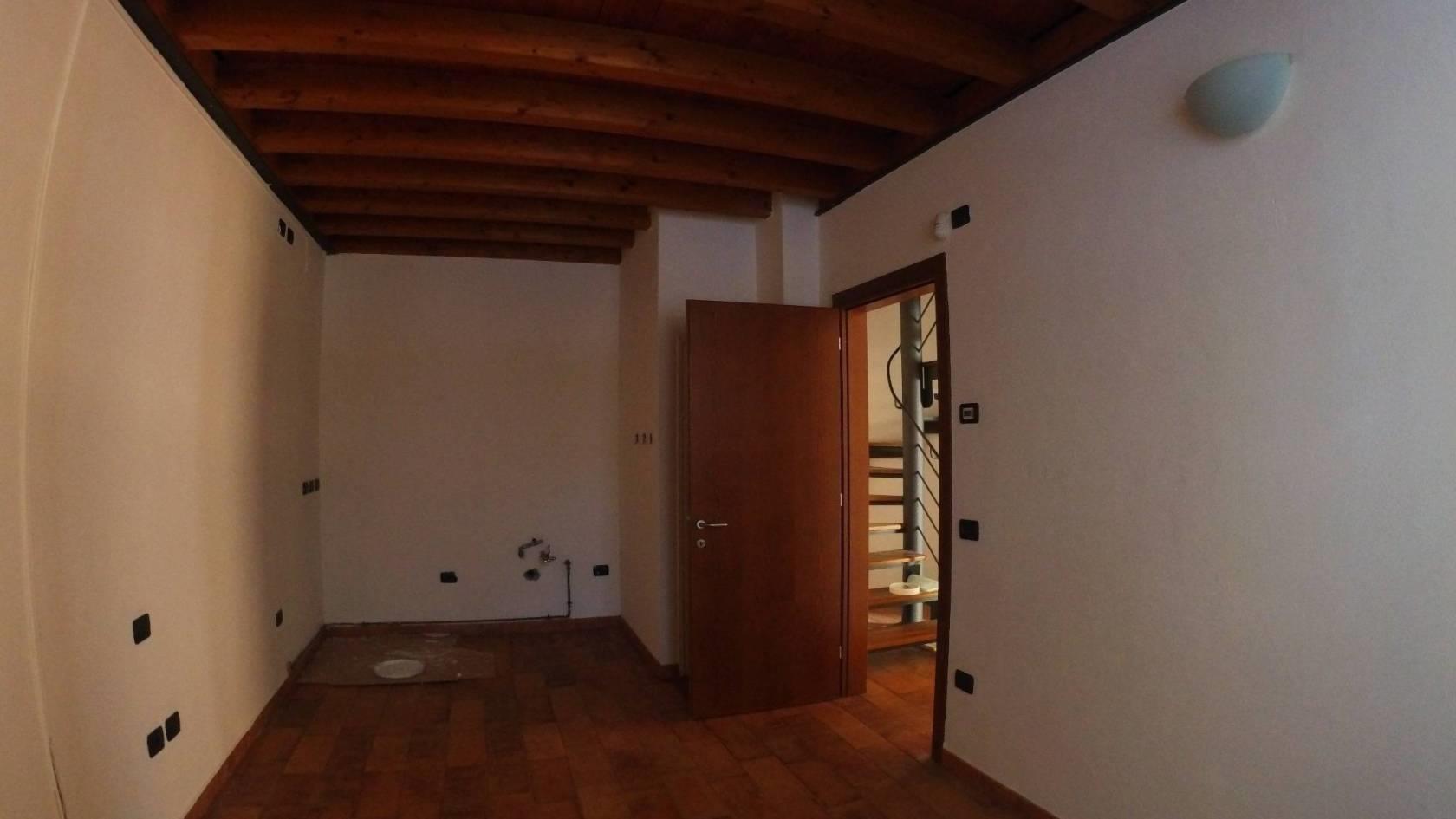Piano Primo (Mansarda) - Salendo al piano superiore si accede alla suggestiva zona notte mansardata con travi a vista in legno. Lo spazio è attualmente suddiviso in due ambienti distinti da un muretto basso, una soluzione architettonica che mantiene il respiro del soffitto in legno garantendo al contempo privacy e ordine.