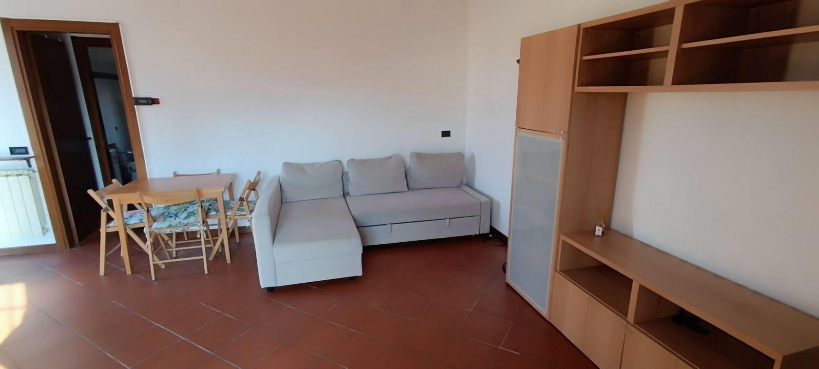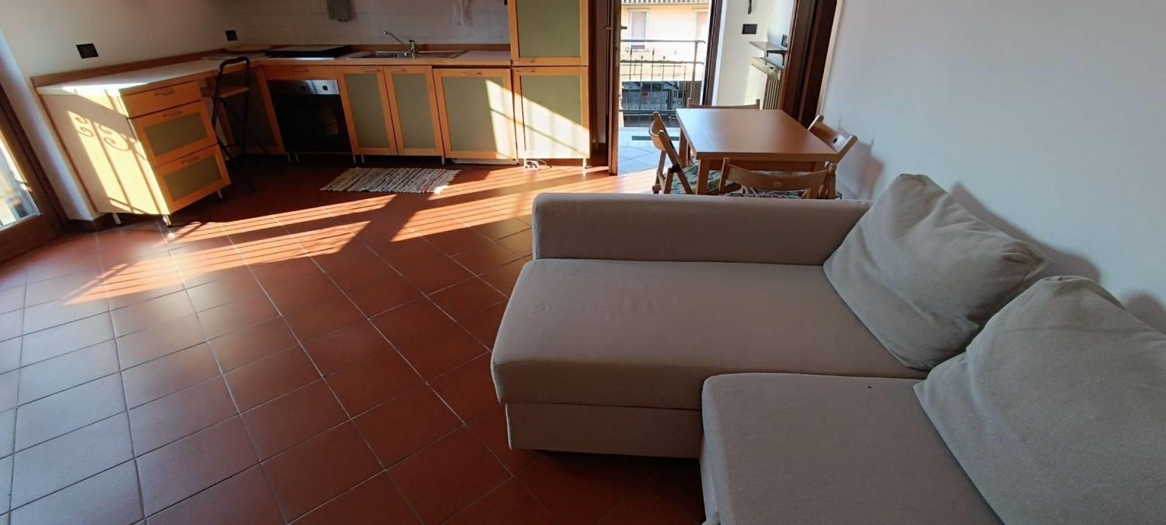 L'appartamento con accesso da scala privata, ha l'ingresso sulla zona living open space, molto luminosa con accesso diretto al terrazzino privato angolare, arredata con cucina completa di elettrodomestici, divano e mobile TV.