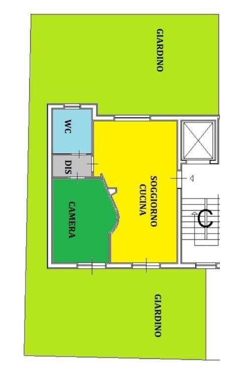 L’appartamento si apre su un accogliente soggiorno con angolo cottura, caratterizzato da una piacevole luminosità naturale e dall’uscita diretta sul giardino, ideale per pranzi e cene all’aperto. Un disimpegno conduce alla camera matrimoniale, anch’essa con accesso esterno, e al bagno finestrato completo di tutti i sanitari. Gli ambienti sono ben distribuiti e garantiscono comfort e funzionalità, perfetti per una coppia o per chi desidera indipendenza e spazi vivibili.