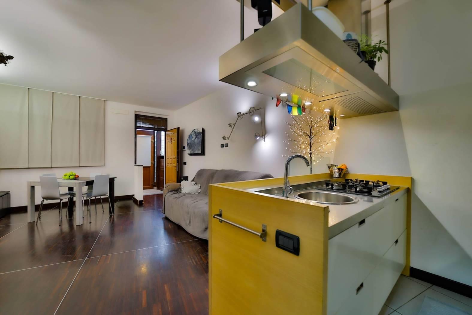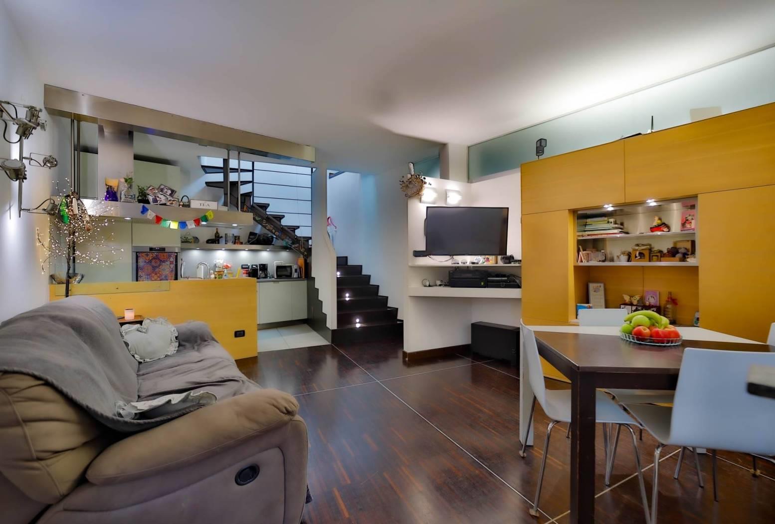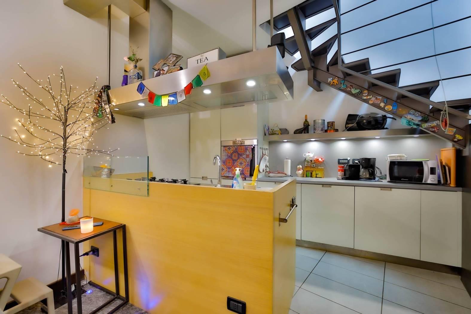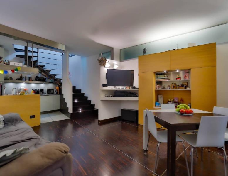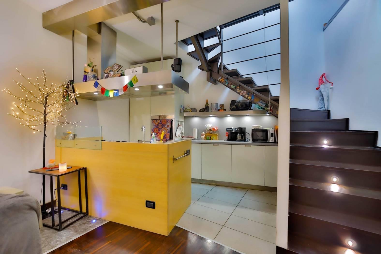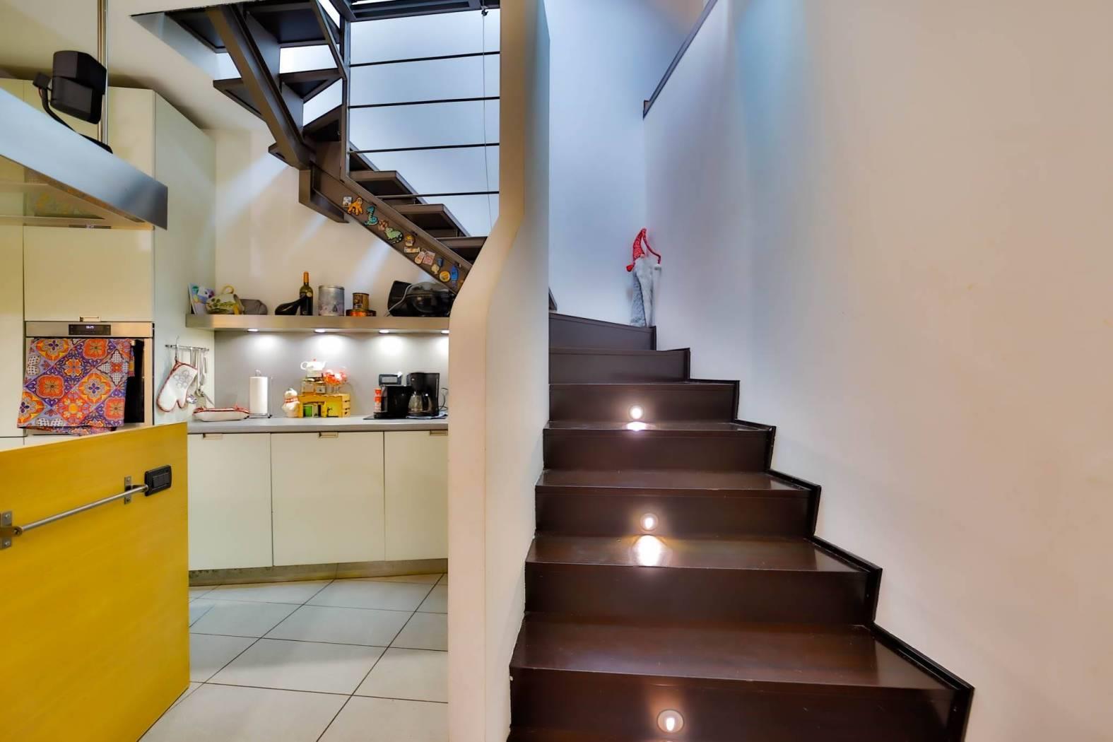 Al piano terra si apre un ampio soggiorno con cucina a vista, uno spazio conviviale e scenografico valorizzato da una scala a vista di design che conduce al piano mansardato e diventa elemento architettonico distintivo della zona giorno. Gli arredi sono completamente su misura e dialogano con finiture ricercate e pavimentazione in parquet che dona continuità ed eleganza agli ambienti.