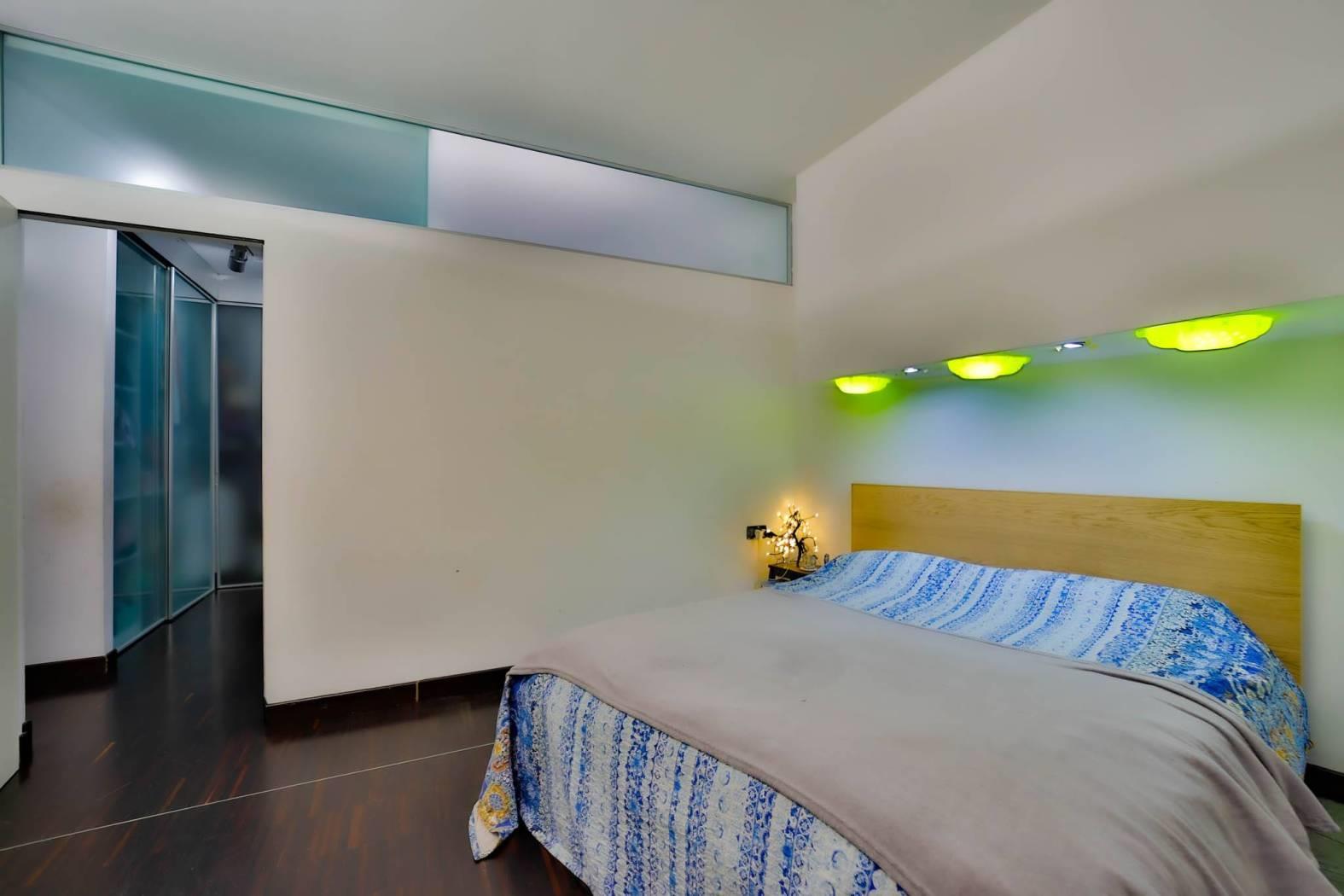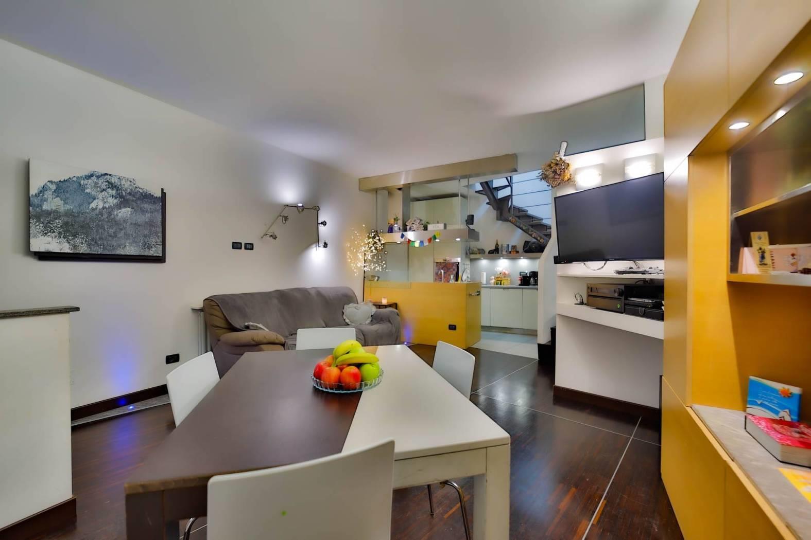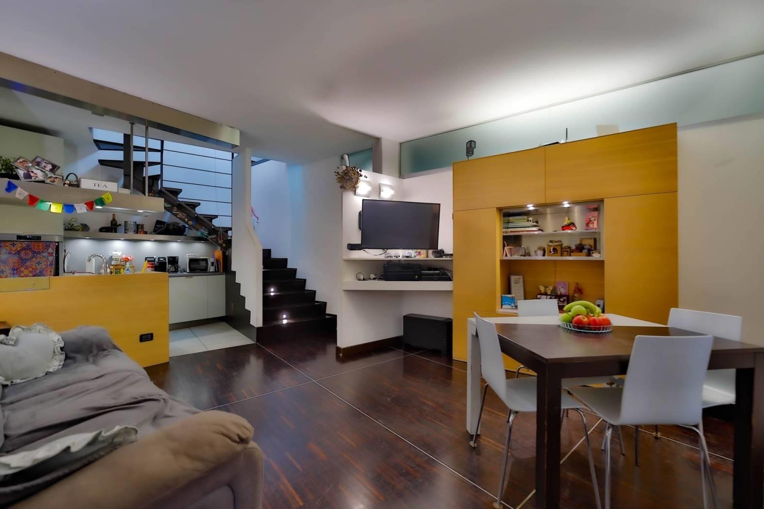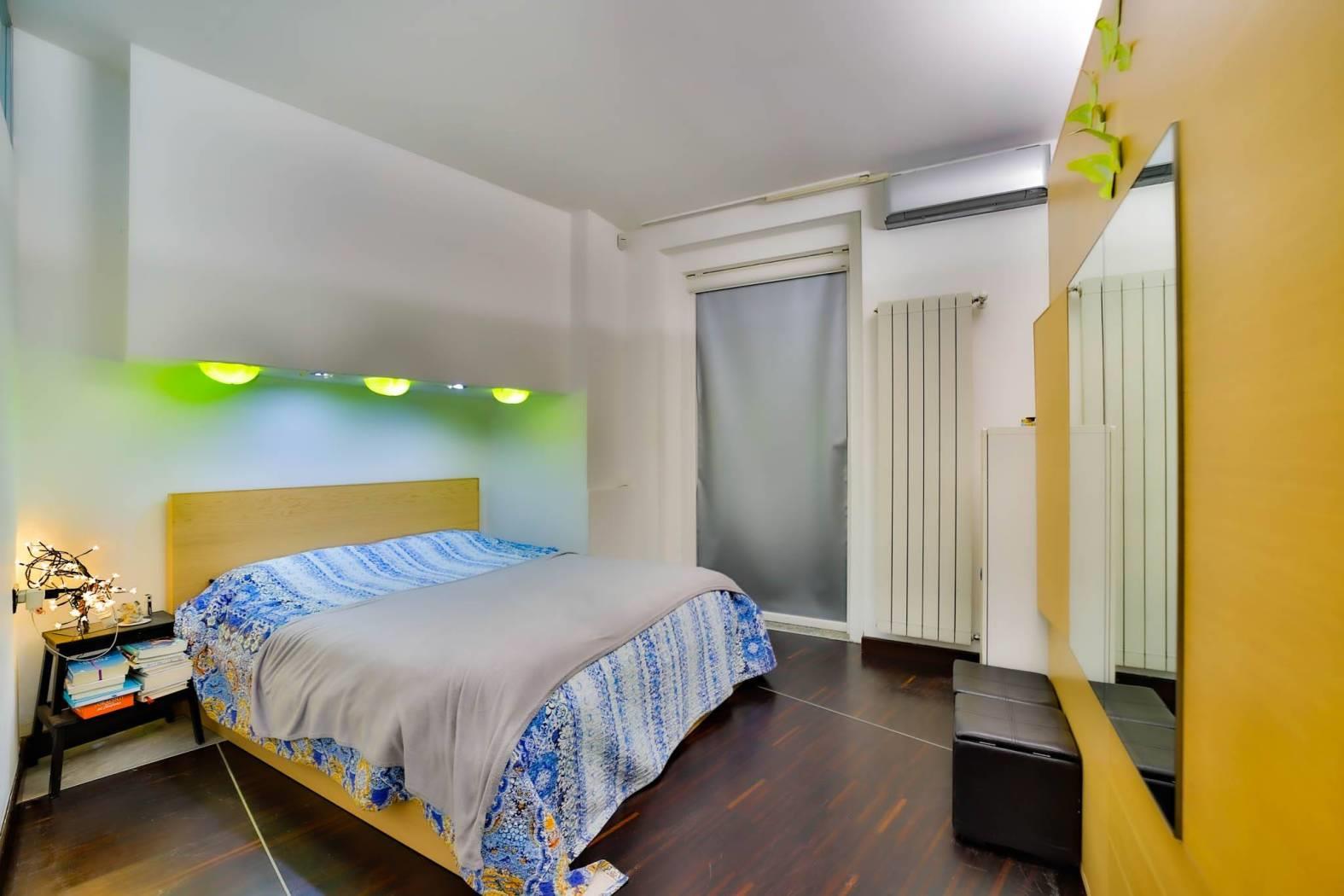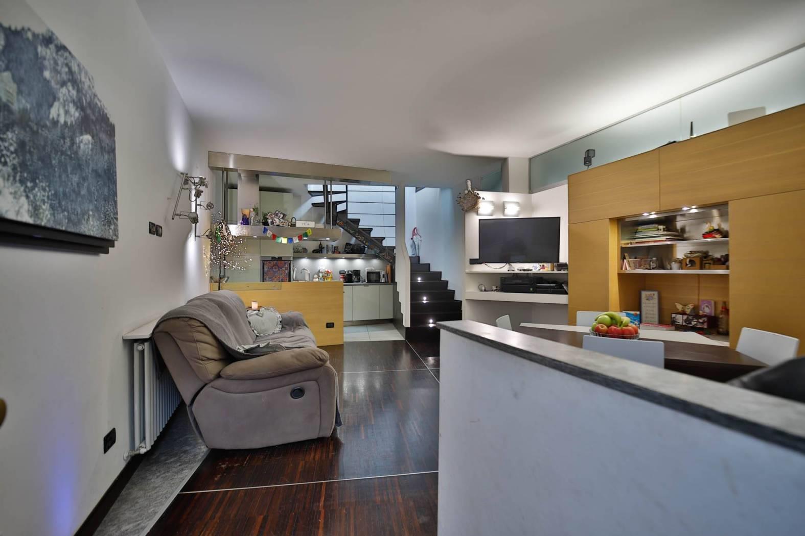 Al piano terra si apre un ampio soggiorno con cucina a vista, uno spazio conviviale e scenografico valorizzato da una scala a vista di design che conduce al piano mansardato e diventa elemento architettonico distintivo della zona giorno. Gli arredi sono completamente su misura e dialogano con finiture ricercate e pavimentazione in parquet che dona continuità ed eleganza agli ambienti.