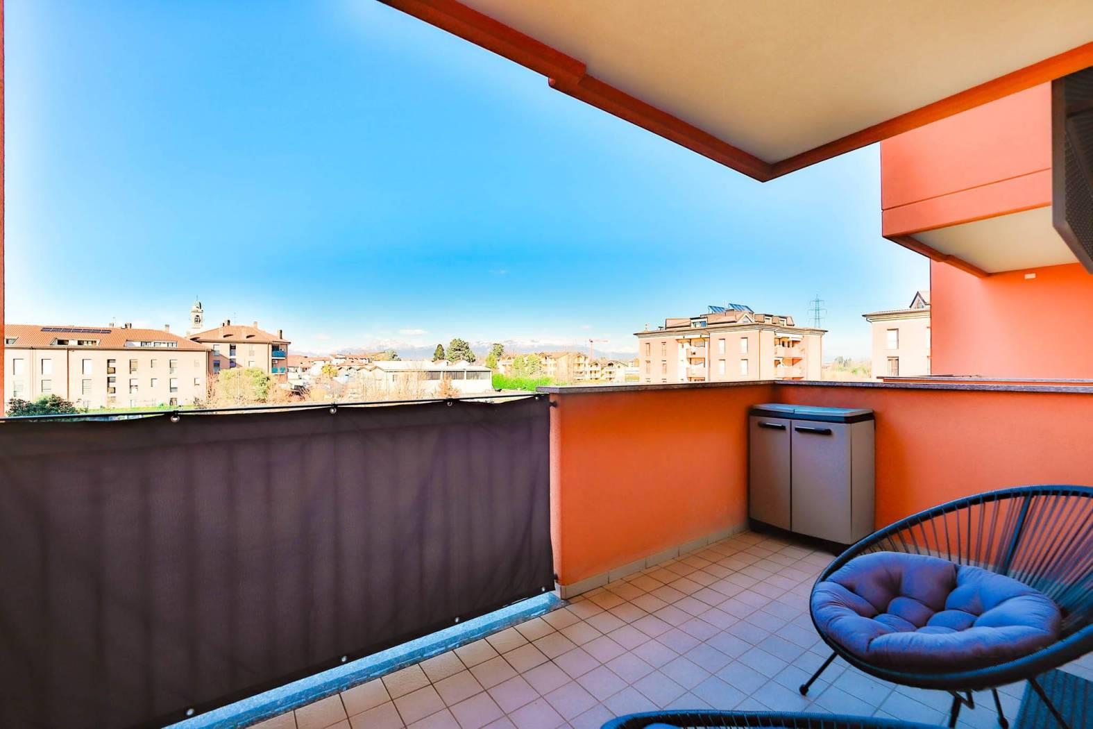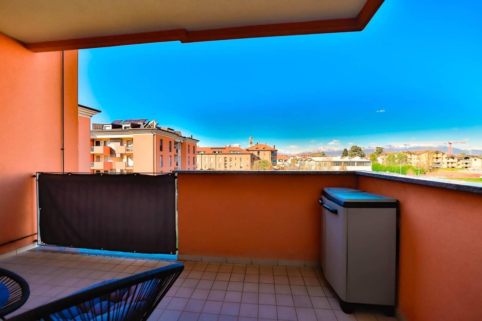 La zona giorno si apre su un soggiorno di taglio quadrato con cucina a vista, il tutto valorizzato da doppia porta finestra (quattro ante da 80cm) che conduce al terrazzo di 9,00mq, ideale per momenti di relax o convivialità all’aperto (con vista aperta sulle montagne).