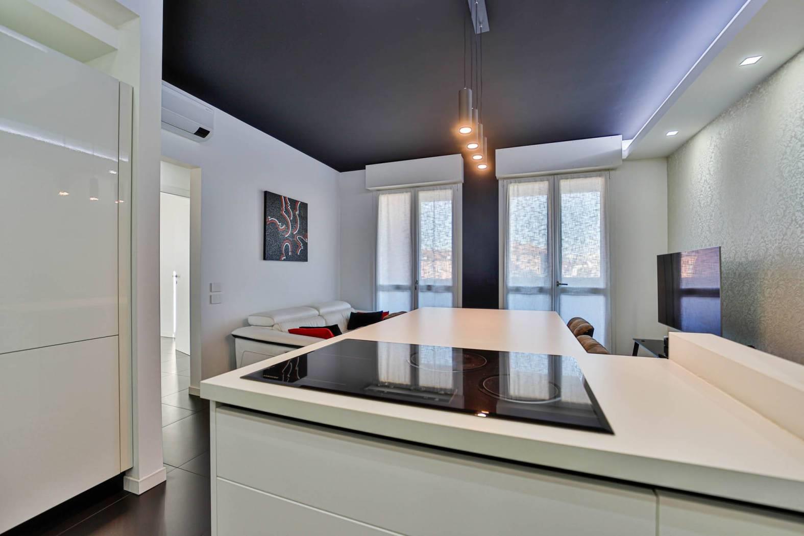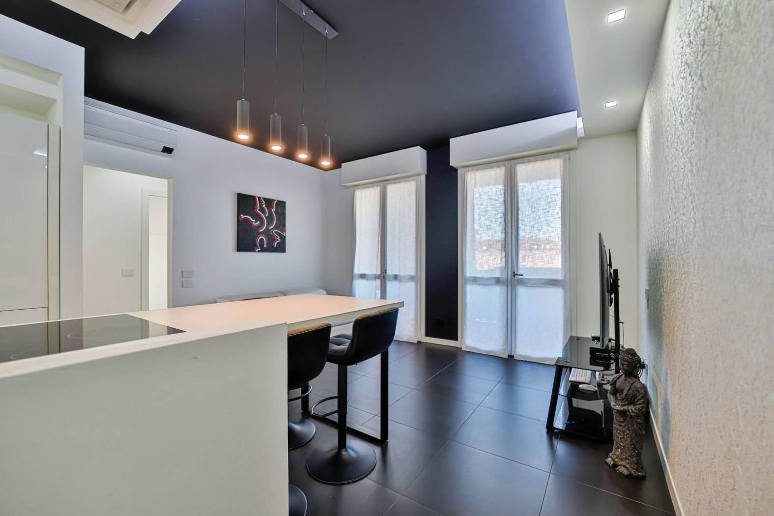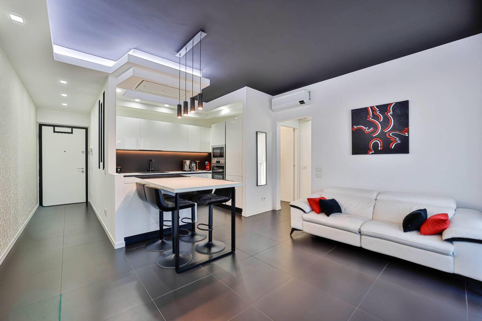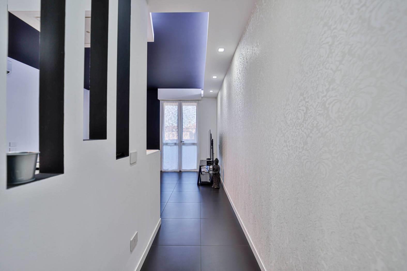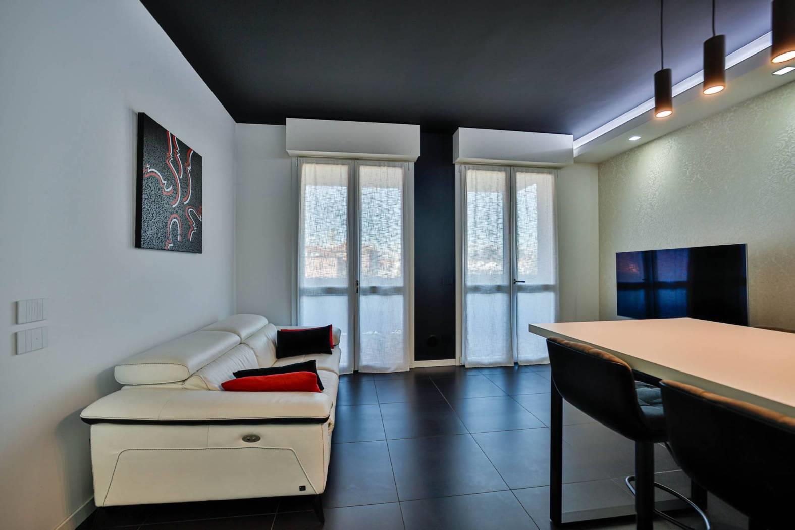 L’appartamento è stato rifinito internamente da un architetto d’interni (abbassamenti, tinteggiature, finiture ed arredo giorno), con uno studio attento degli spazi, dei materiali e delle armonie cromatiche, creando un ambiente moderno, elegante e funzionale.