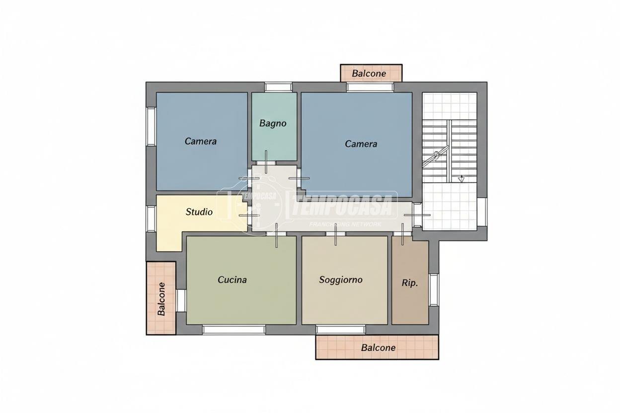 ingresso, soggiorno con accesso al balcone, cucina abitabile con accesso sul balcone, due camere da letto, di cui una con accesso al balcone, studio, ripostiglio e bagno finestrato.