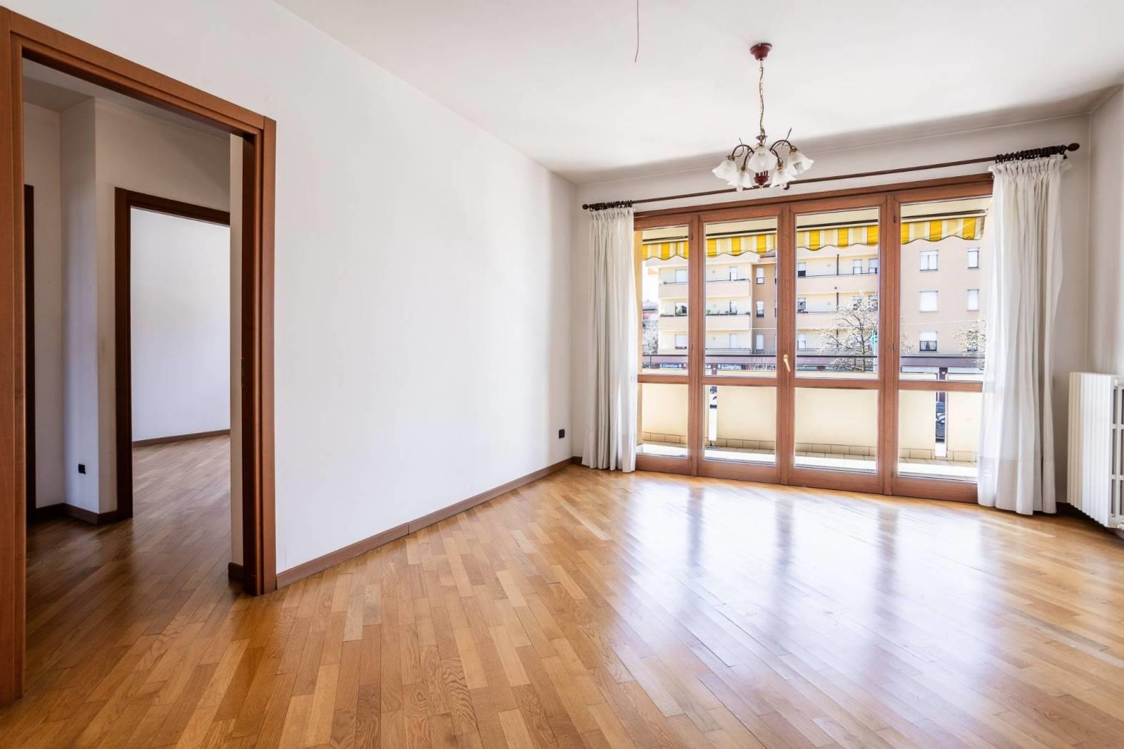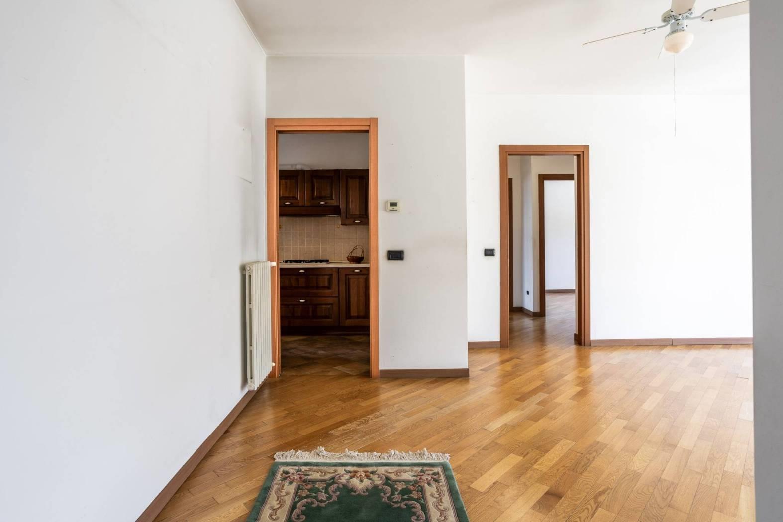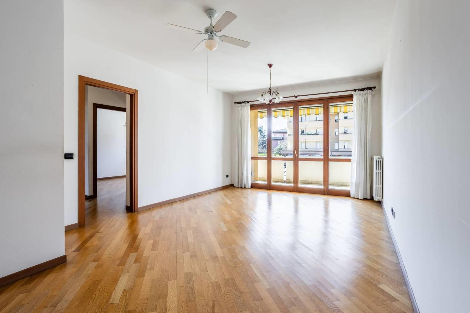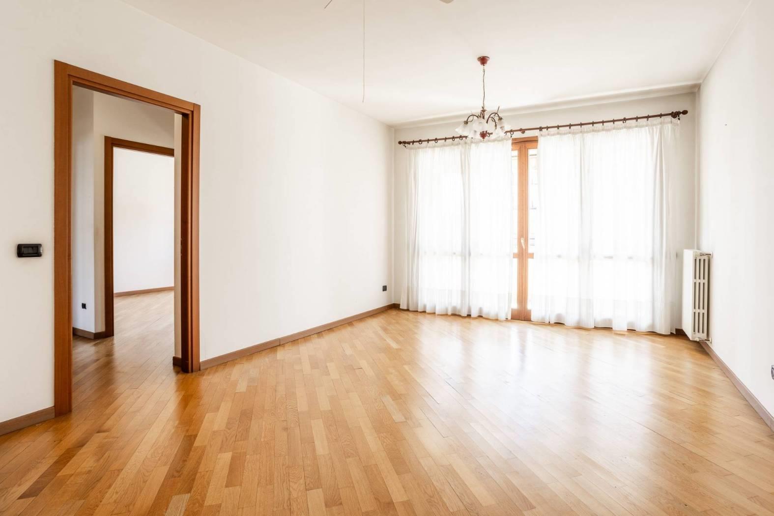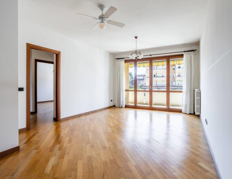 In gradevole contesto residenziale comodo ai servizi, appartamento posto al primo piano dotato di doppio affaccio. Ingresso, soggiorno con ampia porta finestra con uscita sul terrazzo di 10 mq., cucina abitabile con comodo balcone di servizio, disimpegno notte con camera matrimoniale, seconda camera, un bagno finestrato dotato di doccia e un secondo bagno con mezza vasca. L'appartamento si presenta in buono stato di manutenzione e libero subito: parquet sia nella zona giorno che nella zona notte, ceramica in cucina e nei bagni; tapparella motorizzata nel soggiorno. Cantina. Termoautonomo. Ampio box singolo ad € 22.000.