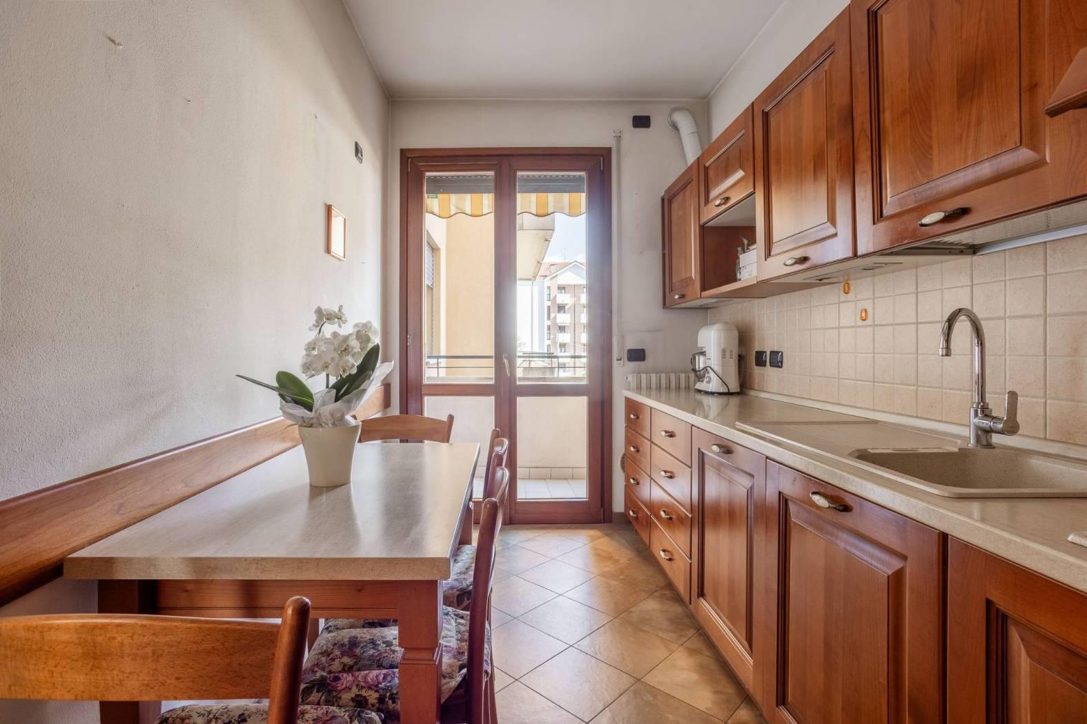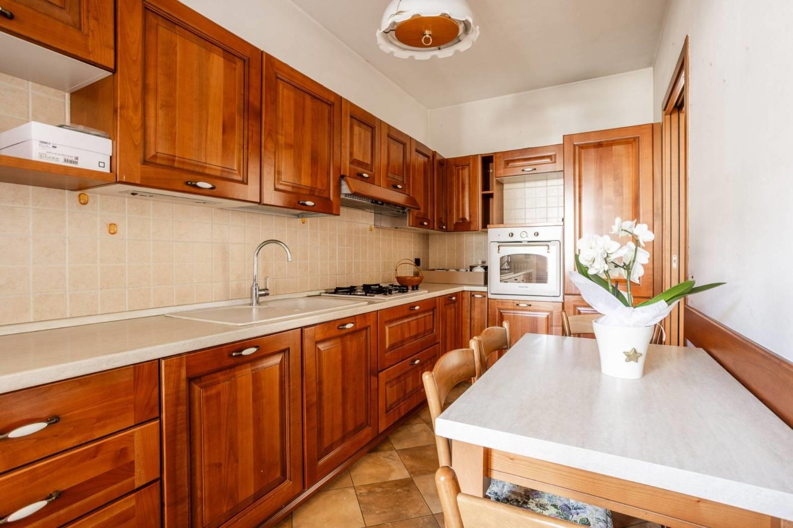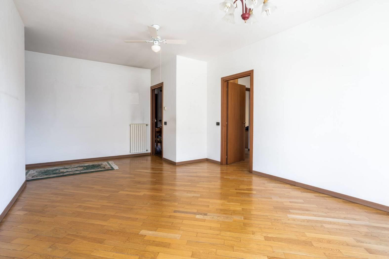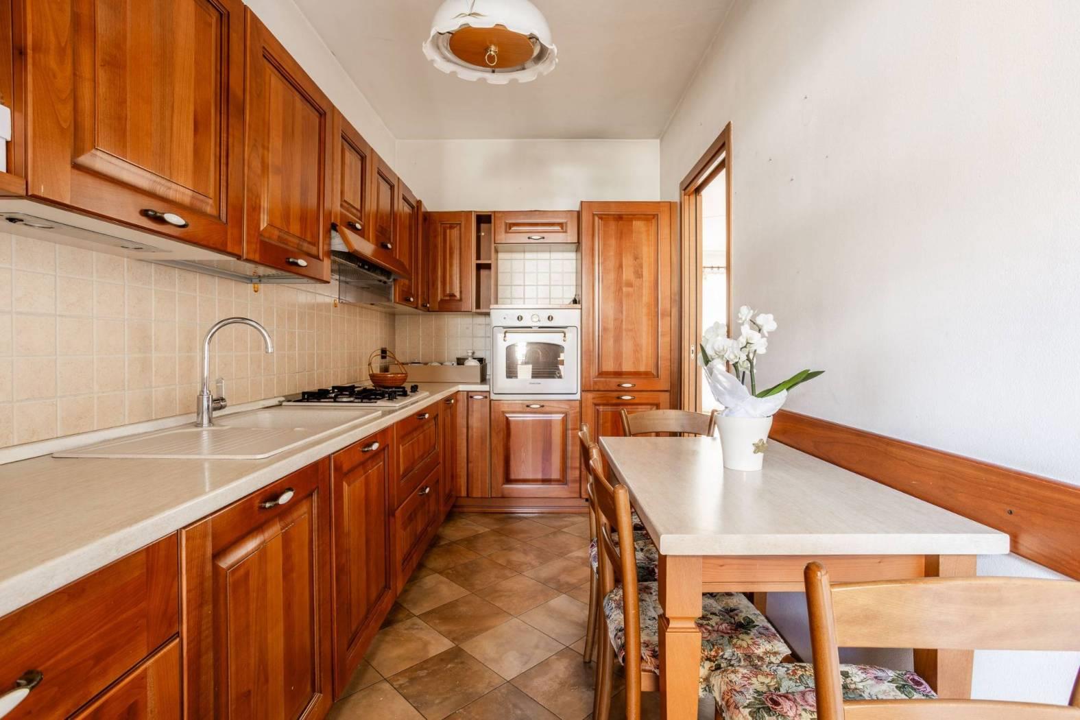In gradevole contesto residenziale comodo ai servizi, appartamento posto al primo piano dotato di doppio affaccio. Ingresso, soggiorno con ampia porta finestra con uscita sul terrazzo di 10 mq., cucina abitabile con comodo balcone di servizio, disimpegno notte con camera matrimoniale, seconda camera, un bagno finestrato dotato di doccia e un secondo bagno con mezza vasca. L'appartamento si presenta in buono stato di manutenzione e libero subito: parquet sia nella zona giorno che nella zona notte, ceramica in cucina e nei bagni; tapparella motorizzata nel soggiorno. Cantina. Termoautonomo. Ampio box singolo ad € 22.000.