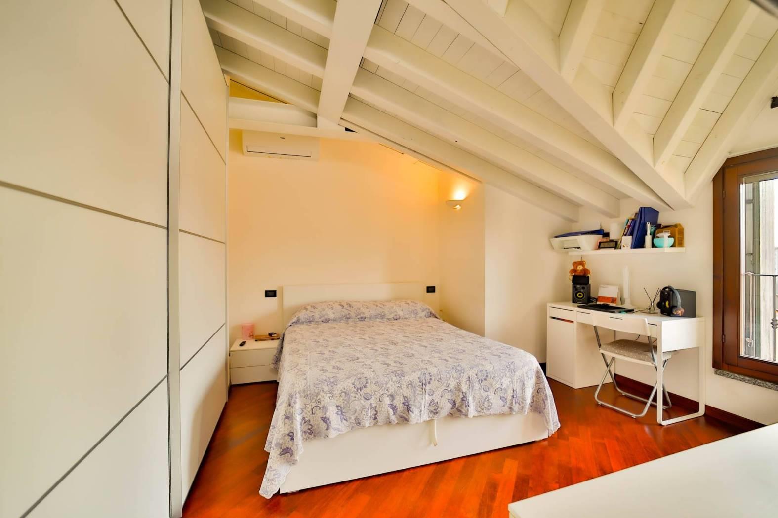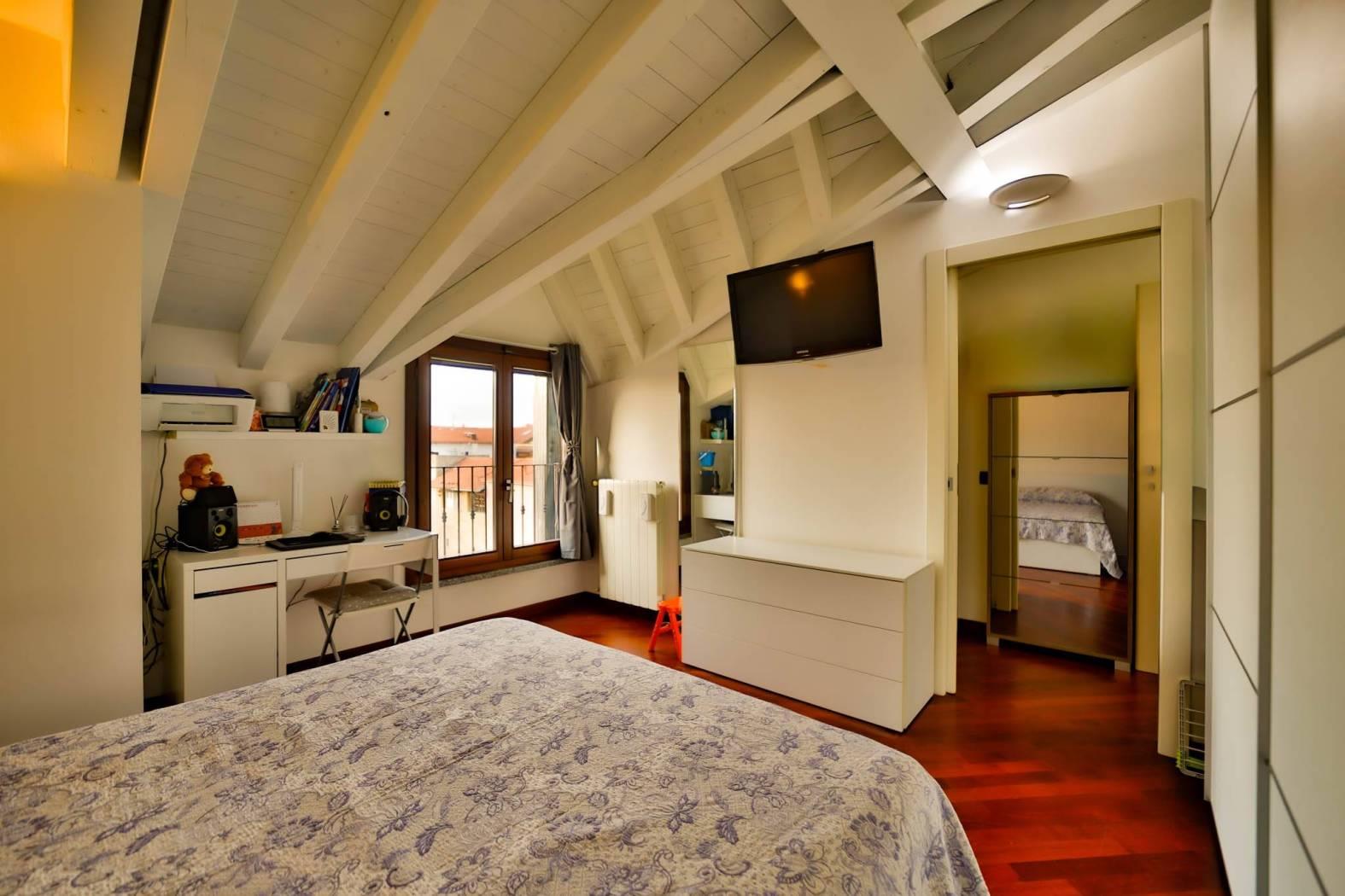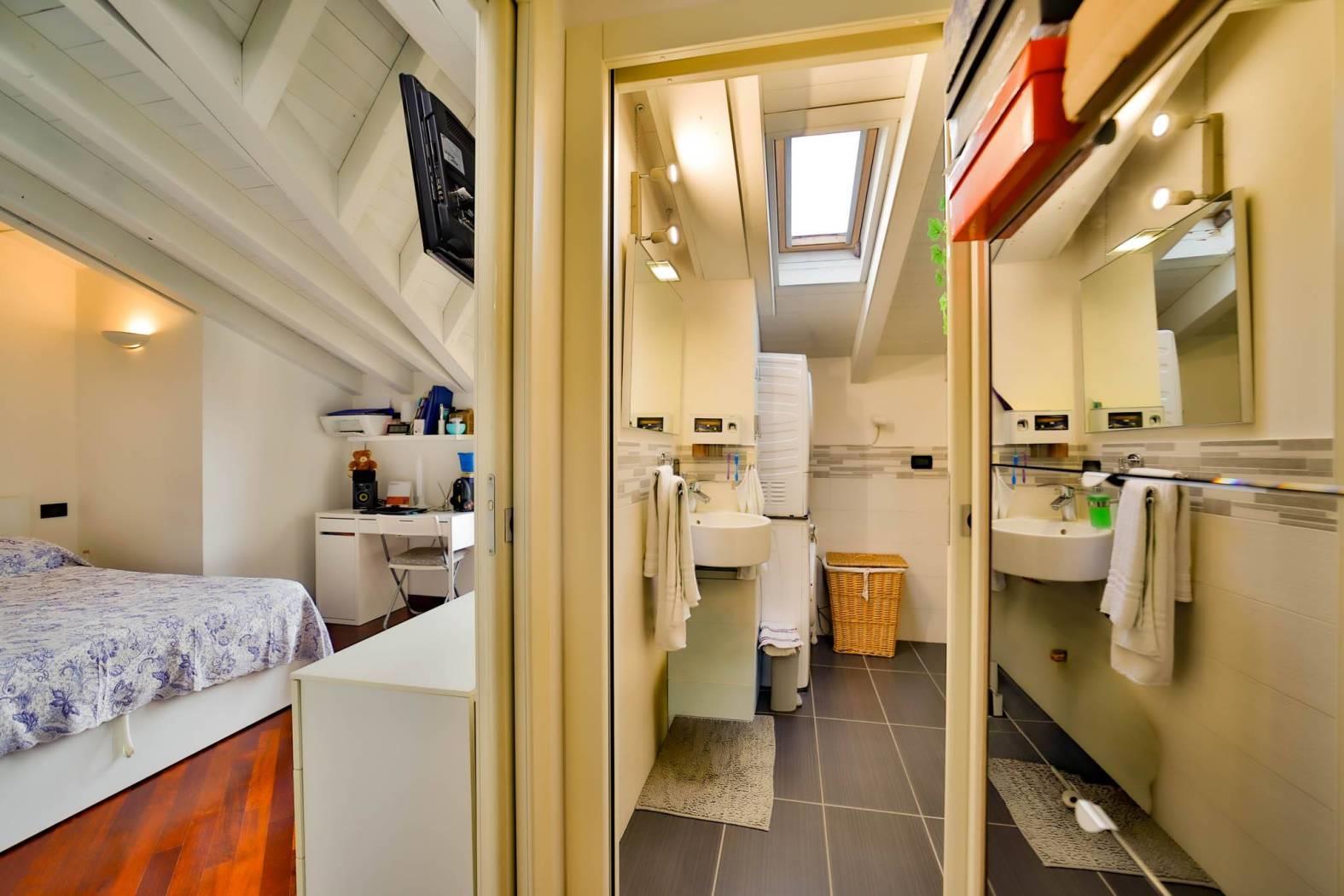 Un comodo disimpegno conduce al bagno – completamente rifatto nel 2015 – e alla spaziosa camera matrimoniale, entrambi ambienti mansardati con travi a vista che regalano un fascino unico e ricercato.