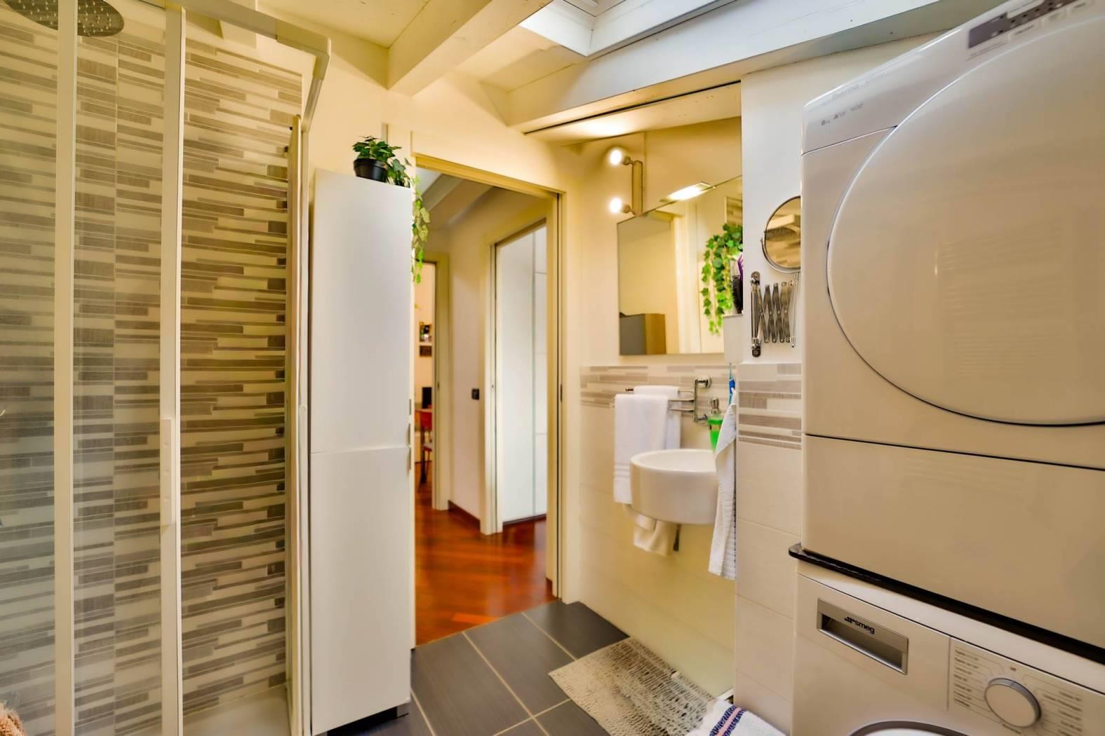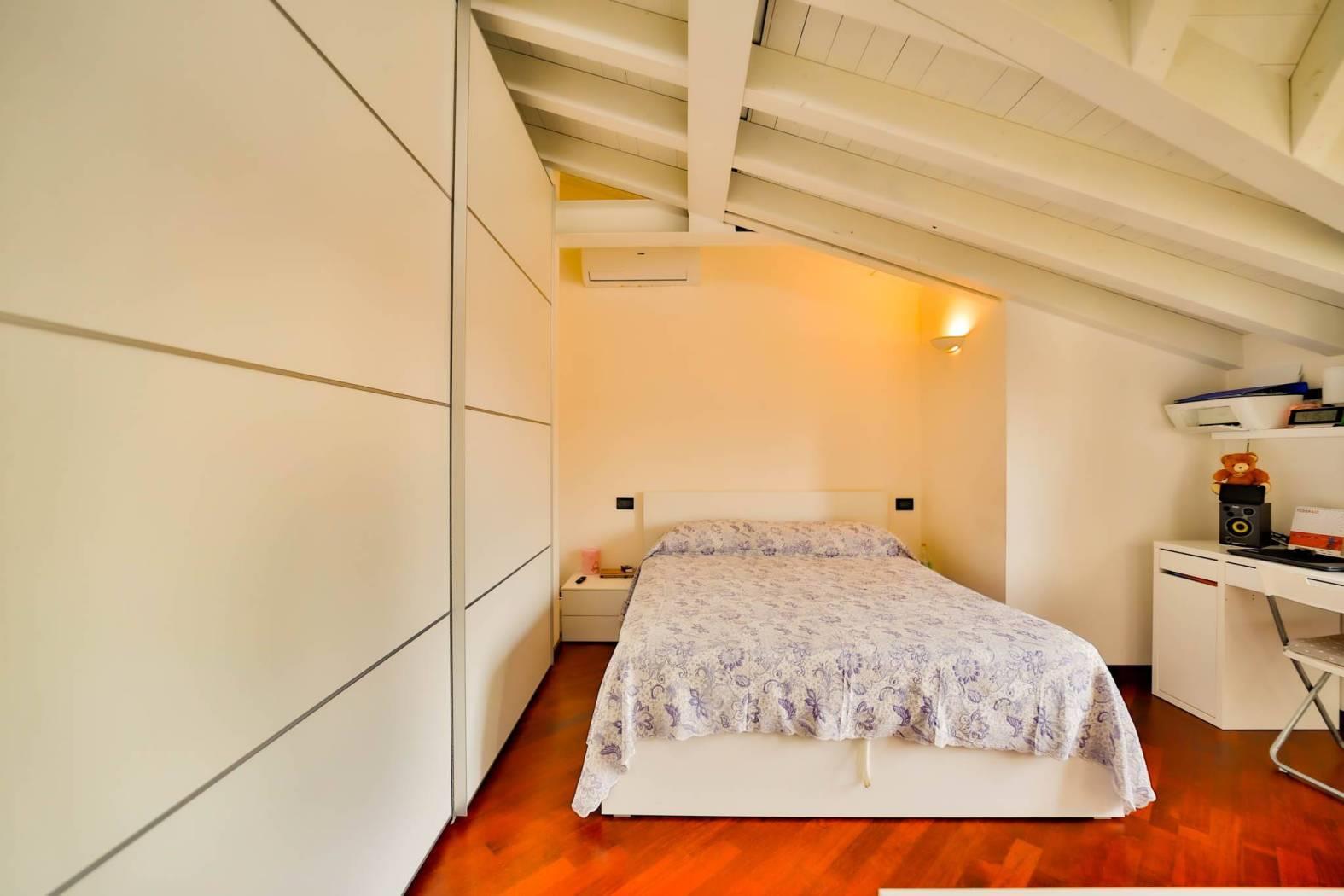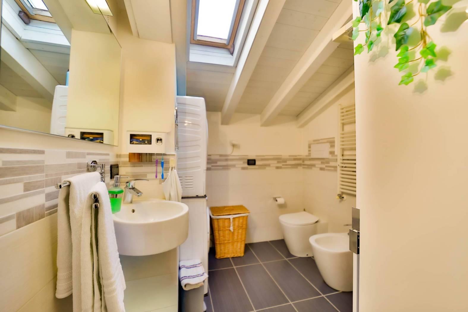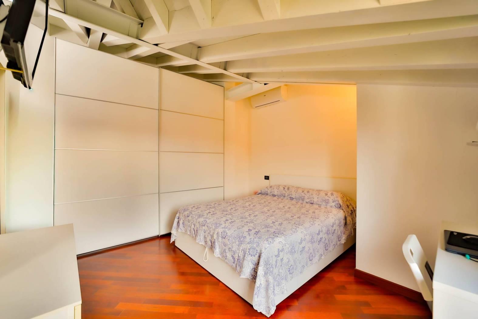 Un comodo disimpegno conduce al bagno – completamente rifatto nel 2015 – e alla spaziosa camera matrimoniale, entrambi ambienti mansardati con travi a vista che regalano un fascino unico e ricercato.