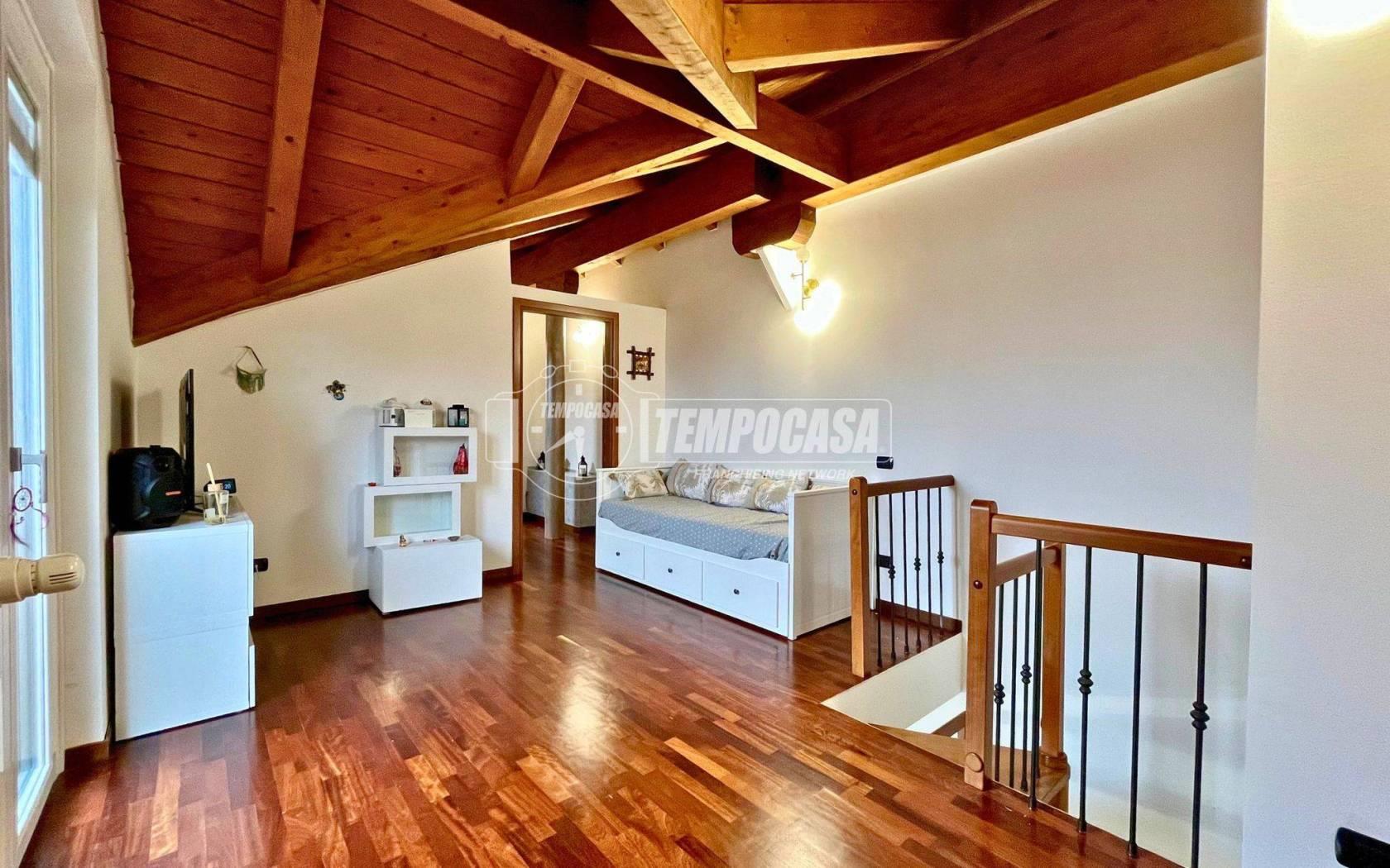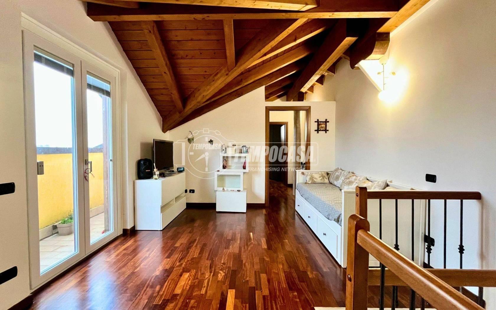 Una scala interna conduce al secondo livello dove troviamo una zona openspace sfruttabile come spazio extra, con accesso al secondo balcone, disimpegno, due camere da letto di generose dimensioni e un secondo bagno con lucernario, dotato di vasca e doccia. Le travi in legno a vista donano calore ed eleganza all’ambiente.