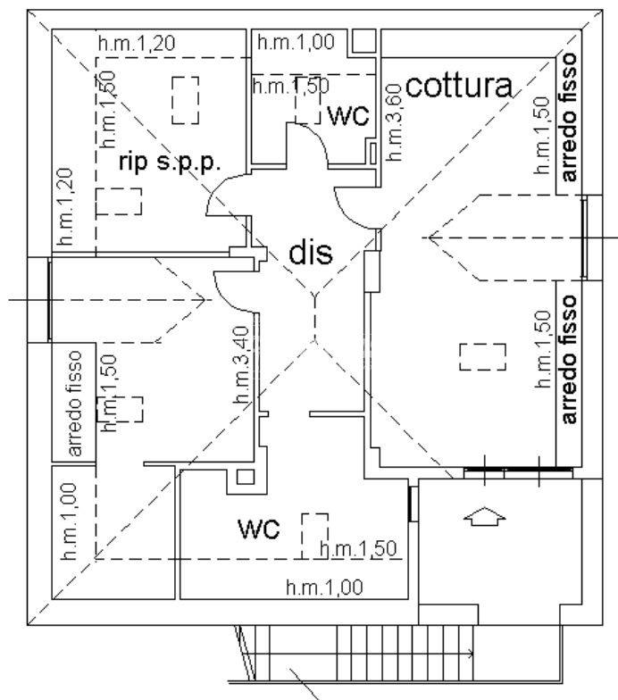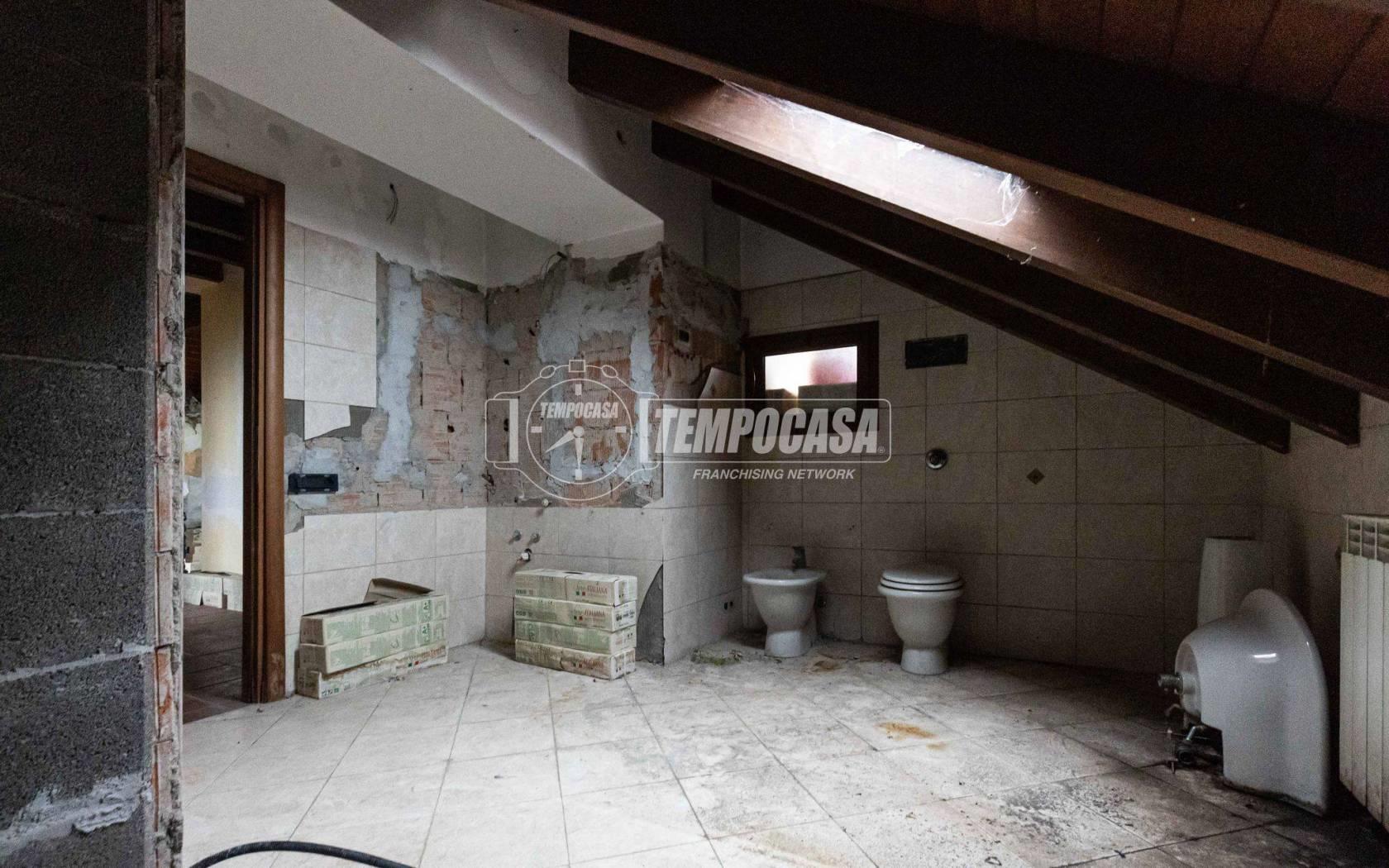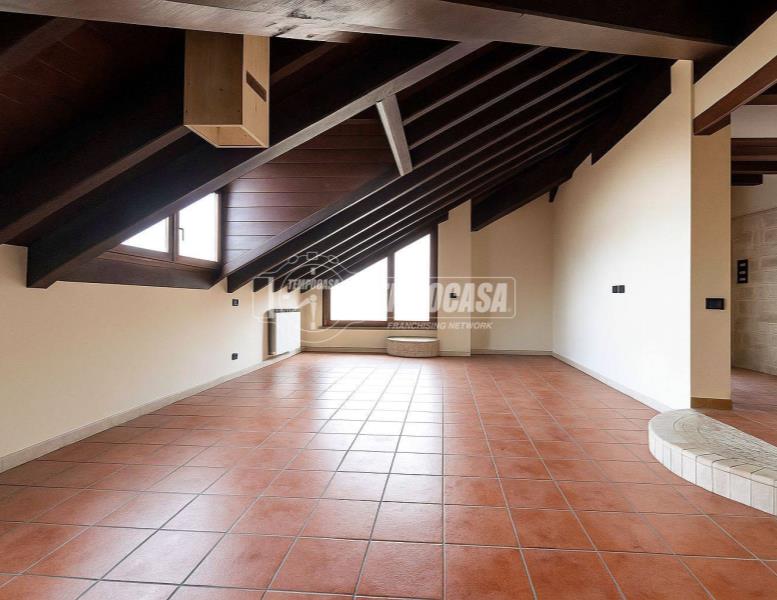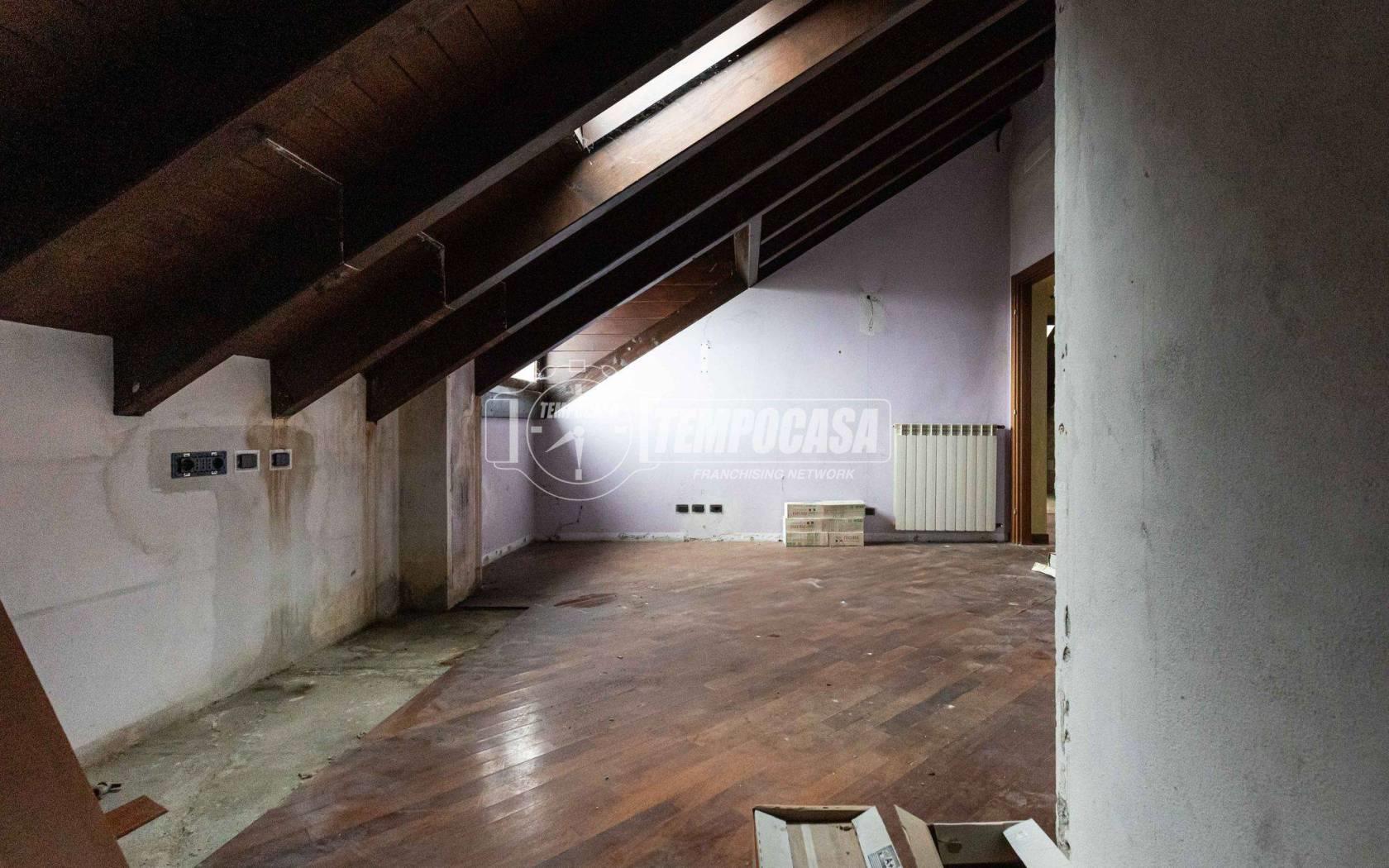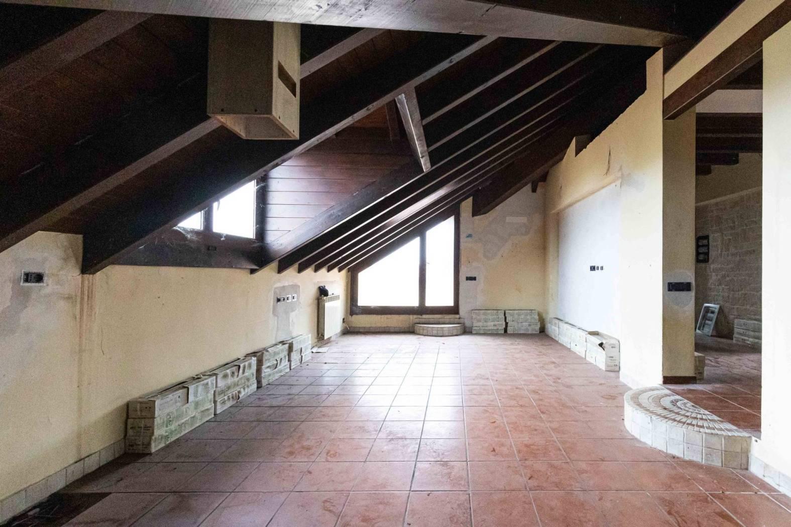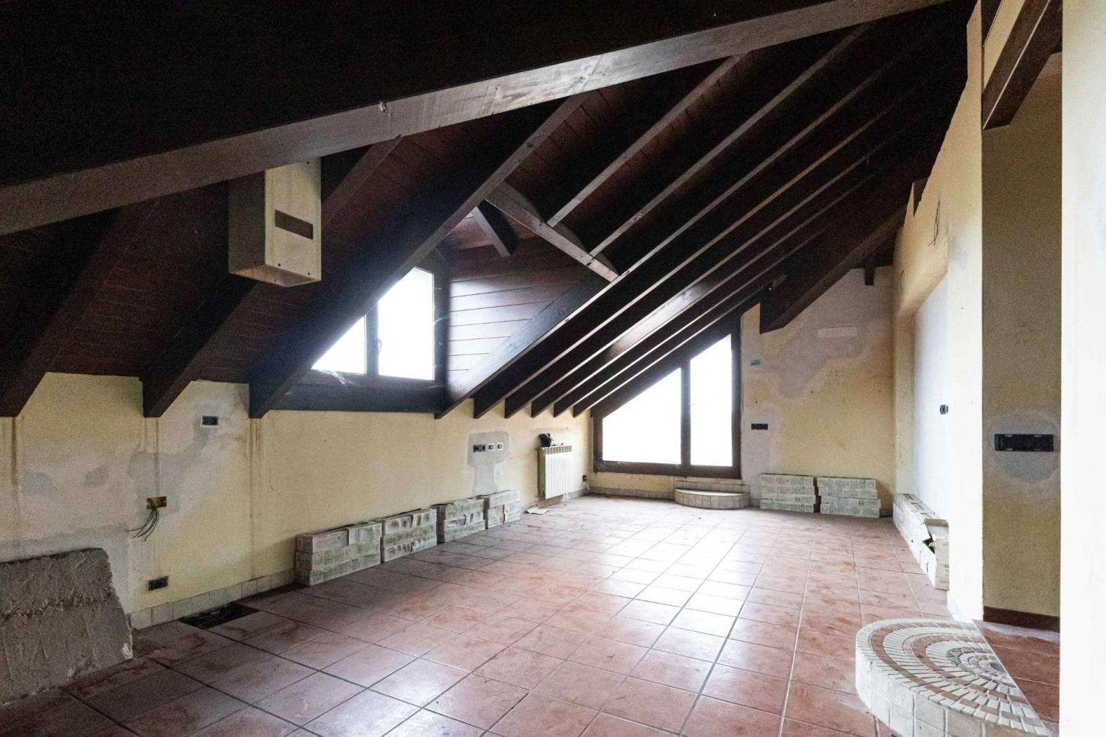 Appartamento mansardato di circa 90 mq al piano secondo di villa singola tri-famigliare (in verticale) composto da ingresso su terrazzo di proprietà, grande salone con cucina a vista, camera da letto con cabina armadio, seconda camera da letto o cameretta, anticamera con grosso corridoio, grande bagno da ristrutturare, locale ripostiglio/caldaia/dispensa con lavandino e attacco lavatrice.