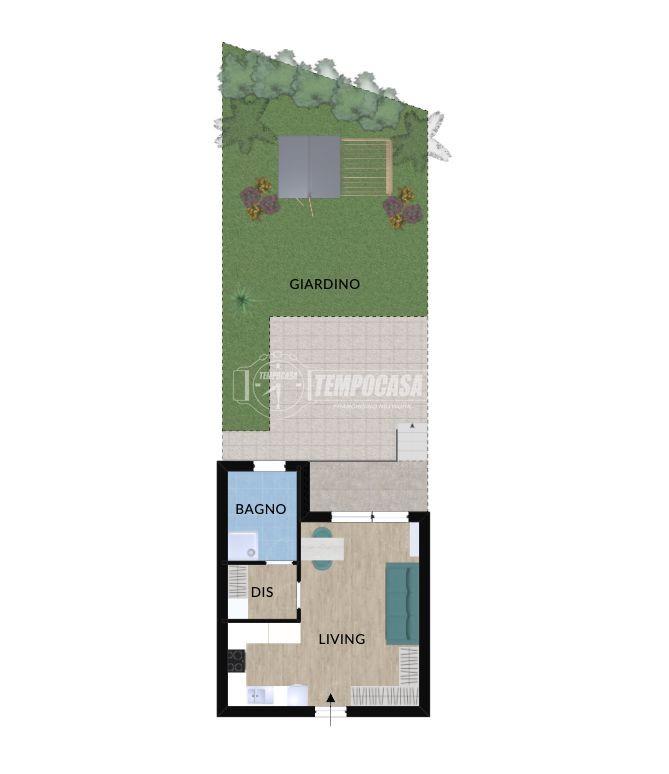zona living con cucina a vista, bagno finestrato completo di box doccia, accesso diretto all'esterno, dove si estende un giardino di proprietà.