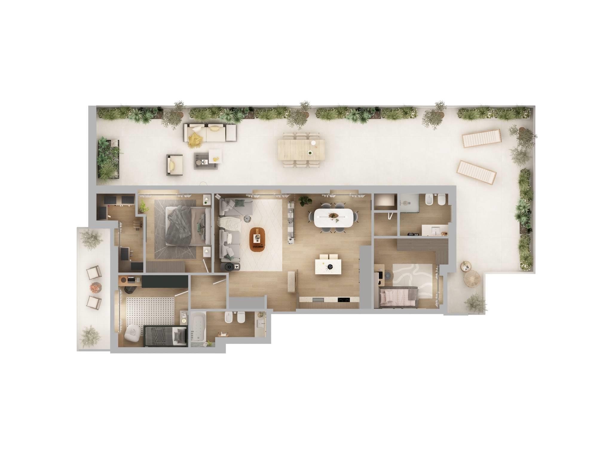 Disposto su un unico livello, l'attico si apre su un ampio soggiorno Living con spazio cucina, penisola e tavolo da pranzo, un terrazzo di 100 mq ideale per vivere all'aperto, un bagno finestrato e una camera da letto. La zona notte comprende una camera matrimoniale con cabina armadio, una cameretta e un bagno cieco.