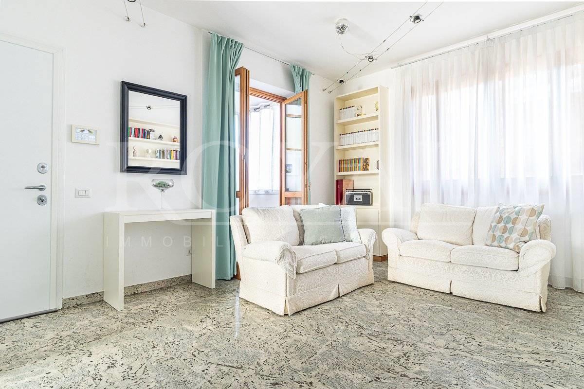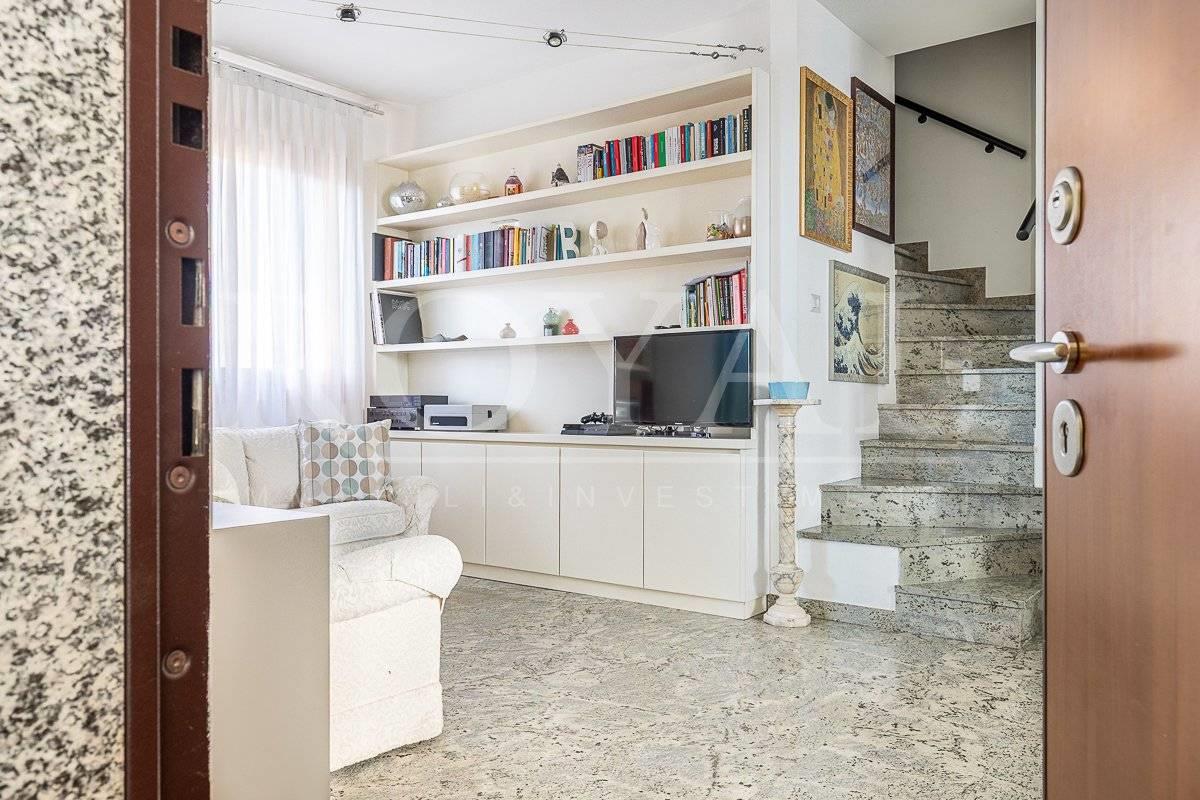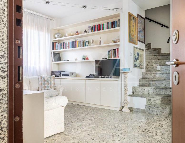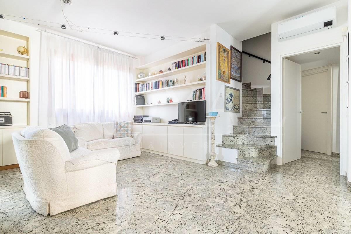 L'immobile è inserito in un contesto condominiale del 1994 dotato di ascensore e giardino condominiale. Al piano terzo, troviamo un ingresso, ampia zona giorno con cucina abitabile a vista con balcone loggiato, disimpegno notte con due camere da letto, bagno finestrato ed un locale studio. Tramite una scala in muratura si accede al piano quarto, locale sottotetto agibile ma non abitabile con ampio vano open space con zona living con affaccio sul terrazzo e locale lavanderia. Internamente si presenta in ottimo stato di manutenzione interna con bagno e locale lavanderia rifatti nel 2024 e finiture eleganti e di qualità. Come pavimentazione abbiamo marmo nella zona giorno, parquet nella zona notte e ceramica nei servizi. Sono presenti dotazioni interessanti come impianto di aria condizionata, impianto di allarme, ventilazione meccanica, infissi legno doppiovetro con oscuranti a protezione, portone blindato. Dotato delle certificazioni degli impianti elettrico e idrico.