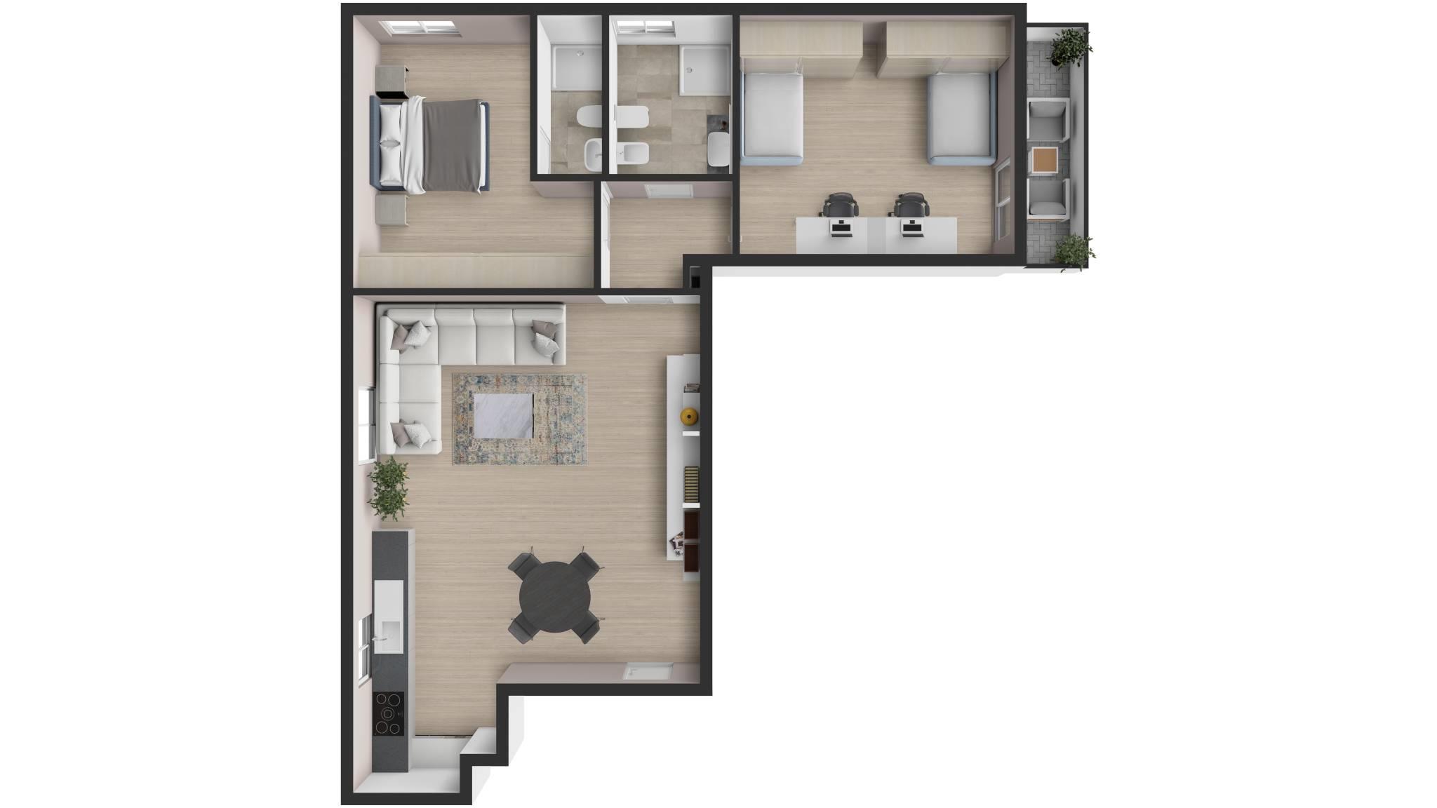 Nella parte notte troviamo a raggiera una camera con bagno in suite, un bagno finestrato disimpegnato e una ampia camera matrimoniale.