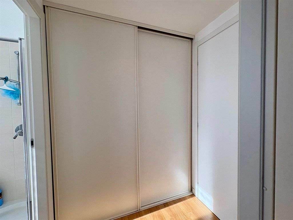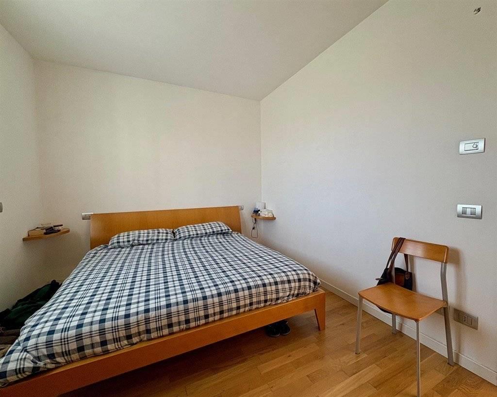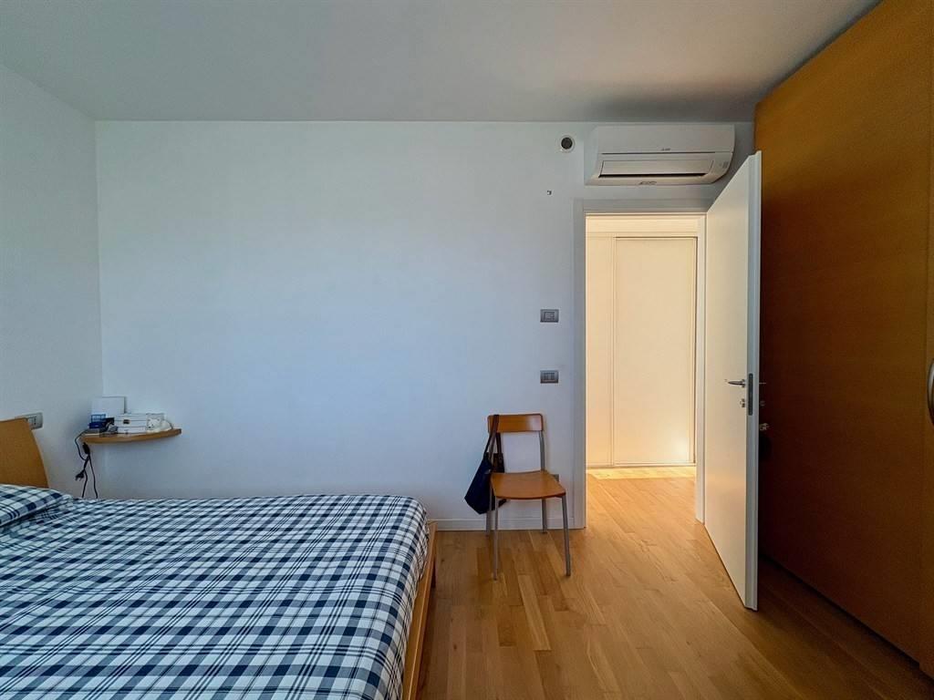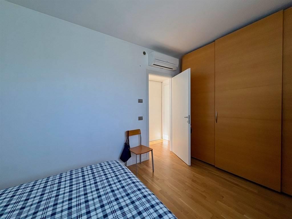 Il disimpegno ospita una funzionale armadiatura su misura — progettata per integrare anche la zona lavanderia — e conduce alla camera matrimoniale di ampie dimensioni e al bagno finestrato dotato di un’ampia doccia.
