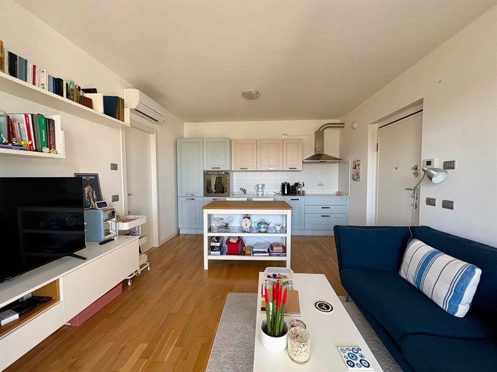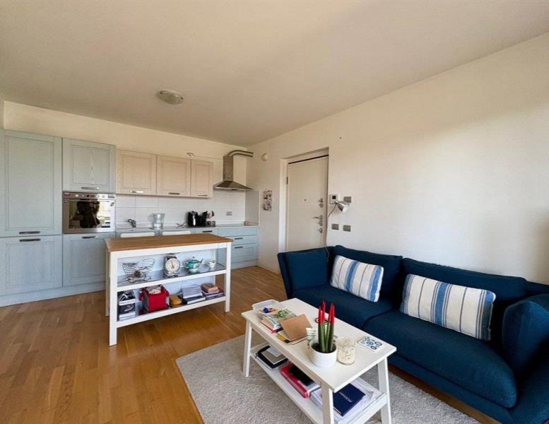 La zona giorno, luminosa e funzionale, si apre sull’angolo cottura e conduce al balcone ampio e vivibile.