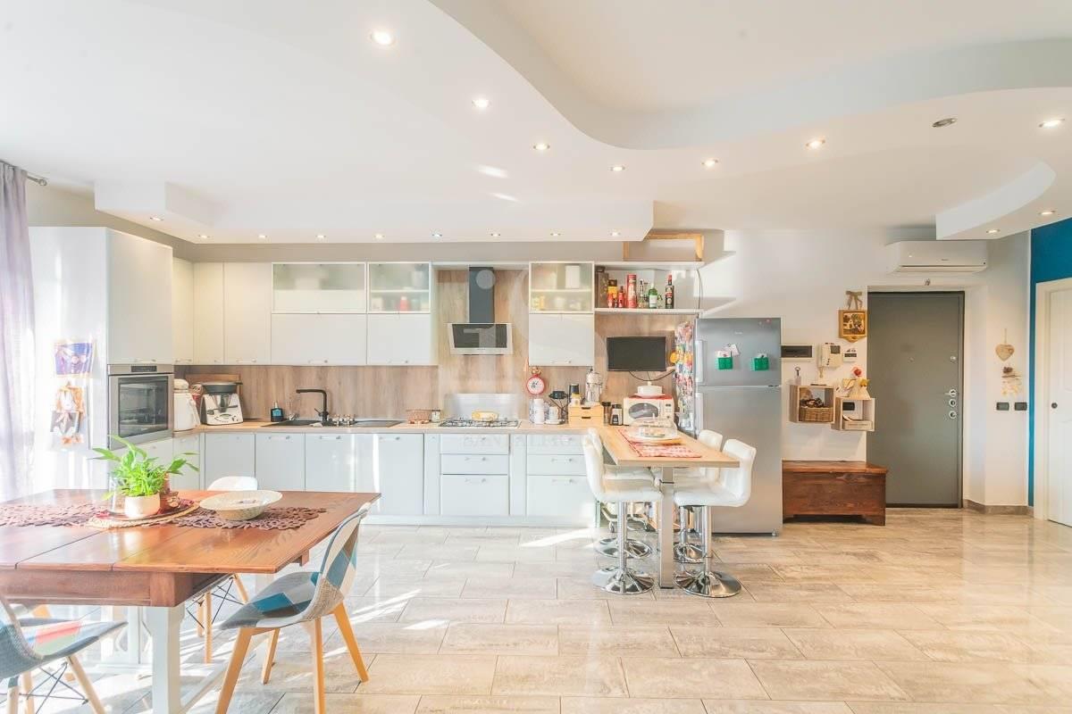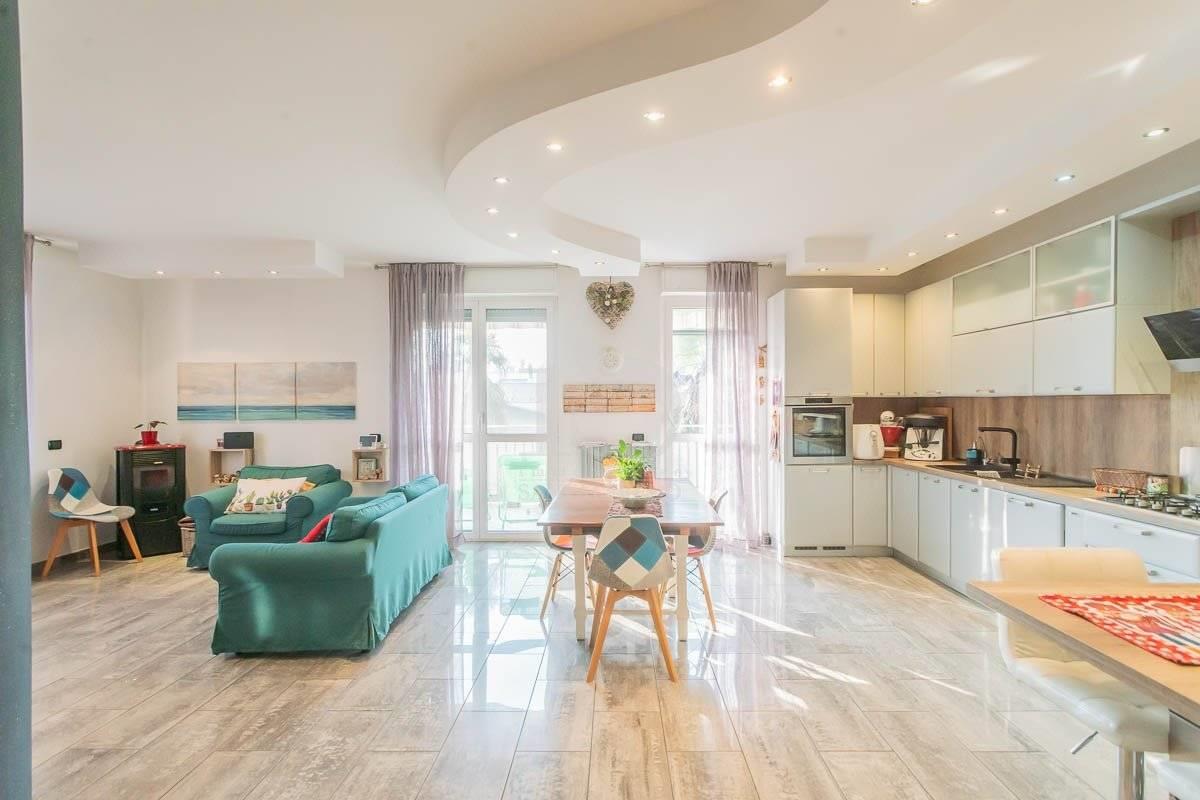 L'ingresso si apre su una zona giorno ampia e luminosa, con soggiorno e cucina a vista perfettamente integrati.