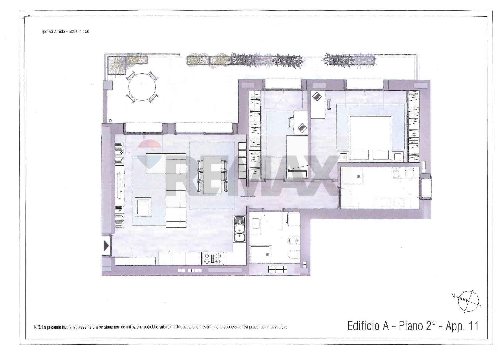 Nella palazzina A, l'appartamento n. 11 (mq. 118 ) è un 3 locali posto al secondo piano con ascensore composto da : ampia zona giorno in cui grandi vetrate affacciano su un terrazzo coperto (mq. 30) da arredare secondo le proprie necessità e che diventa un proseguimento naturale dell'abitazione in cui godersi cene con gli amici, cucina a vista, disimpegno, camera matrimoniale, cameretta, doppi servizi.