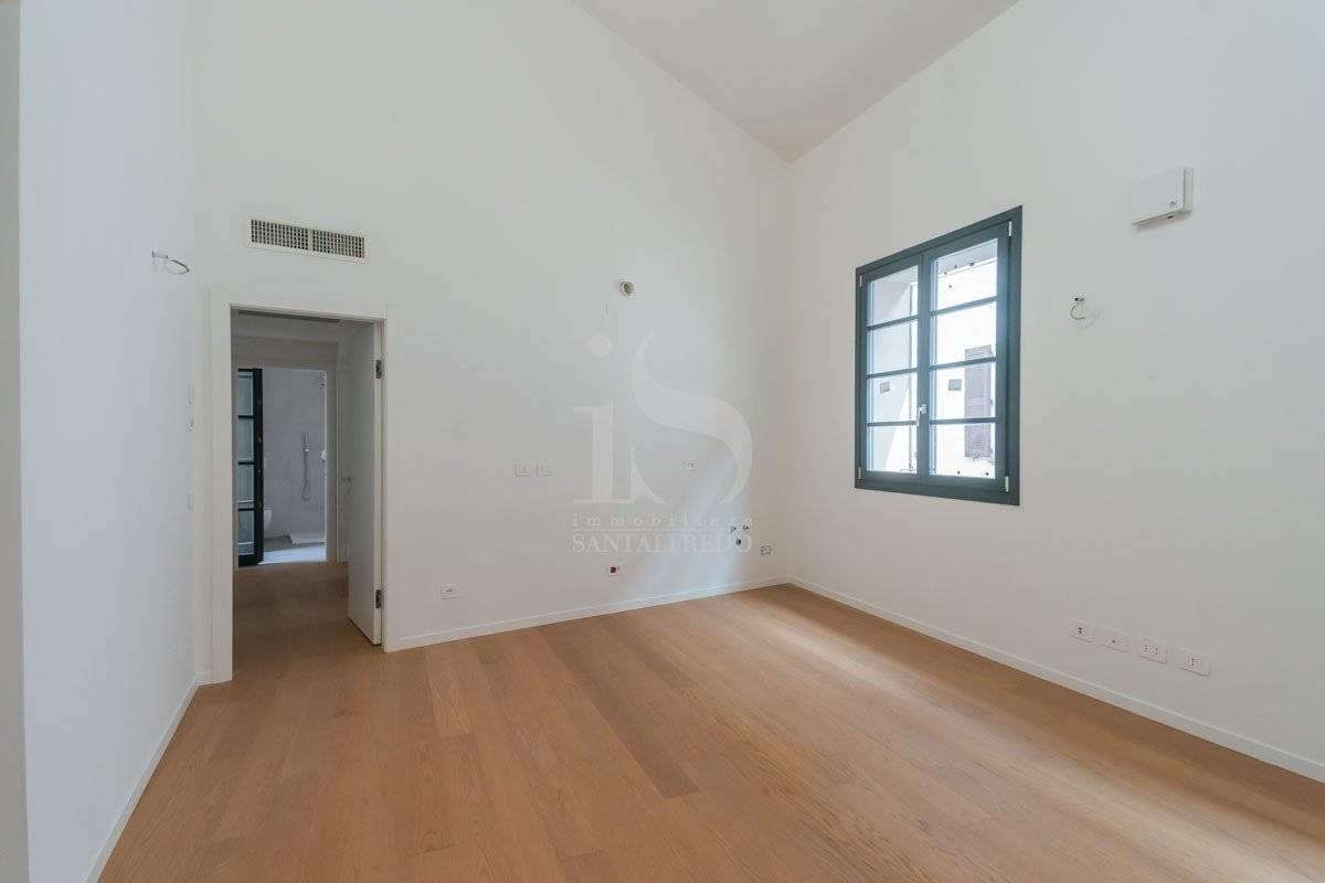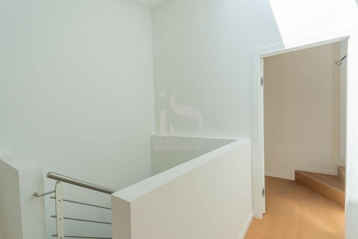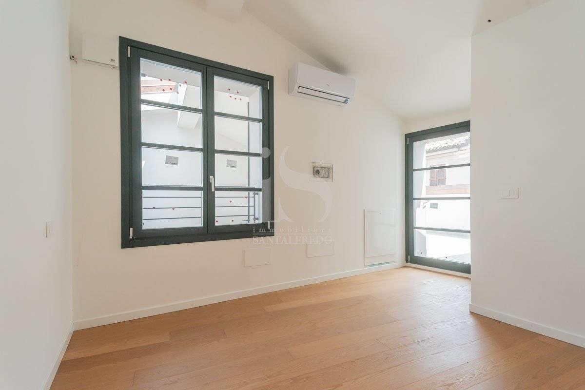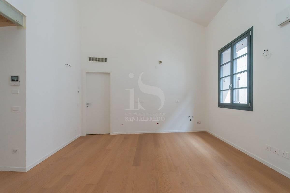 L'anima dell'appartamento è l'ampia zona giorno open-space: lo spazio della cucina si integra con discrezione, mentre due grandi finestre inondano di luce l'area giorno. Il soffitto aperto sul piano superiore amplifica spazio e luminosità, regalando una scenografica continuità verticale.