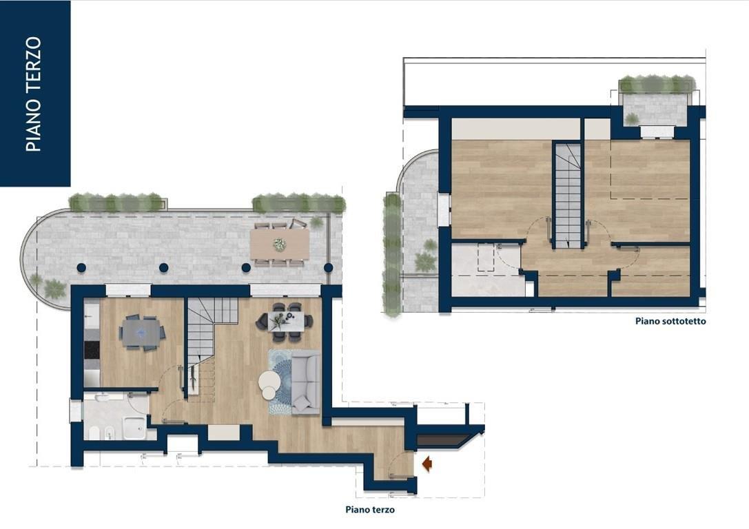 In tranquilla zona residenziale servita ed adiacente al centro a soli 800 metri dalla stazione proponiamo in nuovo complesso in classe energetica "A" appartamenti con ampi terrazzi all'ultimo piano composti da soggiorno, cucina abitabile, bagno al 3° piano, oltre 2 stanze ed un altro bagno al piano mansardato rifinito con travi in legno a vista. Disponibili: App. 12B di 119 mq oltre 26 mq terrazzi ad € 316.000; APP 11A di 123 mq oltre 39 mq di terrazzi ad € 341.000; APP 11B di 138 mq oltre 49 di terrazzi ad € 387.000; APP. 13B di 139 mq oltre 53 mq di terrazzi ad € 388.000. Possibilità scelta finiture interne o suddivisione degli spazi. Cantine comprese e possibilità box singoli o doppi e posti moto. Immobile costruito con le migliori tecnologie per il risparmio energetico, facciata con cappotto, riscaldamento a pavimento con sistema ibrido a pompa di calore, impianto di ventilazione meccanica controllata, impianto fotovoltaico. ESSENDO UN RECUPERO EDILIZIO VI E' LA POSSIBILITA' DI USUFRUIRE DI SGRAVI FISCALI. CONSEGNA FINE 2026.