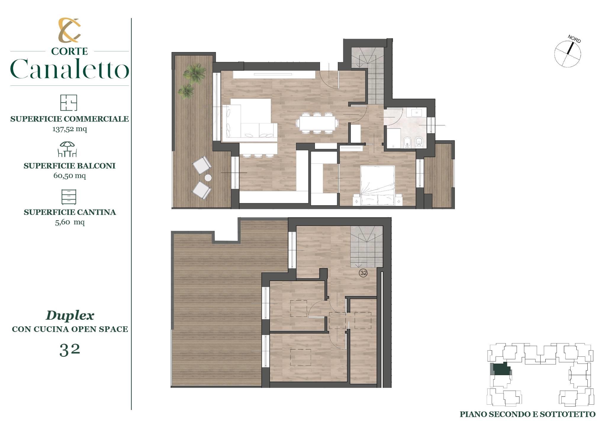 L'appartamento "32" è un appartamento Duplex al secondo piano più sottotetto ed è così composto: soggiorno open space con cucina semi abitabile con affaccio su terrazzo, una generosa camera matrimoniale con cabina armadio al piano e un servizio. Al piano superiore troviamo altri due ambienti più lavanderia e ampio terrazzo. Completa la proprietà la cantina. Possibilità di box singoli o doppi.