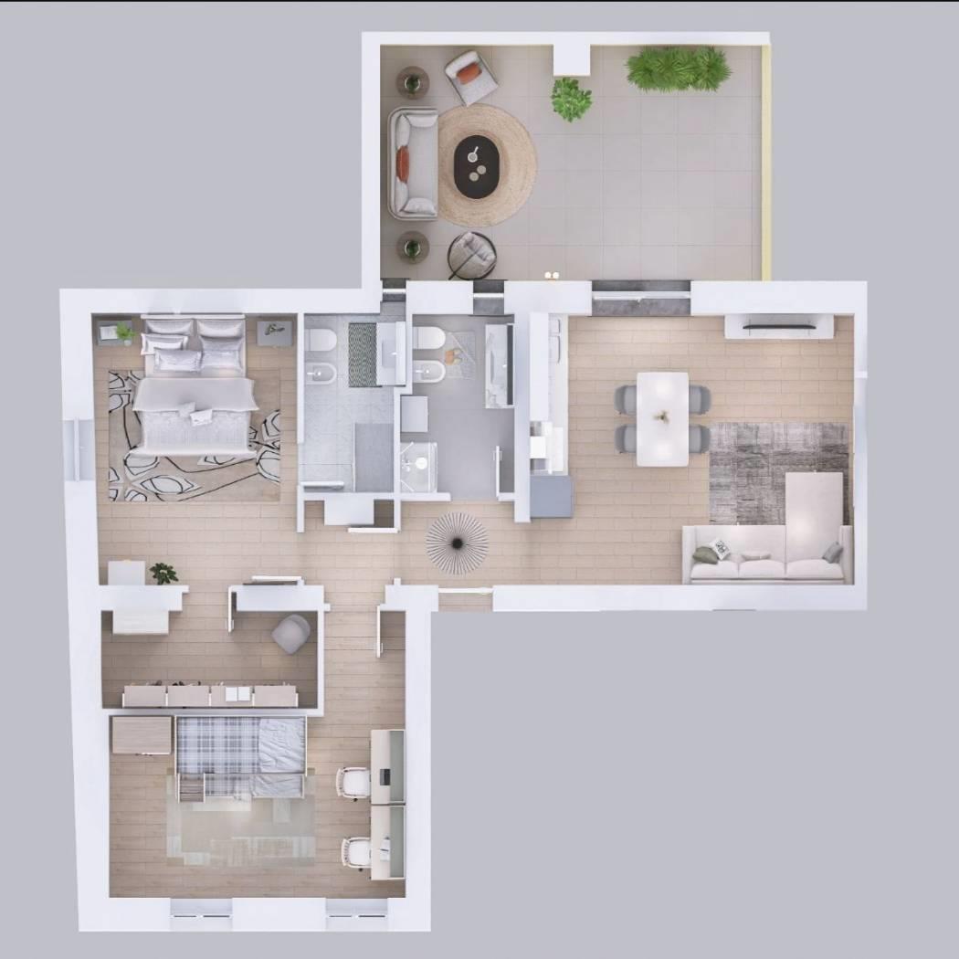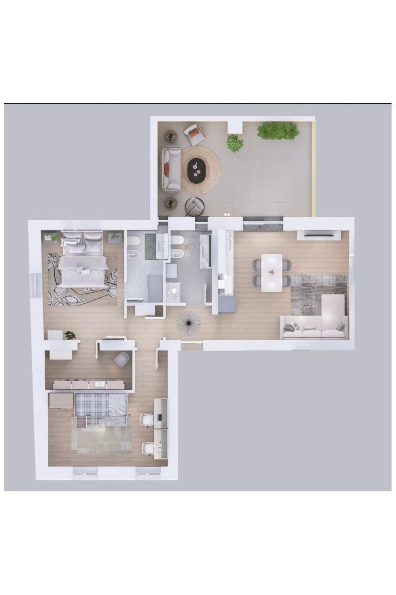 L'appartamento posto al primo piano, PRIVO di spese condominiali e ascensore, è così disposto: ingresso su disimpegno che conduce nelle varie aree, luminosa zona giorno con cucina a vista dalla quale si accede al terrazzo di 23 mq, dove poter passare giornate di sole in compagnia, proseguendo con il corridoio si giunge alla zona notte, dove troviamo primo bagno finestrato con box doccia, camera padronale con cabina armadio e bagno in camera sempre finestrato e con box doccia e per finire la seconda spaziosa camera da letto.