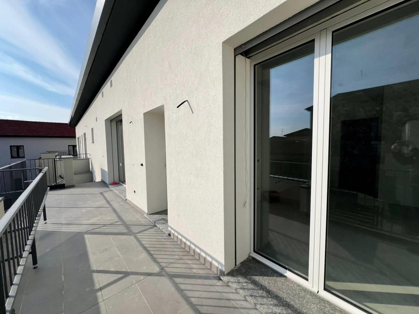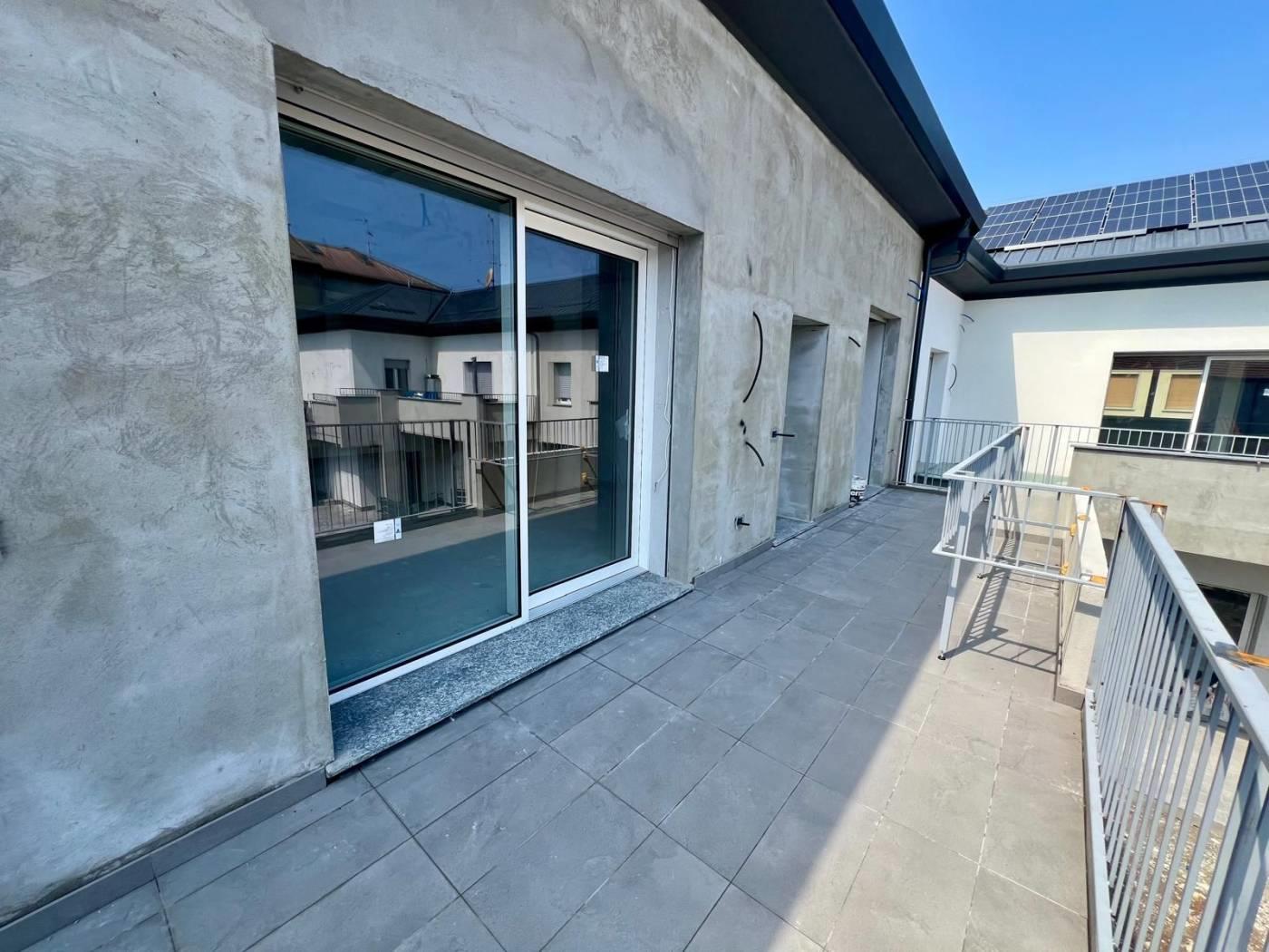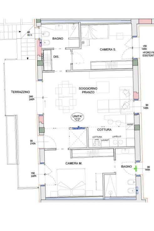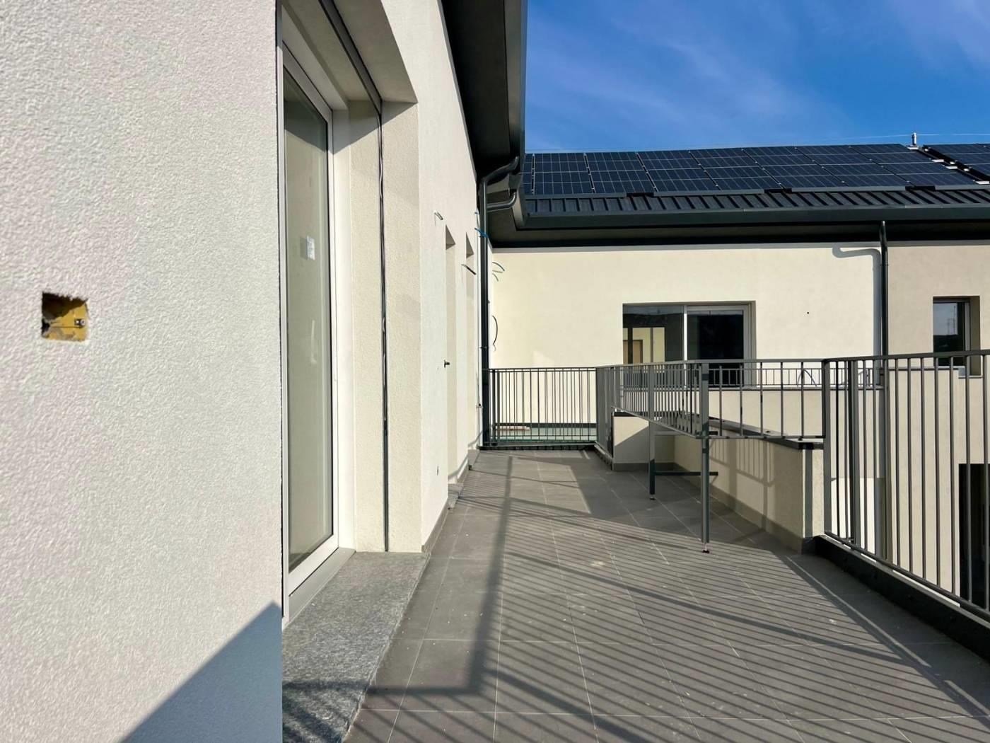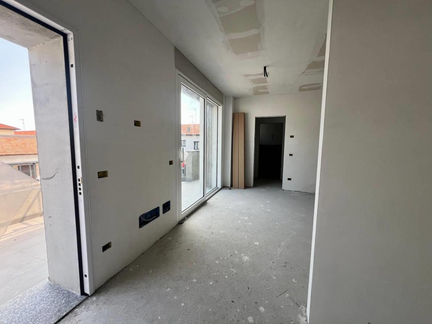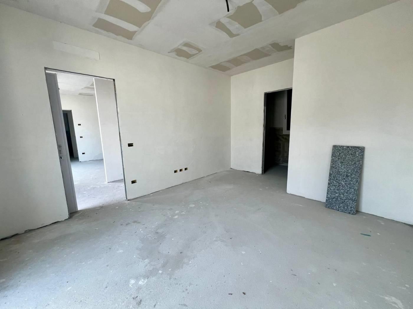 L’appartamento è composto da ingresso da terrazzo di 20 mq, ampio soggiorno con cucina a vista, disimpegno, camera matrimoniale con bagno, cameretta, ed un ulteriore bagno. La soluzione è collegata al sottotetto di altri 80 mq da rifinire con pavimentazione.
